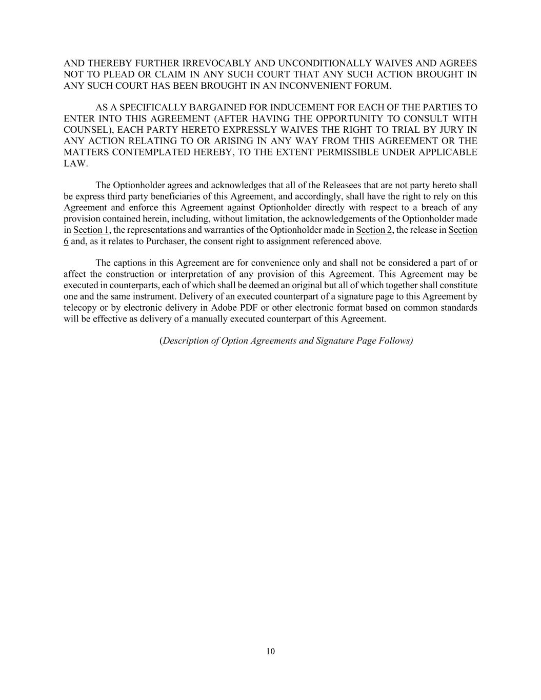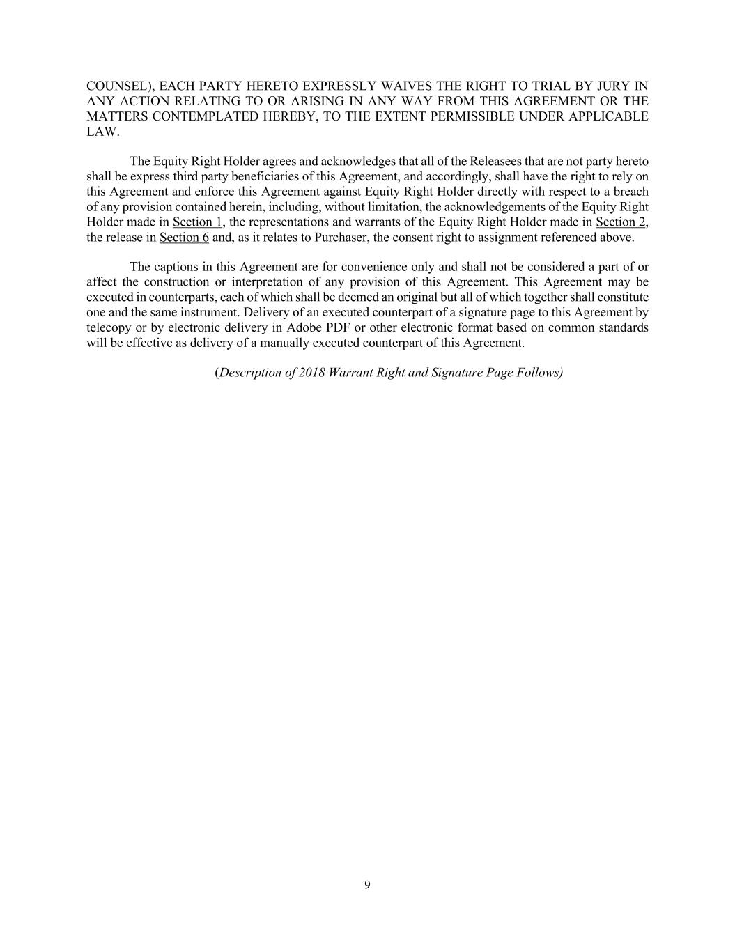 9 COUNSEL), EACH PARTY HERETO EXPRESSLY WAIVES THE RIGHT TO TRIAL BY JURY IN ANY ACTION RELATING TO OR ARISING IN ANY WAY FROM THIS AGREEMENT OR THE MATTERS CONTEMPLATED HEREBY, TO THE EXTENT PERMISSIBLE UNDER APPLICABLE LAW. The Equity Right Holder agrees and acknowledges that all of the Releasees that are not party hereto shall be express third party beneficiaries of this Agreement, and accordingly, shall have the right to rely on this Agreement and enforce this Agreement against Equity Right Holder directly with respect to a breach of any provision contained herein, including, without limitation, the acknowledgements of the Equity Right Holder made in Section 1, the representations and warrants of the Equity Right Holder made in Section 2, the release in Section 6 and, as it relates to Purchaser, the consent right to assignment referenced above. The captions in this Agreement are for convenience only and shall not be considered a part of or affect the construction or interpretation of any provision of this Agreement. This Agreement may be executed in counterparts, each of which shall be deemed an original but all of which together shall constitute one and the same instrument. Delivery of an executed counterpart of a signature page to this Agreement by telecopy or by electronic delivery in Adobe PDF or other electronic format based on common standards will be effective as delivery of a manually executed counterpart of this Agreement. (Description of 2018 Warrant Right and Signature Page Follows)