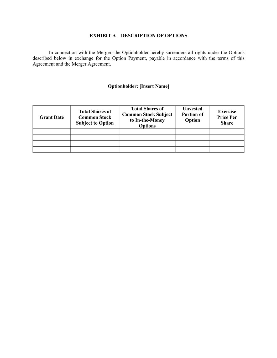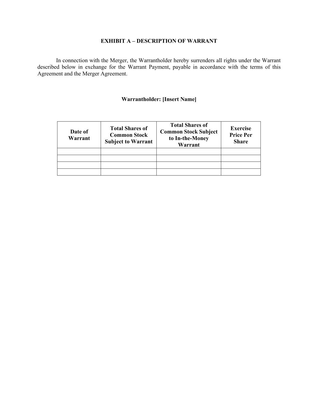 EXHIBIT A – DESCRIPTION OF WARRANT In connection with the Merger, the Warrantholder hereby surrenders all rights under the Warrant described below in exchange for the Warrant Payment, payable in accordance with the terms of this Agreement and the Merger Agreement. Warrantholder: [Insert Name] Date of Warrant Total Shares of Common Stock Subject to Warrant Total Shares of Common Stock Subject to In-the-Money Warrant Exercise Price Per Share