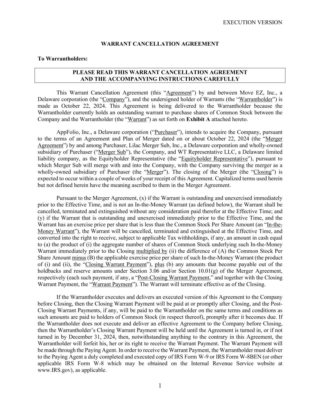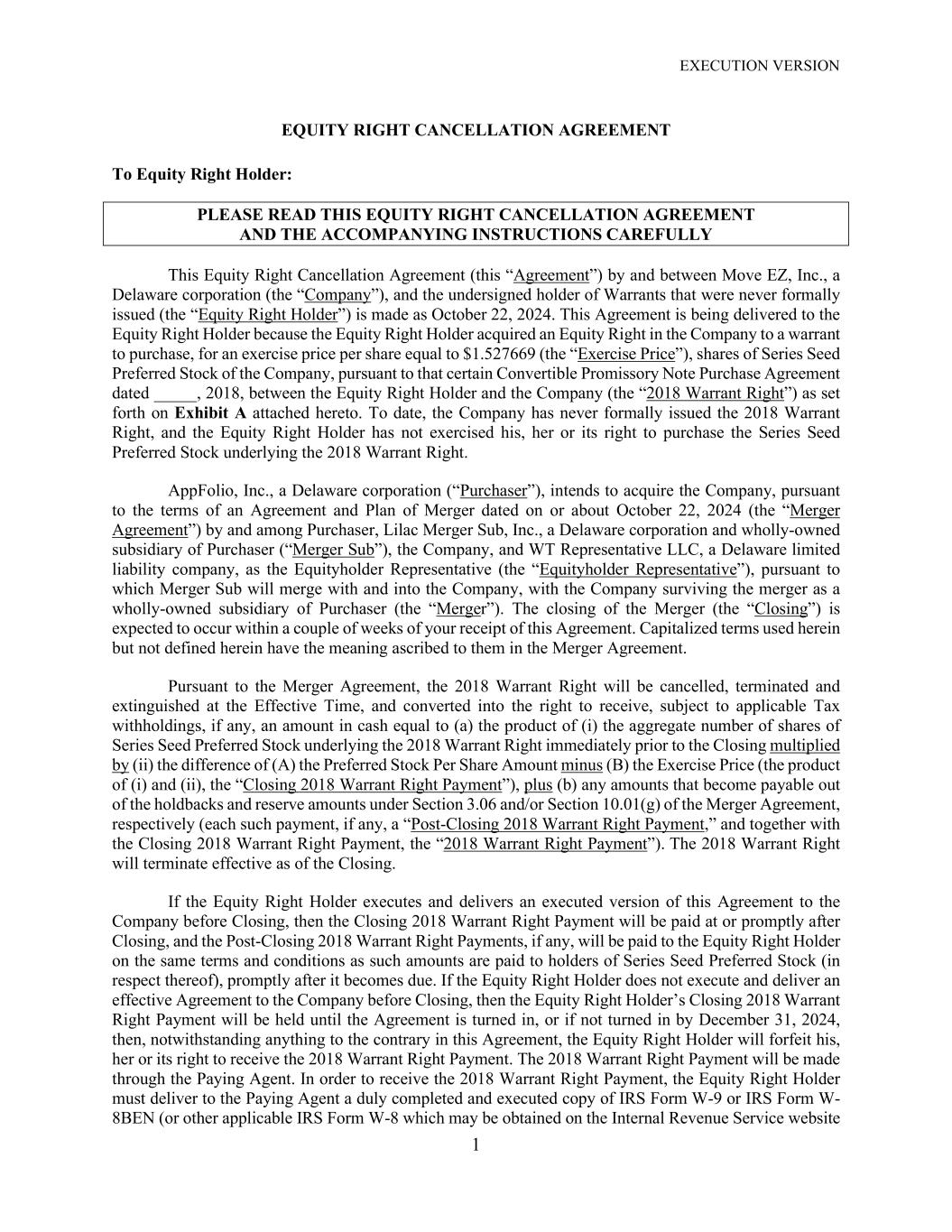 EXECUTION VERSION 1 EQUITY RIGHT CANCELLATION AGREEMENT To Equity Right Holder: PLEASE READ THIS EQUITY RIGHT CANCELLATION AGREEMENT AND THE ACCOMPANYING INSTRUCTIONS CAREFULLY This Equity Right Cancellation Agreement (this “Agreement”) by and between Move EZ, Inc., a Delaware corporation (the “Company”), and the undersigned holder of Warrants that were never formally issued (the “Equity Right Holder”) is made as October 22, 2024. This Agreement is being delivered to the Equity Right Holder because the Equity Right Holder acquired an Equity Right in the Company to a warrant to purchase, for an exercise price per share equal to $1.527669 (the “Exercise Price”), shares of Series Seed Preferred Stock of the Company, pursuant to that certain Convertible Promissory Note Purchase Agreement dated _____, 2018, between the Equity Right Holder and the Company (the “2018 Warrant Right”) as set forth on Exhibit A attached hereto. To date, the Company has never formally issued the 2018 Warrant Right, and the Equity Right Holder has not exercised his, her or its right to purchase the Series Seed Preferred Stock underlying the 2018 Warrant Right. AppFolio, Inc., a Delaware corporation (“Purchaser”), intends to acquire the Company, pursuant to the terms of an Agreement and Plan of Merger dated on or about October 22, 2024 (the “Merger Agreement”) by and among Purchaser, Lilac Merger Sub, Inc., a Delaware corporation and wholly-owned subsidiary of Purchaser (“Merger Sub”), the Company, and WT Representative LLC, a Delaware limited liability company, as the Equityholder Representative (the “Equityholder Representative”), pursuant to which Merger Sub will merge with and into the Company, with the Company surviving the merger as a wholly-owned subsidiary of Purchaser (the “Merger”). The closing of the Merger (the “Closing”) is expected to occur within a couple of weeks of your receipt of this Agreement. Capitalized terms used herein but not defined herein have the meaning ascribed to them in the Merger Agreement. Pursuant to the Merger Agreement, the 2018 Warrant Right will be cancelled, terminated and extinguished at the Effective Time, and converted into the right to receive, subject to applicable Tax withholdings, if any, an amount in cash equal to (a) the product of (i) the aggregate number of shares of Series Seed Preferred Stock underlying the 2018 Warrant Right immediately prior to the Closing multiplied by (ii) the difference of (A) the Preferred Stock Per Share Amount minus (B) the Exercise Price (the product of (i) and (ii), the “Closing 2018 Warrant Right Payment”), plus (b) any amounts that become payable out of the holdbacks and reserve amounts under Section 3.06 and/or Section 10.01(g) of the Merger Agreement, respectively (each such payment, if any, a “Post-Closing 2018 Warrant Right Payment,” and together with the Closing 2018 Warrant Right Payment, the “2018 Warrant Right Payment”). The 2018 Warrant Right will terminate effective as of the Closing. If the Equity Right Holder executes and delivers an executed version of this Agreement to the Company before Closing, then the Closing 2018 Warrant Right Payment will be paid at or promptly after Closing, and the Post-Closing 2018 Warrant Right Payments, if any, will be paid to the Equity Right Holder on the same terms and conditions as such amounts are paid to holders of Series Seed Preferred Stock (in respect thereof), promptly after it becomes due. If the Equity Right Holder does not execute and deliver an effective Agreement to the Company before Closing, then the Equity Right Holder’s Closing 2018 Warrant Right Payment will be held until the Agreement is turned in, or if not turned in by December 31, 2024, then, notwithstanding anything to the contrary in this Agreement, the Equity Right Holder will forfeit his, her or its right to receive the 2018 Warrant Right Payment. The 2018 Warrant Right Payment will be made through the Paying Agent. In order to receive the 2018 Warrant Right Payment, the Equity Right Holder must deliver to the Paying Agent a duly completed and executed copy of IRS Form W-9 or IRS Form W- 8BEN (or other applicable IRS Form W-8 which may be obtained on the Internal Revenue Service website