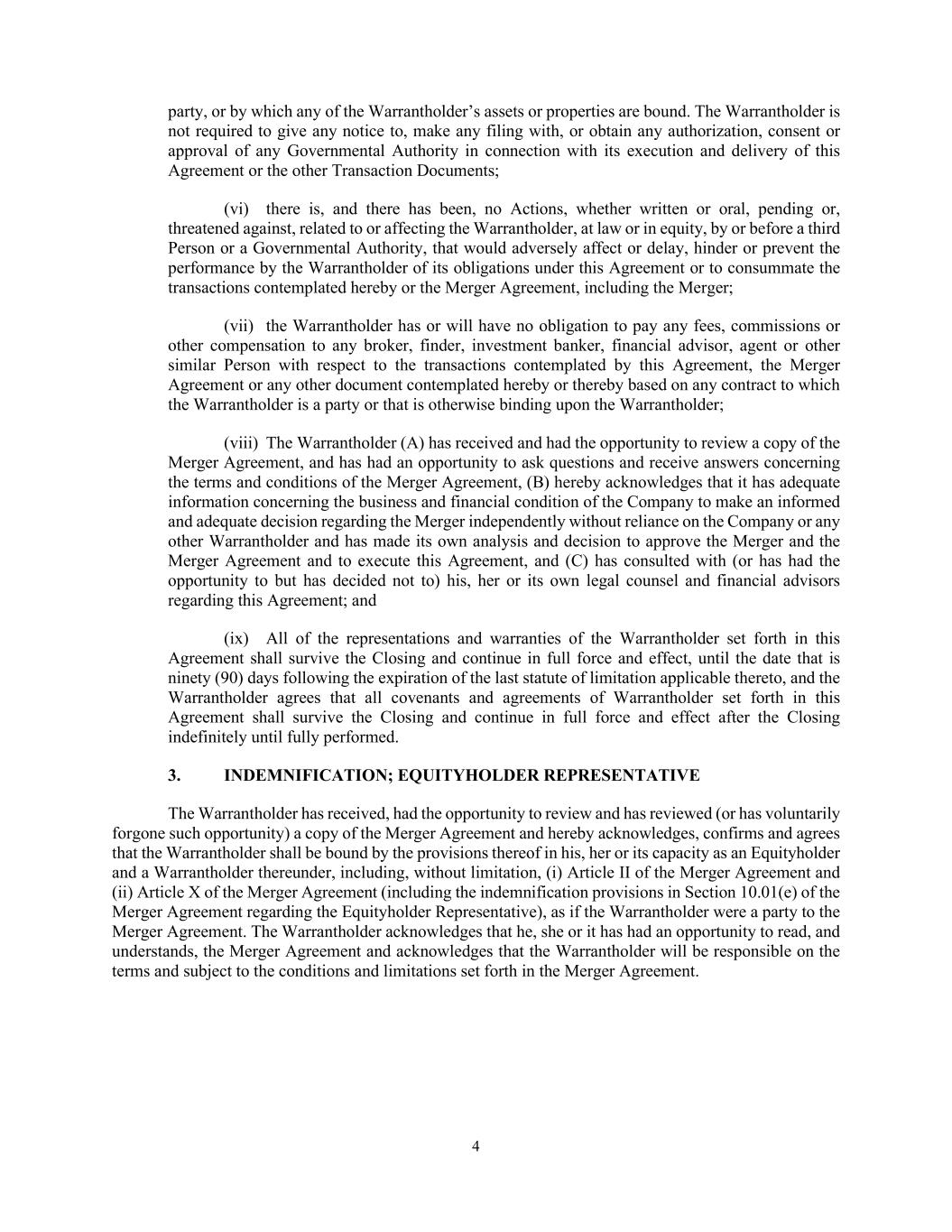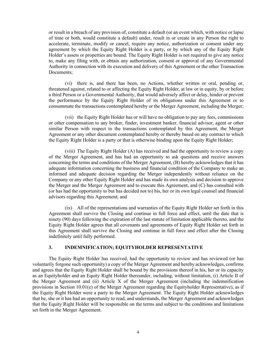4 or result in a breach of any provision of, constitute a default (or an event which, with notice or lapse of time or both, would constitute a default) under, result in or create in any Person the right to accelerate, terminate, modify or cancel, require any notice, authorization or consent under any agreement by which the Equity Right Holder is a party, or by which any of the Equity Right Holder’s assets or properties are bound. The Equity Right Holder is not required to give any notice to, make any filing with, or obtain any authorization, consent or approval of any Governmental Authority in connection with its execution and delivery of this Agreement or the other Transaction Documents; (vi) there is, and there has been, no Actions, whether written or oral, pending or, threatened against, related to or affecting the Equity Right Holder, at law or in equity, by or before a third Person or a Governmental Authority, that would adversely affect or delay, hinder or prevent the performance by the Equity Right Holder of its obligations under this Agreement or to consummate the transactions contemplated hereby or the Merger Agreement, including the Merger; (vii) the Equity Right Holder has or will have no obligation to pay any fees, commissions or other compensation to any broker, finder, investment banker, financial advisor, agent or other similar Person with respect to the transactions contemplated by this Agreement, the Merger Agreement or any other document contemplated hereby or thereby based on any contract to which the Equity Right Holder is a party or that is otherwise binding upon the Equity Right Holder; (viii) The Equity Right Holder (A) has received and had the opportunity to review a copy of the Merger Agreement, and has had an opportunity to ask questions and receive answers concerning the terms and conditions of the Merger Agreement, (B) hereby acknowledges that it has adequate information concerning the business and financial condition of the Company to make an informed and adequate decision regarding the Merger independently without reliance on the Company or any other Equity Right Holder and has made its own analysis and decision to approve the Merger and the Merger Agreement and to execute this Agreement, and (C) has consulted with (or has had the opportunity to but has decided not to) his, her or its own legal counsel and financial advisors regarding this Agreement; and (ix) All of the representations and warranties of the Equity Right Holder set forth in this Agreement shall survive the Closing and continue in full force and effect, until the date that is ninety (90) days following the expiration of the last statute of limitation applicable thereto, and the Equity Right Holder agrees that all covenants and agreements of Equity Right Holder set forth in this Agreement shall survive the Closing and continue in full force and effect after the Closing indefinitely until fully performed. 3. INDEMNIFICATION; EQUITYHOLDER REPRESENTATIVE The Equity Right Holder has received, had the opportunity to review and has reviewed (or has voluntarily forgone such opportunity) a copy of the Merger Agreement and hereby acknowledges, confirms and agrees that the Equity Right Holder shall be bound by the provisions thereof in his, her or its capacity as an Equityholder and an Equity Right Holder thereunder, including, without limitation, (i) Article II of the Merger Agreement and (ii) Article X of the Merger Agreement (including the indemnification provisions in Section 10.01(e) of the Merger Agreement regarding the Equityholder Representative), as if the Equity Right Holder were a party to the Merger Agreement. The Equity Right Holder acknowledges that he, she or it has had an opportunity to read, and understands, the Merger Agreement and acknowledges that the Equity Right Holder will be responsible on the terms and subject to the conditions and limitations set forth in the Merger Agreement.