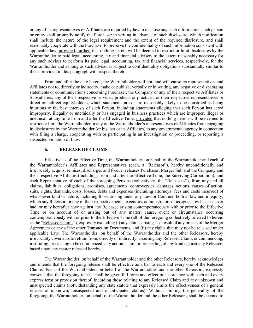 6 or any of its representatives or Affiliates are required by law to disclose any such information, such person or entity shall promptly notify the Purchaser in writing in advance of such disclosure, which notification shall include the nature of the legal requirement and the extent of the required disclosure, and shall reasonably cooperate with the Purchaser to preserve the confidentiality of such information consistent with applicable law; provided, further, that nothing herein will be deemed to restrict or limit disclosures by the Warrantholder to paid legal, accounting, tax and financial advisers to the extent reasonably necessary for any such adviser to perform its paid legal, accounting, tax and financial services, respectively, for the Warrantholder and as long as such advisor is subject to confidentiality obligations substantially similar to those provided in this paragraph with respect thereto. From and after the date hereof, the Warrantholder will not, and will cause its representatives and Affiliates not to, directly or indirectly, make or publish, verbally or in writing, any negative or disparaging statements or communications concerning Purchaser, the Company or any of their respective Affiliates or Subsidiaries, any of their respective services, products or practices, or their respective representatives or direct or indirect equityholders, which statements are or are reasonably likely to be construed as being injurious to the best interests of such Person, including statements alleging that such Person has acted improperly, illegally or unethically or has engaged in business practices which are improper, illegal or unethical, at any time from and after the Effective Time; provided that nothing herein will be deemed to restrict or limit the Warrantholder or any of the Warrantholder’s representatives or Affiliates from engaging in disclosures by the Warrantholder (or his, her or its Affiliates) to any governmental agency in connection with filing a charge, cooperating with or participating in an investigation or proceeding, or reporting a suspected violation of Law. 6. RELEASE OF CLAIMS Effective as of the Effective Time, the Warrantholder, on behalf of the Warrantholder and each of the Warrantholder’s Affiliates and Representatives (each, a “Releasor”), hereby unconditionally and irrevocably acquits, remises, discharges and forever releases Purchaser, Merger Sub and the Company and their respective Affiliates (including, from and after the Effective Time, the Surviving Corporation), and each Representative of each of the foregoing Persons (collectively, the “Releasees”), from any and all claims, liabilities, obligations, promises, agreements, controversies, damages, actions, causes of action, suits, rights, demands, costs, losses, debts and expenses (including attorneys’ fees and costs incurred) of whatsoever kind or nature, including those arising under any Law or Contract, both at law and in equity, which any Releasor, or any of their respective heirs, executors, administrators or assigns, now has, has ever had, or may hereafter have against any Releasee arising contemporaneously with or prior to the Effective Time or on account of or arising out of any matter, cause, event or circumstance occurring contemporaneously with or prior to the Effective Time (all of the foregoing collectively referred to herein as the “Released Claims”), expressly excluding (i) any claims arising as a result of any breach of the Merger Agreement or any of the other Transaction Documents, and (ii) any rights that may not be released under applicable Law. The Warrantholder, on behalf of the Warrantholder and the other Releasors, hereby irrevocably covenants to refrain from, directly or indirectly, asserting any Released Claim, or commencing, instituting, or causing to be commenced, any action, claim or proceeding of any kind against any Releasee, based upon any matter released hereby. The Warrantholder, on behalf of the Warrantholder and the other Releasors, hereby acknowledges and intends that the foregoing release shall be effective as a bar to each and every one of the Released Claims. Each of the Warrantholder, on behalf of the Warrantholder and the other Releasors, expressly consents that the foregoing release shall be given full force and effect in accordance with each and every express term or provision thereof, including those relating to any Released Claim and any unknown and unsuspected claims (notwithstanding any state statute that expressly limits the effectiveness of a general release of unknown, unsuspected and unanticipated claims). Without limiting the generality of the foregoing, the Warrantholder, on behalf of the Warrantholder and the other Releasors, shall be deemed to
