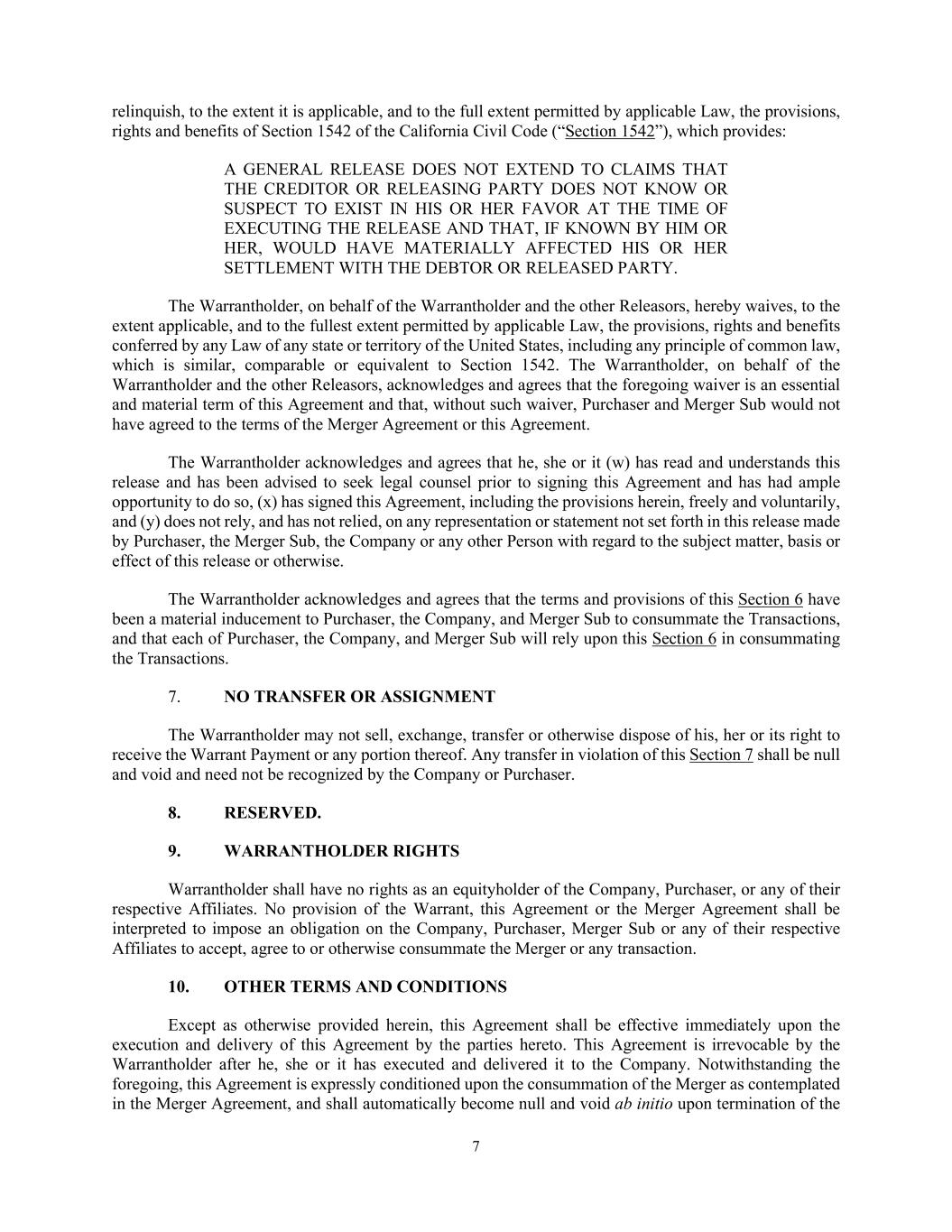 7 relinquish, to the extent it is applicable, and to the full extent permitted by applicable Law, the provisions, rights and benefits of Section 1542 of the California Civil Code (“Section 1542”), which provides: A GENERAL RELEASE DOES NOT EXTEND TO CLAIMS THAT THE CREDITOR OR RELEASING PARTY DOES NOT KNOW OR SUSPECT TO EXIST IN HIS OR HER FAVOR AT THE TIME OF EXECUTING THE RELEASE AND THAT, IF KNOWN BY HIM OR HER, WOULD HAVE MATERIALLY AFFECTED HIS OR HER SETTLEMENT WITH THE DEBTOR OR RELEASED PARTY. The Warrantholder, on behalf of the Warrantholder and the other Releasors, hereby waives, to the extent applicable, and to the fullest extent permitted by applicable Law, the provisions, rights and benefits conferred by any Law of any state or territory of the United States, including any principle of common law, which is similar, comparable or equivalent to Section 1542. The Warrantholder, on behalf of the Warrantholder and the other Releasors, acknowledges and agrees that the foregoing waiver is an essential and material term of this Agreement and that, without such waiver, Purchaser and Merger Sub would not have agreed to the terms of the Merger Agreement or this Agreement. The Warrantholder acknowledges and agrees that he, she or it (w) has read and understands this release and has been advised to seek legal counsel prior to signing this Agreement and has had ample opportunity to do so, (x) has signed this Agreement, including the provisions herein, freely and voluntarily, and (y) does not rely, and has not relied, on any representation or statement not set forth in this release made by Purchaser, the Merger Sub, the Company or any other Person with regard to the subject matter, basis or effect of this release or otherwise. The Warrantholder acknowledges and agrees that the terms and provisions of this Section 6 have been a material inducement to Purchaser, the Company, and Merger Sub to consummate the Transactions, and that each of Purchaser, the Company, and Merger Sub will rely upon this Section 6 in consummating the Transactions. 7. NO TRANSFER OR ASSIGNMENT The Warrantholder may not sell, exchange, transfer or otherwise dispose of his, her or its right to receive the Warrant Payment or any portion thereof. Any transfer in violation of this Section 7 shall be null and void and need not be recognized by the Company or Purchaser. 8. RESERVED. 9. WARRANTHOLDER RIGHTS Warrantholder shall have no rights as an equityholder of the Company, Purchaser, or any of their respective Affiliates. No provision of the Warrant, this Agreement or the Merger Agreement shall be interpreted to impose an obligation on the Company, Purchaser, Merger Sub or any of their respective Affiliates to accept, agree to or otherwise consummate the Merger or any transaction. 10. OTHER TERMS AND CONDITIONS Except as otherwise provided herein, this Agreement shall be effective immediately upon the execution and delivery of this Agreement by the parties hereto. This Agreement is irrevocable by the Warrantholder after he, she or it has executed and delivered it to the Company. Notwithstanding the foregoing, this Agreement is expressly conditioned upon the consummation of the Merger as contemplated in the Merger Agreement, and shall automatically become null and void ab initio upon termination of the