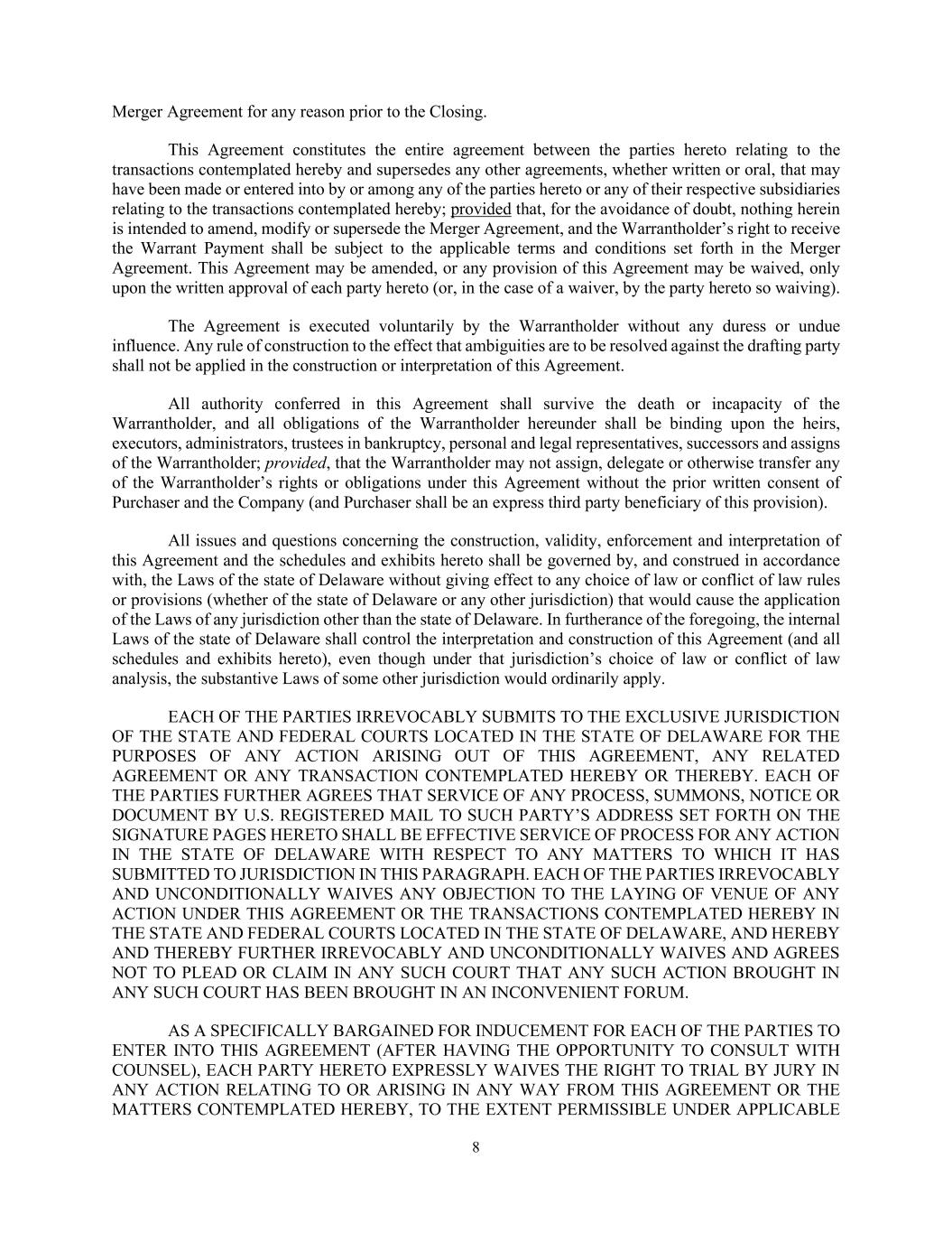8 Merger Agreement for any reason prior to the Closing. This Agreement constitutes the entire agreement between the parties hereto relating to the transactions contemplated hereby and supersedes any other agreements, whether written or oral, that may have been made or entered into by or among any of the parties hereto or any of their respective subsidiaries relating to the transactions contemplated hereby; provided that, for the avoidance of doubt, nothing herein is intended to amend, modify or supersede the Merger Agreement, and the Warrantholder’s right to receive the Warrant Payment shall be subject to the applicable terms and conditions set forth in the Merger Agreement. This Agreement may be amended, or any provision of this Agreement may be waived, only upon the written approval of each party hereto (or, in the case of a waiver, by the party hereto so waiving). The Agreement is executed voluntarily by the Warrantholder without any duress or undue influence. Any rule of construction to the effect that ambiguities are to be resolved against the drafting party shall not be applied in the construction or interpretation of this Agreement. All authority conferred in this Agreement shall survive the death or incapacity of the Warrantholder, and all obligations of the Warrantholder hereunder shall be binding upon the heirs, executors, administrators, trustees in bankruptcy, personal and legal representatives, successors and assigns of the Warrantholder; provided, that the Warrantholder may not assign, delegate or otherwise transfer any of the Warrantholder’s rights or obligations under this Agreement without the prior written consent of Purchaser and the Company (and Purchaser shall be an express third party beneficiary of this provision). All issues and questions concerning the construction, validity, enforcement and interpretation of this Agreement and the schedules and exhibits hereto shall be governed by, and construed in accordance with, the Laws of the state of Delaware without giving effect to any choice of law or conflict of law rules or provisions (whether of the state of Delaware or any other jurisdiction) that would cause the application of the Laws of any jurisdiction other than the state of Delaware. In furtherance of the foregoing, the internal Laws of the state of Delaware shall control the interpretation and construction of this Agreement (and all schedules and exhibits hereto), even though under that jurisdiction’s choice of law or conflict of law analysis, the substantive Laws of some other jurisdiction would ordinarily apply. EACH OF THE PARTIES IRREVOCABLY SUBMITS TO THE EXCLUSIVE JURISDICTION OF THE STATE AND FEDERAL COURTS LOCATED IN THE STATE OF DELAWARE FOR THE PURPOSES OF ANY ACTION ARISING OUT OF THIS AGREEMENT, ANY RELATED AGREEMENT OR ANY TRANSACTION CONTEMPLATED HEREBY OR THEREBY. EACH OF THE PARTIES FURTHER AGREES THAT SERVICE OF ANY PROCESS, SUMMONS, NOTICE OR DOCUMENT BY U.S. REGISTERED MAIL TO SUCH PARTY’S ADDRESS SET FORTH ON THE SIGNATURE PAGES HERETO SHALL BE EFFECTIVE SERVICE OF PROCESS FOR ANY ACTION IN THE STATE OF DELAWARE WITH RESPECT TO ANY MATTERS TO WHICH IT HAS SUBMITTED TO JURISDICTION IN THIS PARAGRAPH. EACH OF THE PARTIES IRREVOCABLY AND UNCONDITIONALLY WAIVES ANY OBJECTION TO THE LAYING OF VENUE OF ANY ACTION UNDER THIS AGREEMENT OR THE TRANSACTIONS CONTEMPLATED HEREBY IN THE STATE AND FEDERAL COURTS LOCATED IN THE STATE OF DELAWARE, AND HEREBY AND THEREBY FURTHER IRREVOCABLY AND UNCONDITIONALLY WAIVES AND AGREES NOT TO PLEAD OR CLAIM IN ANY SUCH COURT THAT ANY SUCH ACTION BROUGHT IN ANY SUCH COURT HAS BEEN BROUGHT IN AN INCONVENIENT FORUM. AS A SPECIFICALLY BARGAINED FOR INDUCEMENT FOR EACH OF THE PARTIES TO ENTER INTO THIS AGREEMENT (AFTER HAVING THE OPPORTUNITY TO CONSULT WITH COUNSEL), EACH PARTY HERETO EXPRESSLY WAIVES THE RIGHT TO TRIAL BY JURY IN ANY ACTION RELATING TO OR ARISING IN ANY WAY FROM THIS AGREEMENT OR THE MATTERS CONTEMPLATED HEREBY, TO THE EXTENT PERMISSIBLE UNDER APPLICABLE