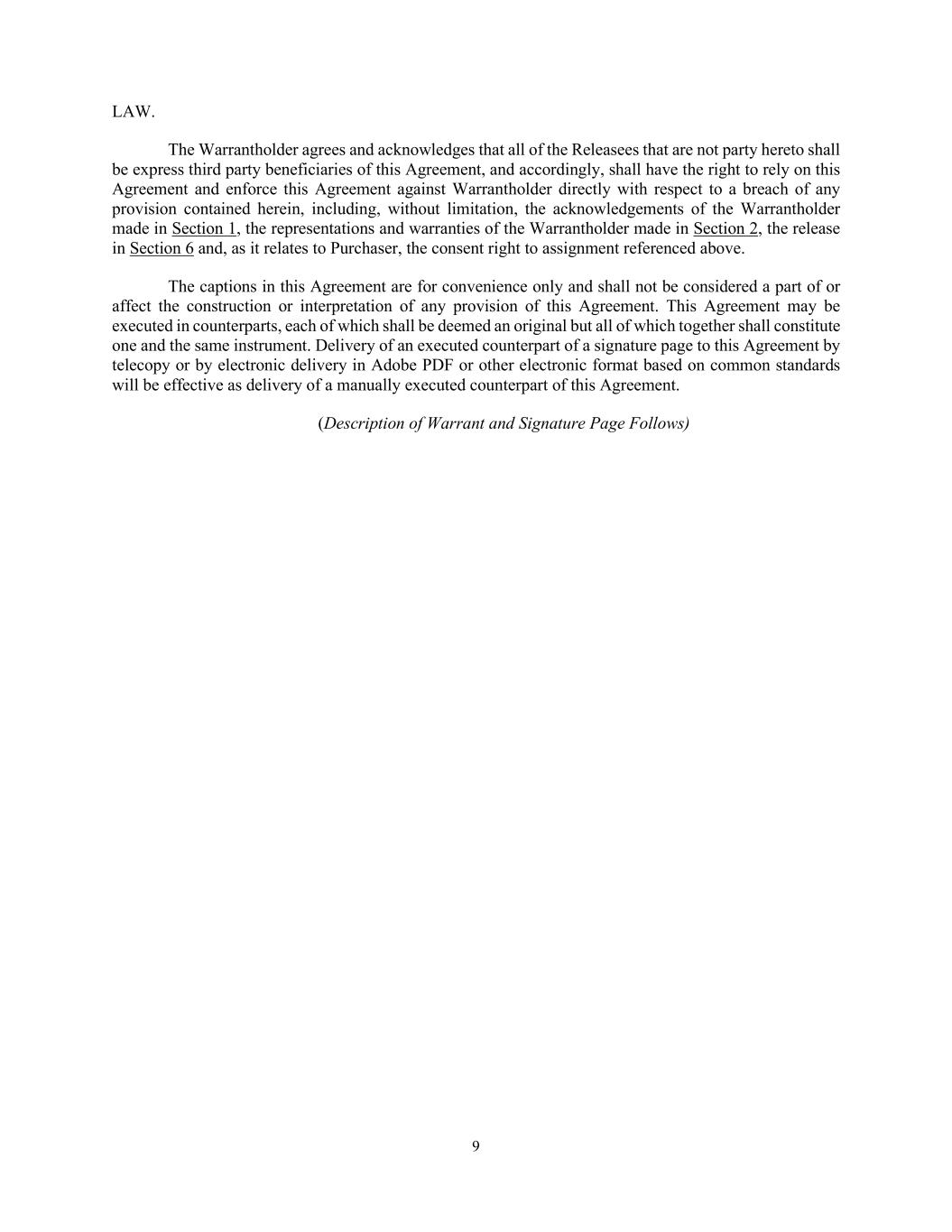 9 LAW. The Warrantholder agrees and acknowledges that all of the Releasees that are not party hereto shall be express third party beneficiaries of this Agreement, and accordingly, shall have the right to rely on this Agreement and enforce this Agreement against Warrantholder directly with respect to a breach of any provision contained herein, including, without limitation, the acknowledgements of the Warrantholder made in Section 1, the representations and warranties of the Warrantholder made in Section 2, the release in Section 6 and, as it relates to Purchaser, the consent right to assignment referenced above. The captions in this Agreement are for convenience only and shall not be considered a part of or affect the construction or interpretation of any provision of this Agreement. This Agreement may be executed in counterparts, each of which shall be deemed an original but all of which together shall constitute one and the same instrument. Delivery of an executed counterpart of a signature page to this Agreement by telecopy or by electronic delivery in Adobe PDF or other electronic format based on common standards will be effective as delivery of a manually executed counterpart of this Agreement. (Description of Warrant and Signature Page Follows)