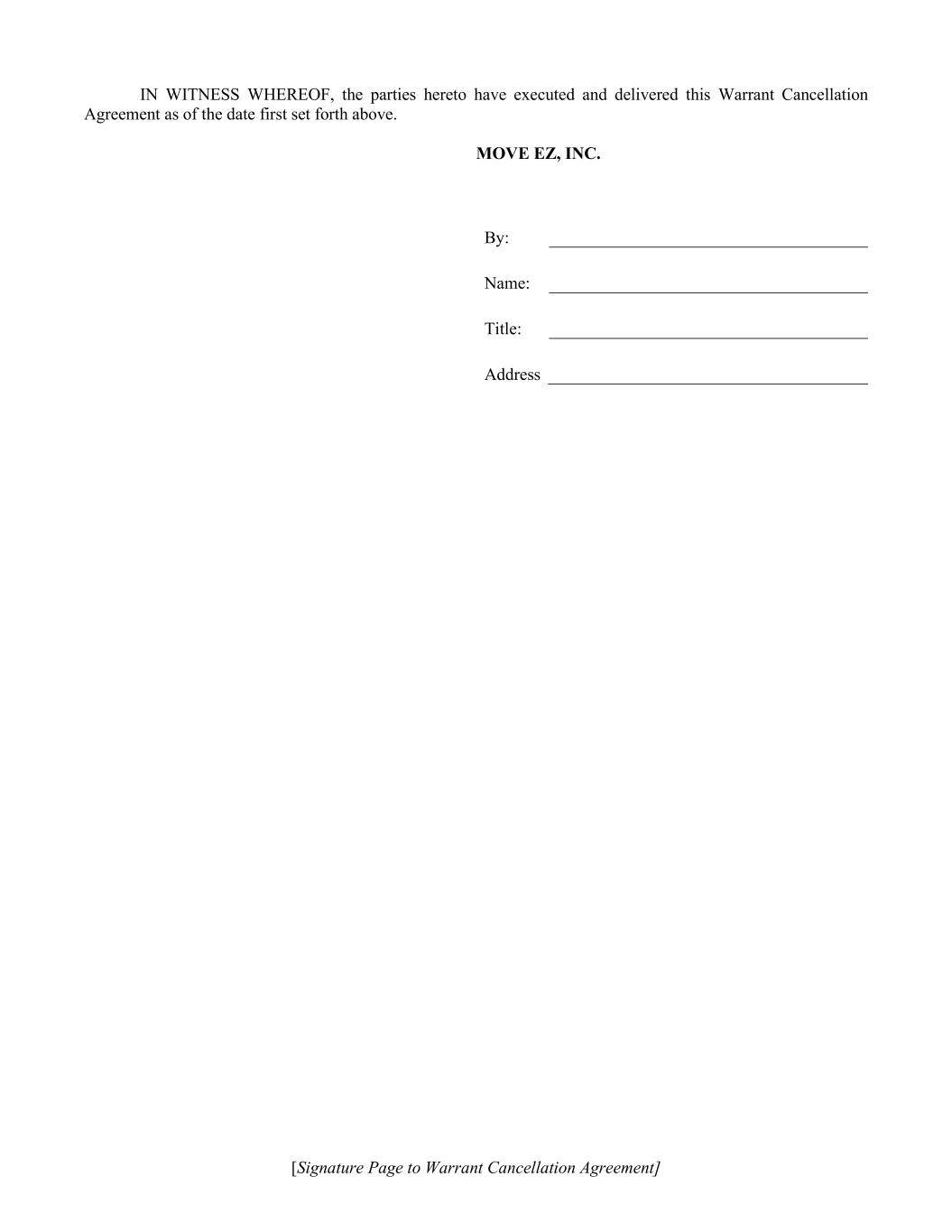 [Signature Page to Warrant Cancellation Agreement] IN WITNESS WHEREOF, the parties hereto have executed and delivered this Warrant Cancellation Agreement as of the date first set forth above. MOVE EZ, INC. By: Name: Title: Address