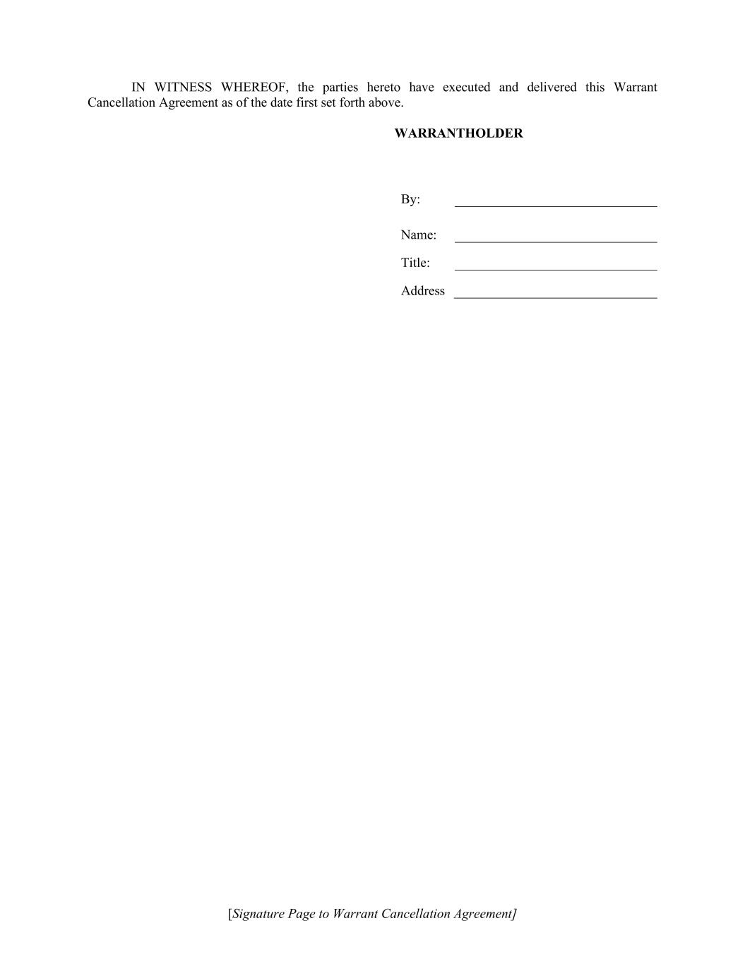 [Signature Page to Warrant Cancellation Agreement] IN WITNESS WHEREOF, the parties hereto have executed and delivered this Warrant Cancellation Agreement as of the date first set forth above. WARRANTHOLDER By: Name: Title: Address