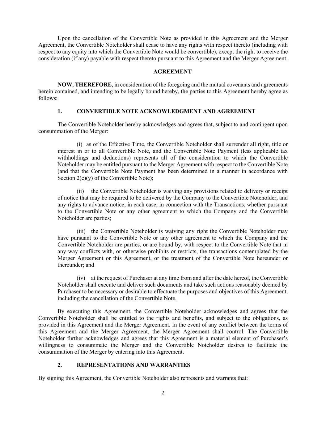 2 Upon the cancellation of the Convertible Note as provided in this Agreement and the Merger Agreement, the Convertible Noteholder shall cease to have any rights with respect thereto (including with respect to any equity into which the Convertible Note would be convertible), except the right to receive the consideration (if any) payable with respect thereto pursuant to this Agreement and the Merger Agreement. AGREEMENT NOW, THEREFORE, in consideration of the foregoing and the mutual covenants and agreements herein contained, and intending to be legally bound hereby, the parties to this Agreement hereby agree as follows: 1. CONVERTIBLE NOTE ACKNOWLEDGMENT AND AGREEMENT The Convertible Noteholder hereby acknowledges and agrees that, subject to and contingent upon consummation of the Merger: (i) as of the Effective Time, the Convertible Noteholder shall surrender all right, title or interest in or to all Convertible Note, and the Convertible Note Payment (less applicable tax withholdings and deductions) represents all of the consideration to which the Convertible Noteholder may be entitled pursuant to the Merger Agreement with respect to the Convertible Note (and that the Convertible Note Payment has been determined in a manner in accordance with Section 2(c)(y) of the Convertible Note); (ii) the Convertible Noteholder is waiving any provisions related to delivery or receipt of notice that may be required to be delivered by the Company to the Convertible Noteholder, and any rights to advance notice, in each case, in connection with the Transactions, whether pursuant to the Convertible Note or any other agreement to which the Company and the Convertible Noteholder are parties; (iii) the Convertible Noteholder is waiving any right the Convertible Noteholder may have pursuant to the Convertible Note or any other agreement to which the Company and the Convertible Noteholder are parties, or are bound by, with respect to the Convertible Note that in any way conflicts with, or otherwise prohibits or restricts, the transactions contemplated by the Merger Agreement or this Agreement, or the treatment of the Convertible Note hereunder or thereunder; and (iv) at the request of Purchaser at any time from and after the date hereof, the Convertible Noteholder shall execute and deliver such documents and take such actions reasonably deemed by Purchaser to be necessary or desirable to effectuate the purposes and objectives of this Agreement, including the cancellation of the Convertible Note. By executing this Agreement, the Convertible Noteholder acknowledges and agrees that the Convertible Noteholder shall be entitled to the rights and benefits, and subject to the obligations, as provided in this Agreement and the Merger Agreement. In the event of any conflict between the terms of this Agreement and the Merger Agreement, the Merger Agreement shall control. The Convertible Noteholder further acknowledges and agrees that this Agreement is a material element of Purchaser’s willingness to consummate the Merger and the Convertible Noteholder desires to facilitate the consummation of the Merger by entering into this Agreement. 2. REPRESENTATIONS AND WARRANTIES By signing this Agreement, the Convertible Noteholder also represents and warrants that: