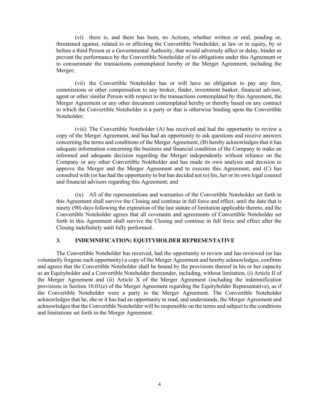 4 (vi) there is, and there has been, no Actions, whether written or oral, pending or, threatened against, related to or affecting the Convertible Noteholder, at law or in equity, by or before a third Person or a Governmental Authority, that would adversely affect or delay, hinder or prevent the performance by the Convertible Noteholder of its obligations under this Agreement or to consummate the transactions contemplated hereby or the Merger Agreement, including the Merger; (vii) the Convertible Noteholder has or will have no obligation to pay any fees, commissions or other compensation to any broker, finder, investment banker, financial advisor, agent or other similar Person with respect to the transactions contemplated by this Agreement, the Merger Agreement or any other document contemplated hereby or thereby based on any contract to which the Convertible Noteholder is a party or that is otherwise binding upon the Convertible Noteholder; (viii) The Convertible Noteholder (A) has received and had the opportunity to review a copy of the Merger Agreement, and has had an opportunity to ask questions and receive answers concerning the terms and conditions of the Merger Agreement, (B) hereby acknowledges that it has adequate information concerning the business and financial condition of the Company to make an informed and adequate decision regarding the Merger independently without reliance on the Company or any other Convertible Noteholder and has made its own analysis and decision to approve the Merger and the Merger Agreement and to execute this Agreement, and (C) has consulted with (or has had the opportunity to but has decided not to) his, her or its own legal counsel and financial advisors regarding this Agreement; and (ix) All of the representations and warranties of the Convertible Noteholder set forth in this Agreement shall survive the Closing and continue in full force and effect, until the date that is ninety (90) days following the expiration of the last statute of limitation applicable thereto, and the Convertible Noteholder agrees that all covenants and agreements of Convertible Noteholder set forth in this Agreement shall survive the Closing and continue in full force and effect after the Closing indefinitely until fully performed. 3. INDEMNIFICATION; EQUITYHOLDER REPRESENTATIVE The Convertible Noteholder has received, had the opportunity to review and has reviewed (or has voluntarily forgone such opportunity) a copy of the Merger Agreement and hereby acknowledges, confirms and agrees that the Convertible Noteholder shall be bound by the provisions thereof in his or her capacity as an Equityholder and a Convertible Noteholder thereunder, including, without limitation, (i) Article II of the Merger Agreement and (ii) Article X of the Merger Agreement (including the indemnification provisions in Section 10.01(e) of the Merger Agreement regarding the Equityholder Representative), as if the Convertible Noteholder were a party to the Merger Agreement. The Convertible Noteholder acknowledges that he, she or it has had an opportunity to read, and understands, the Merger Agreement and acknowledges that the Convertible Noteholder will be responsible on the terms and subject to the conditions and limitations set forth in the Merger Agreement.