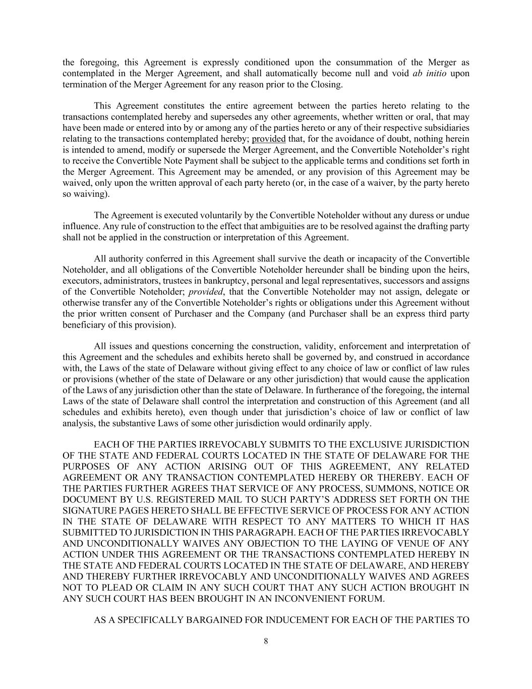 8 the foregoing, this Agreement is expressly conditioned upon the consummation of the Merger as contemplated in the Merger Agreement, and shall automatically become null and void ab initio upon termination of the Merger Agreement for any reason prior to the Closing. This Agreement constitutes the entire agreement between the parties hereto relating to the transactions contemplated hereby and supersedes any other agreements, whether written or oral, that may have been made or entered into by or among any of the parties hereto or any of their respective subsidiaries relating to the transactions contemplated hereby; provided that, for the avoidance of doubt, nothing herein is intended to amend, modify or supersede the Merger Agreement, and the Convertible Noteholder’s right to receive the Convertible Note Payment shall be subject to the applicable terms and conditions set forth in the Merger Agreement. This Agreement may be amended, or any provision of this Agreement may be waived, only upon the written approval of each party hereto (or, in the case of a waiver, by the party hereto so waiving). The Agreement is executed voluntarily by the Convertible Noteholder without any duress or undue influence. Any rule of construction to the effect that ambiguities are to be resolved against the drafting party shall not be applied in the construction or interpretation of this Agreement. All authority conferred in this Agreement shall survive the death or incapacity of the Convertible Noteholder, and all obligations of the Convertible Noteholder hereunder shall be binding upon the heirs, executors, administrators, trustees in bankruptcy, personal and legal representatives, successors and assigns of the Convertible Noteholder; provided, that the Convertible Noteholder may not assign, delegate or otherwise transfer any of the Convertible Noteholder’s rights or obligations under this Agreement without the prior written consent of Purchaser and the Company (and Purchaser shall be an express third party beneficiary of this provision). All issues and questions concerning the construction, validity, enforcement and interpretation of this Agreement and the schedules and exhibits hereto shall be governed by, and construed in accordance with, the Laws of the state of Delaware without giving effect to any choice of law or conflict of law rules or provisions (whether of the state of Delaware or any other jurisdiction) that would cause the application of the Laws of any jurisdiction other than the state of Delaware. In furtherance of the foregoing, the internal Laws of the state of Delaware shall control the interpretation and construction of this Agreement (and all schedules and exhibits hereto), even though under that jurisdiction’s choice of law or conflict of law analysis, the substantive Laws of some other jurisdiction would ordinarily apply. EACH OF THE PARTIES IRREVOCABLY SUBMITS TO THE EXCLUSIVE JURISDICTION OF THE STATE AND FEDERAL COURTS LOCATED IN THE STATE OF DELAWARE FOR THE PURPOSES OF ANY ACTION ARISING OUT OF THIS AGREEMENT, ANY RELATED AGREEMENT OR ANY TRANSACTION CONTEMPLATED HEREBY OR THEREBY. EACH OF THE PARTIES FURTHER AGREES THAT SERVICE OF ANY PROCESS, SUMMONS, NOTICE OR DOCUMENT BY U.S. REGISTERED MAIL TO SUCH PARTY’S ADDRESS SET FORTH ON THE SIGNATURE PAGES HERETO SHALL BE EFFECTIVE SERVICE OF PROCESS FOR ANY ACTION IN THE STATE OF DELAWARE WITH RESPECT TO ANY MATTERS TO WHICH IT HAS SUBMITTED TO JURISDICTION IN THIS PARAGRAPH. EACH OF THE PARTIES IRREVOCABLY AND UNCONDITIONALLY WAIVES ANY OBJECTION TO THE LAYING OF VENUE OF ANY ACTION UNDER THIS AGREEMENT OR THE TRANSACTIONS CONTEMPLATED HEREBY IN THE STATE AND FEDERAL COURTS LOCATED IN THE STATE OF DELAWARE, AND HEREBY AND THEREBY FURTHER IRREVOCABLY AND UNCONDITIONALLY WAIVES AND AGREES NOT TO PLEAD OR CLAIM IN ANY SUCH COURT THAT ANY SUCH ACTION BROUGHT IN ANY SUCH COURT HAS BEEN BROUGHT IN AN INCONVENIENT FORUM. AS A SPECIFICALLY BARGAINED FOR INDUCEMENT FOR EACH OF THE PARTIES TO
