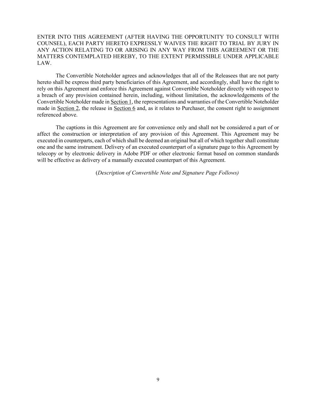 9 ENTER INTO THIS AGREEMENT (AFTER HAVING THE OPPORTUNITY TO CONSULT WITH COUNSEL), EACH PARTY HERETO EXPRESSLY WAIVES THE RIGHT TO TRIAL BY JURY IN ANY ACTION RELATING TO OR ARISING IN ANY WAY FROM THIS AGREEMENT OR THE MATTERS CONTEMPLATED HEREBY, TO THE EXTENT PERMISSIBLE UNDER APPLICABLE LAW. The Convertible Noteholder agrees and acknowledges that all of the Releasees that are not party hereto shall be express third party beneficiaries of this Agreement, and accordingly, shall have the right to rely on this Agreement and enforce this Agreement against Convertible Noteholder directly with respect to a breach of any provision contained herein, including, without limitation, the acknowledgements of the Convertible Noteholder made in Section 1, the representations and warranties of the Convertible Noteholder made in Section 2, the release in Section 6 and, as it relates to Purchaser, the consent right to assignment referenced above. The captions in this Agreement are for convenience only and shall not be considered a part of or affect the construction or interpretation of any provision of this Agreement. This Agreement may be executed in counterparts, each of which shall be deemed an original but all of which together shall constitute one and the same instrument. Delivery of an executed counterpart of a signature page to this Agreement by telecopy or by electronic delivery in Adobe PDF or other electronic format based on common standards will be effective as delivery of a manually executed counterpart of this Agreement. (Description of Convertible Note and Signature Page Follows)