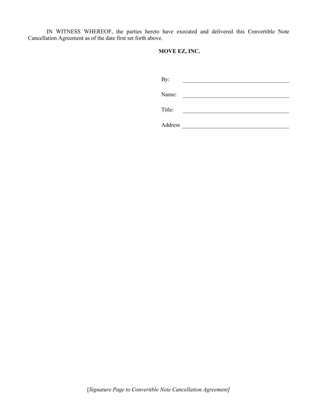 [Signature Page to Convertible Note Cancellation Agreement] IN WITNESS WHEREOF, the parties hereto have executed and delivered this Convertible Note Cancellation Agreement as of the date first set forth above. MOVE EZ, INC. By: Name: Title: Address