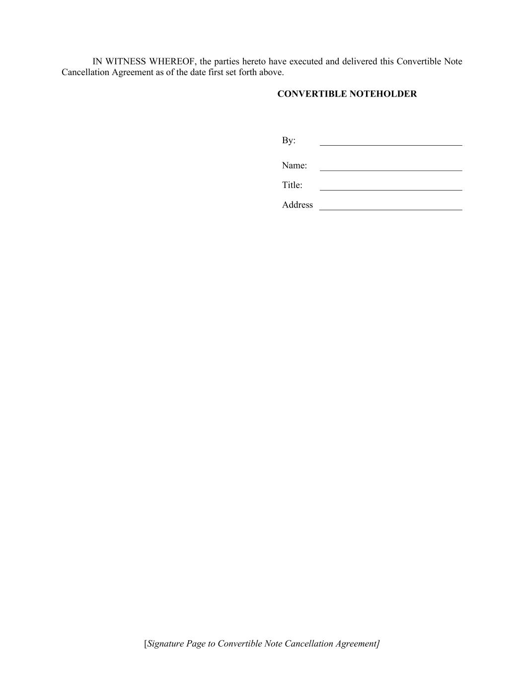 [Signature Page to Convertible Note Cancellation Agreement] IN WITNESS WHEREOF, the parties hereto have executed and delivered this Convertible Note Cancellation Agreement as of the date first set forth above. CONVERTIBLE NOTEHOLDER By: Name: Title: Address