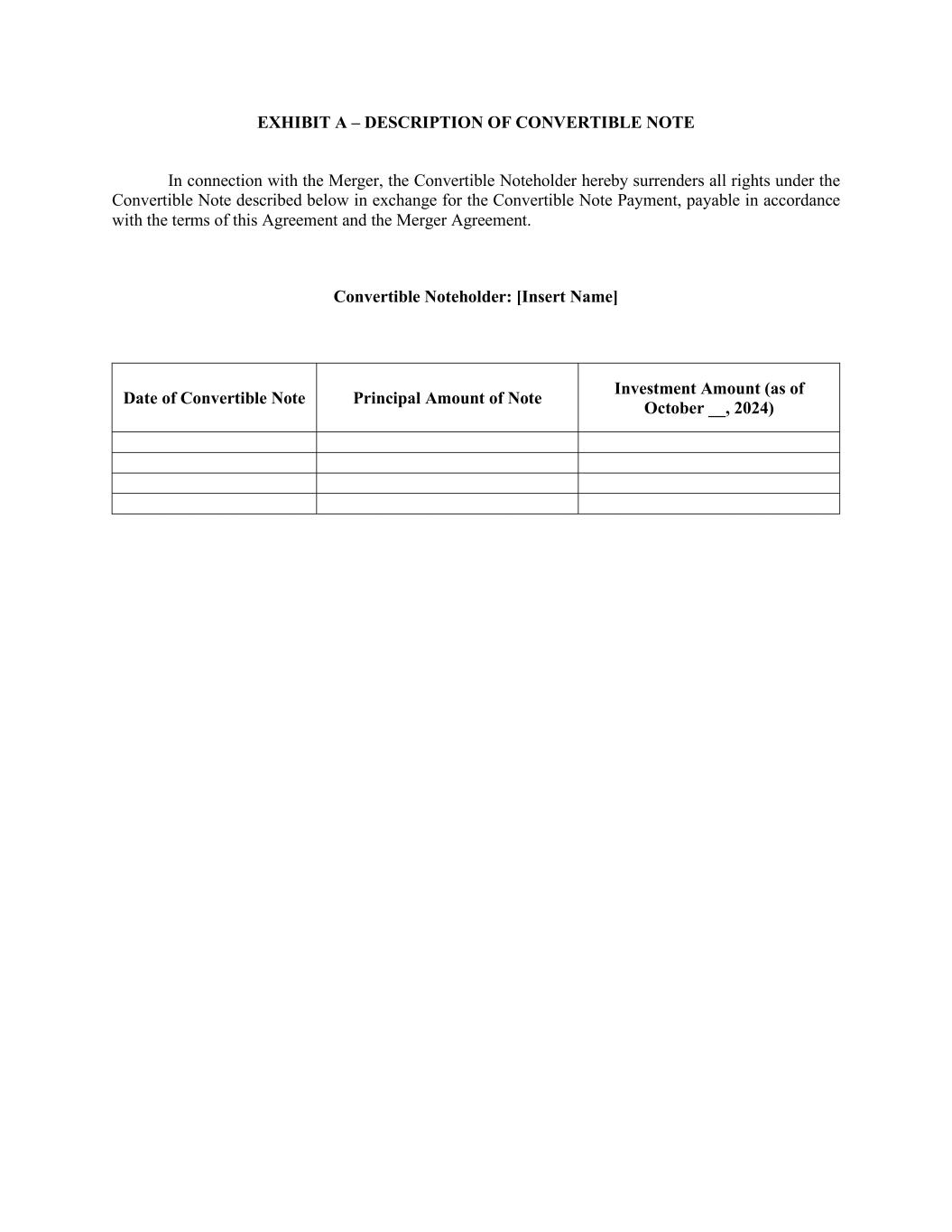 EXHIBIT A – DESCRIPTION OF CONVERTIBLE NOTE In connection with the Merger, the Convertible Noteholder hereby surrenders all rights under the Convertible Note described below in exchange for the Convertible Note Payment, payable in accordance with the terms of this Agreement and the Merger Agreement. Convertible Noteholder: [Insert Name] Date of Convertible Note Principal Amount of Note Investment Amount (as of October __, 2024)