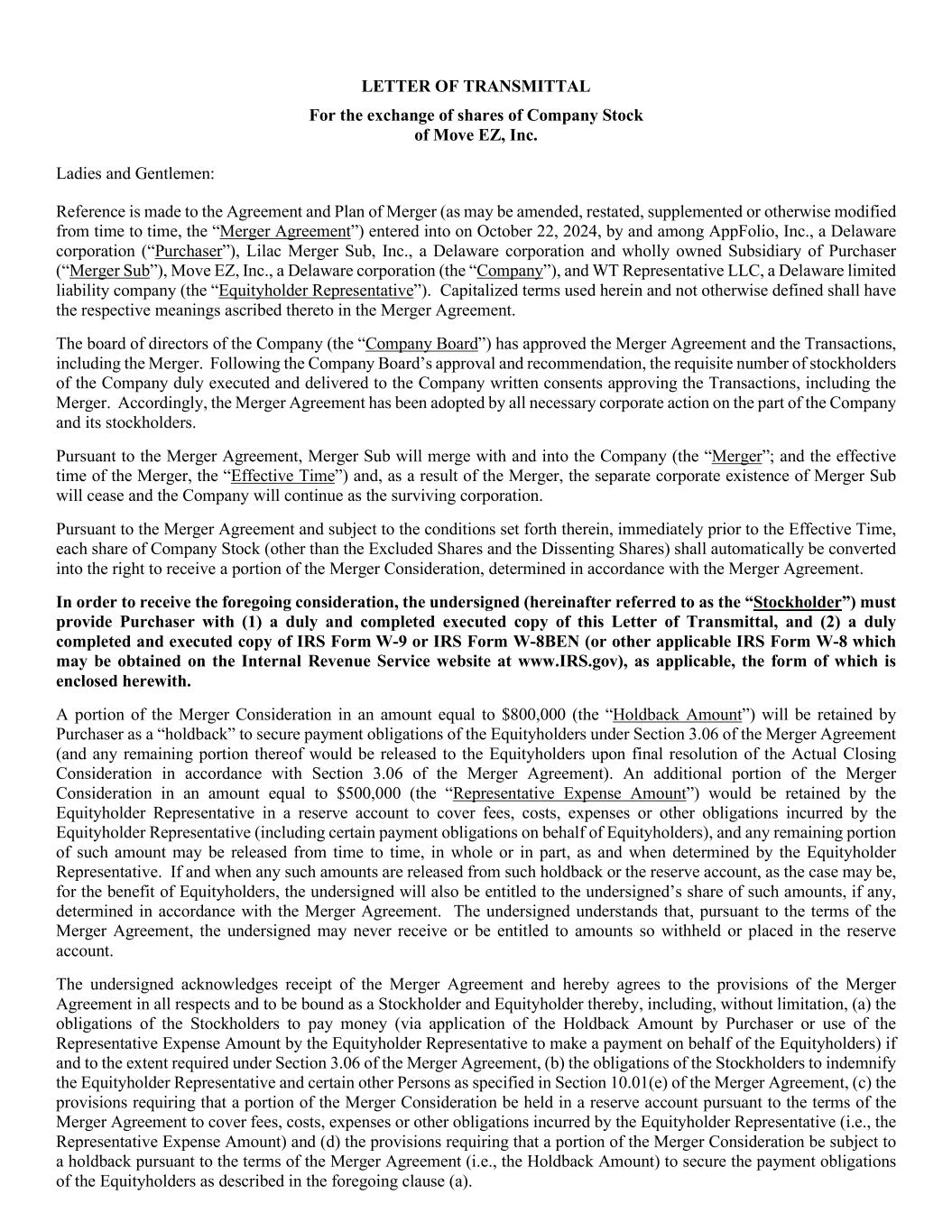 LETTER OF TRANSMITTAL For the exchange of shares of Company Stock of Move EZ, Inc. Ladies and Gentlemen: Reference is made to the Agreement and Plan of Merger (as may be amended, restated, supplemented or otherwise modified from time to time, the “Merger Agreement”) entered into on October 22, 2024, by and among AppFolio, Inc., a Delaware corporation (“Purchaser”), Lilac Merger Sub, Inc., a Delaware corporation and wholly owned Subsidiary of Purchaser (“Merger Sub”), Move EZ, Inc., a Delaware corporation (the “Company”), and WT Representative LLC, a Delaware limited liability company (the “Equityholder Representative”). Capitalized terms used herein and not otherwise defined shall have the respective meanings ascribed thereto in the Merger Agreement. The board of directors of the Company (the “Company Board”) has approved the Merger Agreement and the Transactions, including the Merger. Following the Company Board’s approval and recommendation, the requisite number of stockholders of the Company duly executed and delivered to the Company written consents approving the Transactions, including the Merger. Accordingly, the Merger Agreement has been adopted by all necessary corporate action on the part of the Company and its stockholders. Pursuant to the Merger Agreement, Merger Sub will merge with and into the Company (the “Merger”; and the effective time of the Merger, the “Effective Time”) and, as a result of the Merger, the separate corporate existence of Merger Sub will cease and the Company will continue as the surviving corporation. Pursuant to the Merger Agreement and subject to the conditions set forth therein, immediately prior to the Effective Time, each share of Company Stock (other than the Excluded Shares and the Dissenting Shares) shall automatically be converted into the right to receive a portion of the Merger Consideration, determined in accordance with the Merger Agreement. In order to receive the foregoing consideration, the undersigned (hereinafter referred to as the “Stockholder”) must provide Purchaser with (1) a duly and completed executed copy of this Letter of Transmittal, and (2) a duly completed and executed copy of IRS Form W-9 or IRS Form W-8BEN (or other applicable IRS Form W-8 which may be obtained on the Internal Revenue Service website at www.IRS.gov), as applicable, the form of which is enclosed herewith. A portion of the Merger Consideration in an amount equal to $800,000 (the “Holdback Amount”) will be retained by Purchaser as a “holdback” to secure payment obligations of the Equityholders under Section 3.06 of the Merger Agreement (and any remaining portion thereof would be released to the Equityholders upon final resolution of the Actual Closing Consideration in accordance with Section 3.06 of the Merger Agreement). An additional portion of the Merger Consideration in an amount equal to $500,000 (the “Representative Expense Amount”) would be retained by the Equityholder Representative in a reserve account to cover fees, costs, expenses or other obligations incurred by the Equityholder Representative (including certain payment obligations on behalf of Equityholders), and any remaining portion of such amount may be released from time to time, in whole or in part, as and when determined by the Equityholder Representative. If and when any such amounts are released from such holdback or the reserve account, as the case may be, for the benefit of Equityholders, the undersigned will also be entitled to the undersigned’s share of such amounts, if any, determined in accordance with the Merger Agreement. The undersigned understands that, pursuant to the terms of the Merger Agreement, the undersigned may never receive or be entitled to amounts so withheld or placed in the reserve account. The undersigned acknowledges receipt of the Merger Agreement and hereby agrees to the provisions of the Merger Agreement in all respects and to be bound as a Stockholder and Equityholder thereby, including, without limitation, (a) the obligations of the Stockholders to pay money (via application of the Holdback Amount by Purchaser or use of the Representative Expense Amount by the Equityholder Representative to make a payment on behalf of the Equityholders) if and to the extent required under Section 3.06 of the Merger Agreement, (b) the obligations of the Stockholders to indemnify the Equityholder Representative and certain other Persons as specified in Section 10.01(e) of the Merger Agreement, (c) the provisions requiring that a portion of the Merger Consideration be held in a reserve account pursuant to the terms of the Merger Agreement to cover fees, costs, expenses or other obligations incurred by the Equityholder Representative (i.e., the Representative Expense Amount) and (d) the provisions requiring that a portion of the Merger Consideration be subject to a holdback pursuant to the terms of the Merger Agreement (i.e., the Holdback Amount) to secure the payment obligations of the Equityholders as described in the foregoing clause (a).