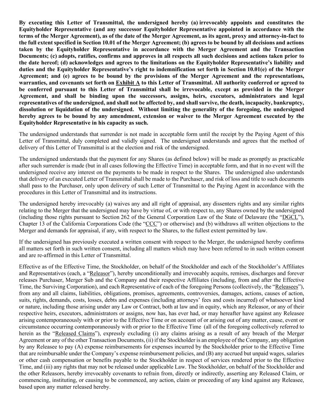 By executing this Letter of Transmittal, the undersigned hereby (a) irrevocably appoints and constitutes the Equityholder Representative (and any successor Equityholder Representative appointed in accordance with the terms of the Merger Agreement), as of the date of the Merger Agreement, as its agent, proxy and attorney-in-fact to the full extent specified in Section 10.01 of the Merger Agreement; (b) agrees to be bound by all decisions and actions taken by the Equityholder Representative in accordance with the Merger Agreement and the Transaction Documents; (c) adopts, ratifies, confirms and approves in all respects all such decisions and actions taken prior to the date hereof; (d) acknowledges and agrees to the limitations on the Equityholder Representative’s liability and duties and the Equityholder Representative’s right to indemnification set forth in Section 10.01(e) of the Merger Agreement; and (e) agrees to be bound by the provisions of the Merger Agreement and the representations, warranties, and covenants set forth on Exhibit A to this Letter of Transmittal. All authority conferred or agreed to be conferred pursuant to this Letter of Transmittal shall be irrevocable, except as provided in the Merger Agreement, and shall be binding upon the successors, assigns, heirs, executors, administrators and legal representatives of the undersigned, and shall not be affected by, and shall survive, the death, incapacity, bankruptcy, dissolution or liquidation of the undersigned. Without limiting the generality of the foregoing, the undersigned hereby agrees to be bound by any amendment, extension or waiver to the Merger Agreement executed by the Equityholder Representative in his capacity as such. The undersigned understands that surrender is not made in acceptable form until the receipt by the Paying Agent of this Letter of Transmittal, duly completed and validly signed. The undersigned understands and agrees that the method of delivery of this Letter of Transmittal is at the election and risk of the undersigned. The undersigned understands that the payment for any Shares (as defined below) will be made as promptly as practicable after such surrender is made (but in all cases following the Effective Time) in acceptable form, and that in no event will the undersigned receive any interest on the payments to be made in respect to the Shares. The undersigned also understands that delivery of an executed Letter of Transmittal shall be made to the Purchaser, and risk of loss and title to such documents shall pass to the Purchaser, only upon delivery of such Letter of Transmittal to the Paying Agent in accordance with the procedures in this Letter of Transmittal and its instructions. The undersigned hereby irrevocably (a) waives any and all right of appraisal, any dissenters rights and any similar rights relating to the Merger that the undersigned may have by virtue of, or with respect to, any Shares owned by the undersigned (including those rights pursuant to Section 262 of the General Corporation Law of the State of Delaware (the “DGCL”), Chapter 13 of the California Corporations Code (the “CCC”) or otherwise) and (b) withdraws all written objections to the Merger and demands for appraisal, if any, with respect to the Shares, to the fullest extent permitted by law. If the undersigned has previously executed a written consent with respect to the Merger, the undersigned hereby confirms all matters set forth in such written consent, including all matters which may have been referred to in such written consent and are re-affirmed in this Letter of Transmittal. Effective as of the Effective Time, the Stockholder, on behalf of the Stockholder and each of the Stockholder’s Affiliates and Representatives (each, a “Releasor”), hereby unconditionally and irrevocably acquits, remises, discharges and forever releases Purchaser, Merger Sub and the Company and their respective Affiliates (including, from and after the Effective Time, the Surviving Corporation), and each Representative of each of the foregoing Persons (collectively, the “Releasees”), from any and all claims, liabilities, obligations, promises, agreements, controversies, damages, actions, causes of action, suits, rights, demands, costs, losses, debts and expenses (including attorneys’ fees and costs incurred) of whatsoever kind or nature, including those arising under any Law or Contract, both at law and in equity, which any Releasor, or any of their respective heirs, executors, administrators or assigns, now has, has ever had, or may hereafter have against any Releasee arising contemporaneously with or prior to the Effective Time or on account of or arising out of any matter, cause, event or circumstance occurring contemporaneously with or prior to the Effective Time (all of the foregoing collectively referred to herein as the “Released Claims”), expressly excluding (i) any claims arising as a result of any breach of the Merger Agreement or any of the other Transaction Documents, (ii) if the Stockholder is an employee of the Company, any obligation by any Releasee to pay (A) expense reimbursements for expenses incurred by the Stockholder prior to the Effective Time that are reimbursable under the Company’s expense reimbursement policies, and (B) any accrued but unpaid wages, salaries or other cash compensation or benefits payable to the Stockholder in respect of services rendered prior to the Effective Time, and (iii) any rights that may not be released under applicable Law. The Stockholder, on behalf of the Stockholder and the other Releasors, hereby irrevocably covenants to refrain from, directly or indirectly, asserting any Released Claim, or commencing, instituting, or causing to be commenced, any action, claim or proceeding of any kind against any Releasee, based upon any matter released hereby.
