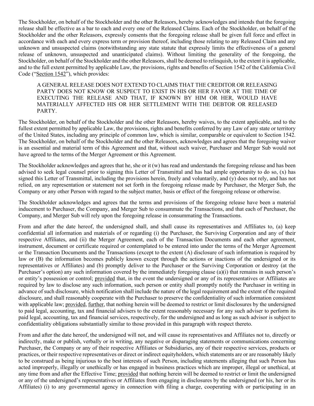 The Stockholder, on behalf of the Stockholder and the other Releasors, hereby acknowledges and intends that the foregoing release shall be effective as a bar to each and every one of the Released Claims. Each of the Stockholder, on behalf of the Stockholder and the other Releasors, expressly consents that the foregoing release shall be given full force and effect in accordance with each and every express term or provision thereof, including those relating to any Released Claim and any unknown and unsuspected claims (notwithstanding any state statute that expressly limits the effectiveness of a general release of unknown, unsuspected and unanticipated claims). Without limiting the generality of the foregoing, the Stockholder, on behalf of the Stockholder and the other Releasors, shall be deemed to relinquish, to the extent it is applicable, and to the full extent permitted by applicable Law, the provisions, rights and benefits of Section 1542 of the California Civil Code (“Section 1542”), which provides: A GENERAL RELEASE DOES NOT EXTEND TO CLAIMS THAT THE CREDITOR OR RELEASING PARTY DOES NOT KNOW OR SUSPECT TO EXIST IN HIS OR HER FAVOR AT THE TIME OF EXECUTING THE RELEASE AND THAT, IF KNOWN BY HIM OR HER, WOULD HAVE MATERIALLY AFFECTED HIS OR HER SETTLEMENT WITH THE DEBTOR OR RELEASED PARTY. The Stockholder, on behalf of the Stockholder and the other Releasors, hereby waives, to the extent applicable, and to the fullest extent permitted by applicable Law, the provisions, rights and benefits conferred by any Law of any state or territory of the United States, including any principle of common law, which is similar, comparable or equivalent to Section 1542. The Stockholder, on behalf of the Stockholder and the other Releasors, acknowledges and agrees that the foregoing waiver is an essential and material term of this Agreement and that, without such waiver, Purchaser and Merger Sub would not have agreed to the terms of the Merger Agreement or this Agreement. The Stockholder acknowledges and agrees that he, she or it (w) has read and understands the foregoing release and has been advised to seek legal counsel prior to signing this Letter of Transmittal and has had ample opportunity to do so, (x) has signed this Letter of Transmittal, including the provisions herein, freely and voluntarily, and (y) does not rely, and has not relied, on any representation or statement not set forth in the foregoing release made by Purchaser, the Merger Sub, the Company or any other Person with regard to the subject matter, basis or effect of the foregoing release or otherwise. The Stockholder acknowledges and agrees that the terms and provisions of the foregoing release have been a material inducement to Purchaser, the Company, and Merger Sub to consummate the Transactions, and that each of Purchaser, the Company, and Merger Sub will rely upon the foregoing release in consummating the Transactions. From and after the date hereof, the undersigned shall, and shall cause its representatives and Affiliates to, (a) keep confidential all information and materials of or regarding (i) the Purchaser, the Surviving Corporation and any of their respective Affiliates, and (ii) the Merger Agreement, each of the Transaction Documents and each other agreement, instrument, document or certificate required or contemplated to be entered into under the terms of the Merger Agreement or the Transaction Documents and the Transactions (except to the extent (A) disclosure of such information is required by law or (B) the information becomes publicly known except through the actions or inactions of the undersigned or its representatives or Affiliates) and (b) promptly deliver to the Purchaser or the Surviving Corporation or destroy (at the Purchaser’s option) any such information covered by the immediately foregoing clause (a)(i) that remains in such person’s or entity’s possession or control; provided that, in the event the undersigned or any of its representatives or Affiliates are required by law to disclose any such information, such person or entity shall promptly notify the Purchaser in writing in advance of such disclosure, which notification shall include the nature of the legal requirement and the extent of the required disclosure, and shall reasonably cooperate with the Purchaser to preserve the confidentiality of such information consistent with applicable law; provided, further, that nothing herein will be deemed to restrict or limit disclosures by the undersigned to paid legal, accounting, tax and financial advisers to the extent reasonably necessary for any such adviser to perform its paid legal, accounting, tax and financial services, respectively, for the undersigned and as long as such advisor is subject to confidentiality obligations substantially similar to those provided in this paragraph with respect thereto. From and after the date hereof, the undersigned will not, and will cause its representatives and Affiliates not to, directly or indirectly, make or publish, verbally or in writing, any negative or disparaging statements or communications concerning Purchaser, the Company or any of their respective Affiliates or Subsidiaries, any of their respective services, products or practices, or their respective representatives or direct or indirect equityholders, which statements are or are reasonably likely to be construed as being injurious to the best interests of such Person, including statements alleging that such Person has acted improperly, illegally or unethically or has engaged in business practices which are improper, illegal or unethical, at any time from and after the Effective Time; provided that nothing herein will be deemed to restrict or limit the undersigned or any of the undersigned’s representatives or Affiliates from engaging in disclosures by the undersigned (or his, her or its Affiliates) (i) to any governmental agency in connection with filing a charge, cooperating with or participati