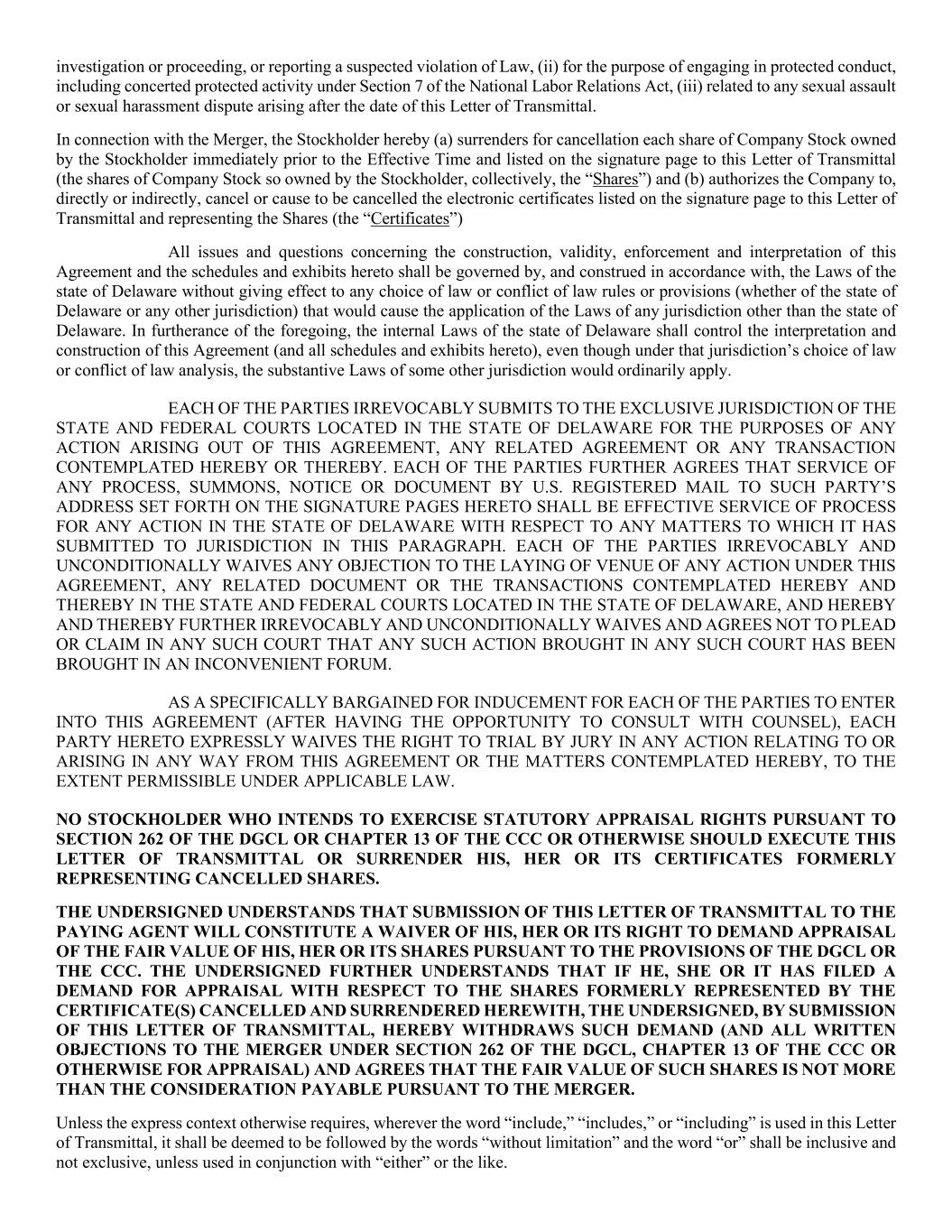 investigation or proceeding, or reporting a suspected violation of Law, (ii) for the purpose of engaging in protected conduct, including concerted protected activity under Section 7 of the National Labor Relations Act, (iii) related to any sexual assault or sexual harassment dispute arising after the date of this Letter of Transmittal. In connection with the Merger, the Stockholder hereby (a) surrenders for cancellation each share of Company Stock owned by the Stockholder immediately prior to the Effective Time and listed on the signature page to this Letter of Transmittal (the shares of Company Stock so owned by the Stockholder, collectively, the “Shares”) and (b) authorizes the Company to, directly or indirectly, cancel or cause to be cancelled the electronic certificates listed on the signature page to this Letter of Transmittal and representing the Shares (the “Certificates”) All issues and questions concerning the construction, validity, enforcement and interpretation of this Agreement and the schedules and exhibits hereto shall be governed by, and construed in accordance with, the Laws of the state of Delaware without giving effect to any choice of law or conflict of law rules or provisions (whether of the state of Delaware or any other jurisdiction) that would cause the application of the Laws of any jurisdiction other than the state of Delaware. In furtherance of the foregoing, the internal Laws of the state of Delaware shall control the interpretation and construction of this Agreement (and all schedules and exhibits hereto), even though under that jurisdiction’s choice of law or conflict of law analysis, the substantive Laws of some other jurisdiction would ordinarily apply. EACH OF THE PARTIES IRREVOCABLY SUBMITS TO THE EXCLUSIVE JURISDICTION OF THE STATE AND FEDERAL COURTS LOCATED IN THE STATE OF DELAWARE FOR THE PURPOSES OF ANY ACTION ARISING OUT OF THIS AGREEMENT, ANY RELATED AGREEMENT OR ANY TRANSACTION CONTEMPLATED HEREBY OR THEREBY. EACH OF THE PARTIES FURTHER AGREES THAT SERVICE OF ANY PROCESS, SUMMONS, NOTICE OR DOCUMENT BY U.S. REGISTERED MAIL TO SUCH PARTY’S ADDRESS SET FORTH ON THE SIGNATURE PAGES HERETO SHALL BE EFFECTIVE SERVICE OF PROCESS FOR ANY ACTION IN THE STATE OF DELAWARE WITH RESPECT TO ANY MATTERS TO WHICH IT HAS SUBMITTED TO JURISDICTION IN THIS PARAGRAPH. EACH OF THE PARTIES IRREVOCABLY AND UNCONDITIONALLY WAIVES ANY OBJECTION TO THE LAYING OF VENUE OF ANY ACTION UNDER THIS AGREEMENT, ANY RELATED DOCUMENT OR THE TRANSACTIONS CONTEMPLATED HEREBY AND THEREBY IN THE STATE AND FEDERAL COURTS LOCATED IN THE STATE OF DELAWARE, AND HEREBY AND THEREBY FURTHER IRREVOCABLY AND UNCONDITIONALLY WAIVES AND AGREES NOT TO PLEAD OR CLAIM IN ANY SUCH COURT THAT ANY SUCH ACTION BROUGHT IN ANY SUCH COURT HAS BEEN BROUGHT IN AN INCONVENIENT FORUM. AS A SPECIFICALLY BARGAINED FOR INDUCEMENT FOR EACH OF THE PARTIES TO ENTER INTO THIS AGREEMENT (AFTER HAVING THE OPPORTUNITY TO CONSULT WITH COUNSEL), EACH PARTY HERETO EXPRESSLY WAIVES THE RIGHT TO TRIAL BY JURY IN ANY ACTION RELATING TO OR ARISING IN ANY WAY FROM THIS AGREEMENT OR THE MATTERS CONTEMPLATED HEREBY, TO THE EXTENT PERMISSIBLE UNDER APPLICABLE LAW. NO STOCKHOLDER WHO INTENDS TO EXERCISE STATUTORY APPRAISAL RIGHTS PURSUANT TO SECTION 262 OF THE DGCL OR CHAPTER 13 OF THE CCC OR OTHERWISE SHOULD EXECUTE THIS LETTER OF TRANSMITTAL OR SURRENDER HIS, HER OR ITS CERTIFICATES FORMERLY REPRESENTING CANCELLED SHARES. THE UNDERSIGNED UNDERSTANDS THAT SUBMISSION OF THIS LETTER OF TRANSMITTAL TO THE PAYING AGENT WILL CONSTITUTE A WAIVER OF HIS, HER OR ITS RIGHT TO DEMAND APPRAISAL OF THE FAIR VALUE OF HIS, HER OR ITS SHARES PURSUANT TO THE PROVISIONS OF THE DGCL OR THE CCC. THE UNDERSIGNED FURTHER UNDERSTANDS THAT IF HE, SHE OR IT HAS FILED A DEMAND FOR APPRAISAL WITH RESPECT TO THE SHARES FORMERLY REPRESENTED BY THE CERTIFICATE(S) CANCELLED AND SURRENDERED HEREWITH, THE UNDERSIGNED, BY SUBMISSION OF THIS LETTER OF TRANSMITTAL, HEREBY WITHDRAWS SUCH DEMAND (AND ALL WRITTEN OBJECTIONS TO THE MERGER UNDER SECTION 262 OF THE DGCL, CHAPTER 13 OF THE CCC OR OTHERWISE FOR APPRAISAL) AND AGREES THAT THE FAIR VALUE OF SUCH SHARES IS NOT MORE THAN THE CONSIDERATION PAYABLE PURSUANT TO THE MERGER. Unless the express context otherwise requires, wherever the word “include,” “includes,” or “including” is used in this Letter of Transmittal, it shall be deemed to be followed by the words “without limitation” and the word “or” shall be inclusive and not exclusive, unless used in conjunction with “either” or the like.