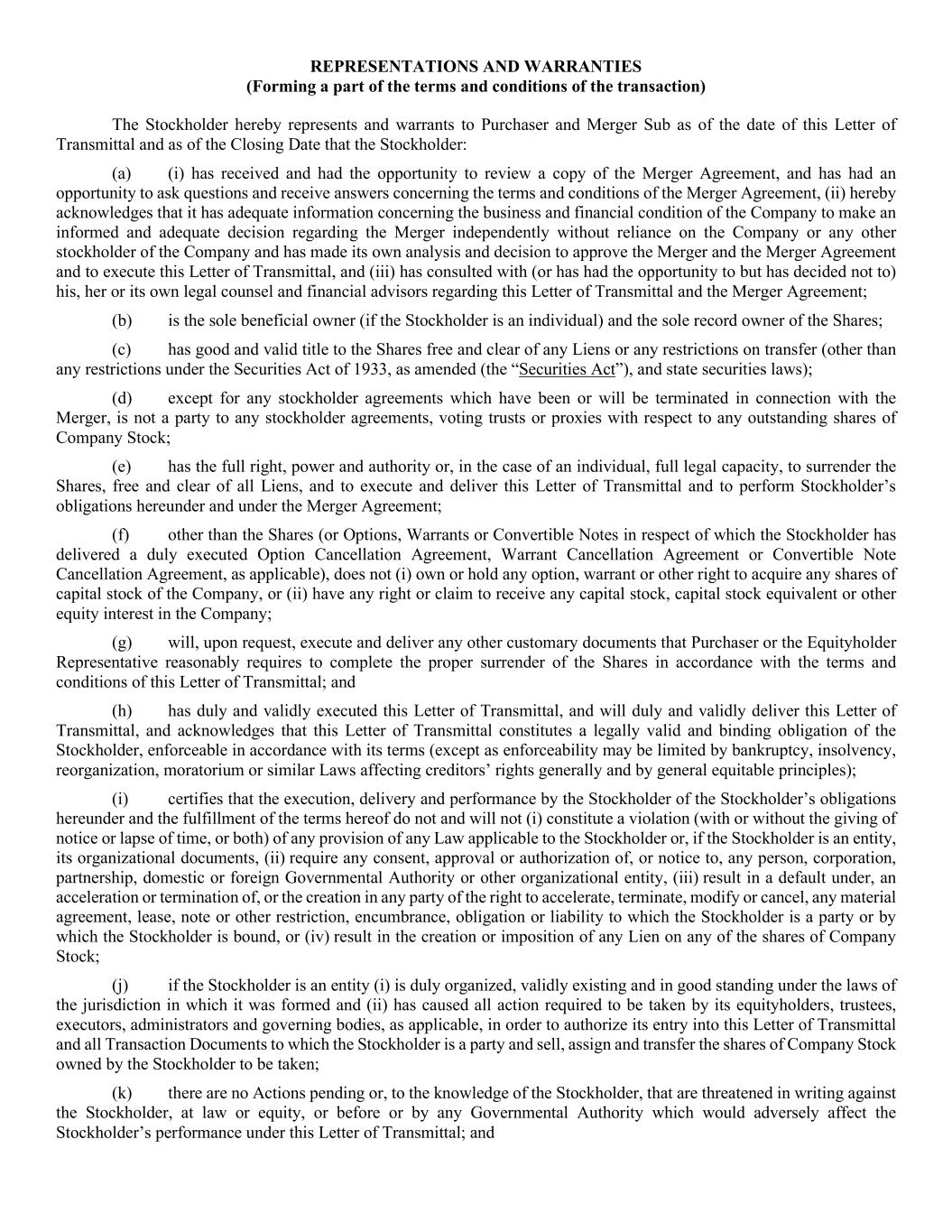 REPRESENTATIONS AND WARRANTIES (Forming a part of the terms and conditions of the transaction) The Stockholder hereby represents and warrants to Purchaser and Merger Sub as of the date of this Letter of Transmittal and as of the Closing Date that the Stockholder: (a) (i) has received and had the opportunity to review a copy of the Merger Agreement, and has had an opportunity to ask questions and receive answers concerning the terms and conditions of the Merger Agreement, (ii) hereby acknowledges that it has adequate information concerning the business and financial condition of the Company to make an informed and adequate decision regarding the Merger independently without reliance on the Company or any other stockholder of the Company and has made its own analysis and decision to approve the Merger and the Merger Agreement and to execute this Letter of Transmittal, and (iii) has consulted with (or has had the opportunity to but has decided not to) his, her or its own legal counsel and financial advisors regarding this Letter of Transmittal and the Merger Agreement; (b) is the sole beneficial owner (if the Stockholder is an individual) and the sole record owner of the Shares; (c) has good and valid title to the Shares free and clear of any Liens or any restrictions on transfer (other than any restrictions under the Securities Act of 1933, as amended (the “Securities Act”), and state securities laws); (d) except for any stockholder agreements which have been or will be terminated in connection with the Merger, is not a party to any stockholder agreements, voting trusts or proxies with respect to any outstanding shares of Company Stock; (e) has the full right, power and authority or, in the case of an individual, full legal capacity, to surrender the Shares, free and clear of all Liens, and to execute and deliver this Letter of Transmittal and to perform Stockholder’s obligations hereunder and under the Merger Agreement; (f) other than the Shares (or Options, Warrants or Convertible Notes in respect of which the Stockholder has delivered a duly executed Option Cancellation Agreement, Warrant Cancellation Agreement or Convertible Note Cancellation Agreement, as applicable), does not (i) own or hold any option, warrant or other right to acquire any shares of capital stock of the Company, or (ii) have any right or claim to receive any capital stock, capital stock equivalent or other equity interest in the Company; (g) will, upon request, execute and deliver any other customary documents that Purchaser or the Equityholder Representative reasonably requires to complete the proper surrender of the Shares in accordance with the terms and conditions of this Letter of Transmittal; and (h) has duly and validly executed this Letter of Transmittal, and will duly and validly deliver this Letter of Transmittal, and acknowledges that this Letter of Transmittal constitutes a legally valid and binding obligation of the Stockholder, enforceable in accordance with its terms (except as enforceability may be limited by bankruptcy, insolvency, reorganization, moratorium or similar Laws affecting creditors’ rights generally and by general equitable principles); (i) certifies that the execution, delivery and performance by the Stockholder of the Stockholder’s obligations hereunder and the fulfillment of the terms hereof do not and will not (i) constitute a violation (with or without the giving of notice or lapse of time, or both) of any provision of any Law applicable to the Stockholder or, if the Stockholder is an entity, its organizational documents, (ii) require any consent, approval or authorization of, or notice to, any person, corporation, partnership, domestic or foreign Governmental Authority or other organizational entity, (iii) result in a default under, an acceleration or termination of, or the creation in any party of the right to accelerate, terminate, modify or cancel, any material agreement, lease, note or other restriction, encumbrance, obligation or liability to which the Stockholder is a party or by which the Stockholder is bound, or (iv) result in the creation or imposition of any Lien on any of the shares of Company Stock; (j) if the Stockholder is an entity (i) is duly organized, validly existing and in good standing under the laws of the jurisdiction in which it was formed and (ii) has caused all action required to be taken by its equityholders, trustees, executors, administrators and governing bodies, as applicable, in order to authorize its entry into this Letter of Transmittal and all Transaction Documents to which the Stockholder is a party and sell, assign and transfer the shares of Company Stock owned by the Stockholder to be taken; (k) there are no Actions pending or, to the knowledge of the Stockholder, that are threatened in writing against the Stockholder, at law or equity, or before or by any Governmental Authority which would adversely affect the Stockholder’s performance under this Letter of Transmittal; and