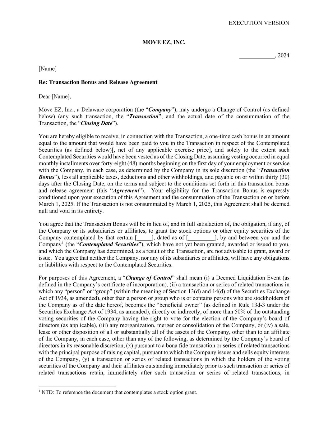 EXECUTION VERSION MOVE EZ, INC. ____________, 2024 [Name] Re: Transaction Bonus and Release Agreement Dear [Name], Move EZ, Inc., a Delaware corporation (the “Company”), may undergo a Change of Control (as defined below) (any such transaction, the “Transaction”; and the actual date of the consummation of the Transaction, the “Closing Date”). You are hereby eligible to receive, in connection with the Transaction, a one-time cash bonus in an amount equal to the amount that would have been paid to you in the Transaction in respect of the Contemplated Securities (as defined below)[, net of any applicable exercise price], and solely to the extent such Contemplated Securities would have been vested as of the Closing Date, assuming vesting occurred in equal monthly installments over forty-eight (48) months beginning on the first day of your employment or service with the Company, in each case, as determined by the Company in its sole discretion (the “Transaction Bonus”), less all applicable taxes, deductions and other withholdings, and payable on or within thirty (30) days after the Closing Date, on the terms and subject to the conditions set forth in this transaction bonus and release agreement (this “Agreement”). Your eligibility for the Transaction Bonus is expressly conditioned upon your execution of this Agreement and the consummation of the Transaction on or before March 1, 2025. If the Transaction is not consummated by March 1, 2025, this Agreement shall be deemed null and void in its entirety. You agree that the Transaction Bonus will be in lieu of, and in full satisfaction of, the obligation, if any, of the Company or its subsidiaries or affiliates, to grant the stock options or other equity securities of the Company contemplated by that certain [_____], dated as of [_________], by and between you and the Company1 (the “Contemplated Securities”), which have not yet been granted, awarded or issued to you, and which the Company has determined, as a result of the Transaction, are not advisable to grant, award or issue. You agree that neither the Company, nor any of its subsidiaries or affiliates, will have any obligations or liabilities with respect to the Contemplated Securities. For purposes of this Agreement, a “Change of Control” shall mean (i) a Deemed Liquidation Event (as defined in the Company’s certificate of incorporation), (ii) a transaction or series of related transactions in which any “person” or “group” (within the meaning of Section 13(d) and 14(d) of the Securities Exchange Act of 1934, as amended), other than a person or group who is or contains persons who are stockholders of the Company as of the date hereof, becomes the “beneficial owner” (as defined in Rule 13d-3 under the Securities Exchange Act of 1934, as amended), directly or indirectly, of more than 50% of the outstanding voting securities of the Company having the right to vote for the election of the Company’s board of directors (as applicable), (iii) any reorganization, merger or consolidation of the Company, or (iv) a sale, lease or other disposition of all or substantially all of the assets of the Company, other than to an affiliate of the Company, in each case, other than any of the following, as determined by the Company’s board of directors in its reasonable discretion, (x) pursuant to a bona fide transaction or series of related transactions with the principal purpose of raising capital, pursuant to which the Company issues and sells equity interests of the Company, (y) a transaction or series of related transactions in which the holders of the voting securities of the Company and their affiliates outstanding immediately prior to such transaction or series of related transactions retain, immediately after such transaction or series of related transactions, in 1 NTD: To reference the document that contemplates a stock option grant.