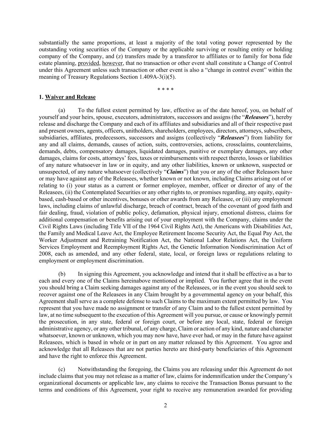 2 substantially the same proportions, at least a majority of the total voting power represented by the outstanding voting securities of the Company or the applicable surviving or resulting entity or holding company of the Company, and (z) transfers made by a transferor to affiliates or to family for bona fide estate planning, provided, however, that no transaction or other event shall constitute a Change of Control under this Agreement unless such transaction or other event is also a “change in control event” within the meaning of Treasury Regulations Section 1.409A-3(i)(5). * * * * 1. Waiver and Release (a) To the fullest extent permitted by law, effective as of the date hereof, you, on behalf of yourself and your heirs, spouse, executors, administrators, successors and assigns (the “Releasors”), hereby release and discharge the Company and each of its affiliates and subsidiaries and all of their respective past and present owners, agents, officers, unitholders, shareholders, employees, directors, attorneys, subscribers, subsidiaries, affiliates, predecessors, successors and assigns (collectively “Releasees”) from liability for any and all claims, demands, causes of action, suits, controversies, actions, crossclaims, counterclaims, demands, debts, compensatory damages, liquidated damages, punitive or exemplary damages, any other damages, claims for costs, attorneys’ fees, taxes or reimbursements with respect thereto, losses or liabilities of any nature whatsoever in law or in equity, and any other liabilities, known or unknown, suspected or unsuspected, of any nature whatsoever (collectively “Claims”) that you or any of the other Releasors have or may have against any of the Releasees, whether known or not known, including Claims arising out of or relating to (i) your status as a current or former employee, member, officer or director of any of the Releasees, (ii) the Contemplated Securities or any other rights to, or promises regarding, any equity, equity- based, cash-based or other incentives, bonuses or other awards from any Releasee, or (iii) any employment laws, including claims of unlawful discharge, breach of contract, breach of the covenant of good faith and fair dealing, fraud, violation of public policy, defamation, physical injury, emotional distress, claims for additional compensation or benefits arising out of your employment with the Company, claims under the Civil Rights Laws (including Title VII of the 1964 Civil Rights Act), the Americans with Disabilities Act, the Family and Medical Leave Act, the Employee Retirement Income Security Act, the Equal Pay Act, the Worker Adjustment and Retraining Notification Act, the National Labor Relations Act, the Uniform Services Employment and Reemployment Rights Act, the Genetic Information Nondiscrimination Act of 2008, each as amended, and any other federal, state, local, or foreign laws or regulations relating to employment or employment discrimination. (b) In signing this Agreement, you acknowledge and intend that it shall be effective as a bar to each and every one of the Claims hereinabove mentioned or implied. You further agree that in the event you should bring a Claim seeking damages against any of the Releasees, or in the event you should seek to recover against one of the Releasees in any Claim brought by a governmental agency on your behalf, this Agreement shall serve as a complete defense to such Claims to the maximum extent permitted by law. You represent that you have made no assignment or transfer of any Claim and to the fullest extent permitted by law, at no time subsequent to the execution of this Agreement will you pursue, or cause or knowingly permit the prosecution, in any state, federal or foreign court, or before any local, state, federal or foreign administrative agency, or any other tribunal, of any charge, Claim or action of any kind, nature and character whatsoever, known or unknown, which you may now have, have ever had, or may in the future have against Releasees, which is based in whole or in part on any matter released by this Agreement. You agree and acknowledge that all Releasees that are not parties hereto are third-party beneficiaries of this Agreement and have the right to enforce this Agreement. (c) Notwithstanding the foregoing, the Claims you are releasing under this Agreement do not include claims that you may not release as a matter of law, claims for indemnification under the Company’s organizational documents or applicable law, any claims to receive the Transaction Bonus pursuant to the terms and conditions of this Agreement, your right to receive any remuneration awarded for providing