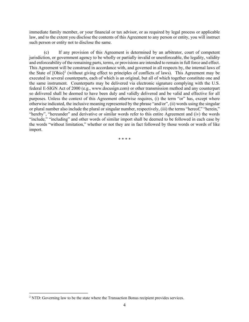 4 immediate family member, or your financial or tax advisor, or as required by legal process or applicable law, and to the extent you disclose the contents of this Agreement to any person or entity, you will instruct such person or entity not to disclose the same. (c) If any provision of this Agreement is determined by an arbitrator, court of competent jurisdiction, or government agency to be wholly or partially invalid or unenforceable, the legality, validity and enforceability of the remaining parts, terms, or provisions are intended to remain in full force and effect. This Agreement will be construed in accordance with, and governed in all respects by, the internal laws of the State of [Ohio]2 (without giving effect to principles of conflicts of laws). This Agreement may be executed in several counterparts, each of which is an original, but all of which together constitute one and the same instrument. Counterparts may be delivered via electronic signature complying with the U.S. federal E-SIGN Act of 2000 (e.g., www.docusign.com) or other transmission method and any counterpart so delivered shall be deemed to have been duly and validly delivered and be valid and effective for all purposes. Unless the context of this Agreement otherwise requires, (i) the term “or” has, except where otherwise indicated, the inclusive meaning represented by the phrase “and/or”, (ii) words using the singular or plural number also include the plural or singular number, respectively, (iii) the terms “hereof,” “herein,” “hereby”, “hereunder” and derivative or similar words refer to this entire Agreement and (iv) the words “include,” “including” and other words of similar import shall be deemed to be followed in each case by the words “without limitation,” whether or not they are in fact followed by those words or words of like import. * * * * 2 NTD: Governing law to be the state where the Transaction Bonus recipient provides services.