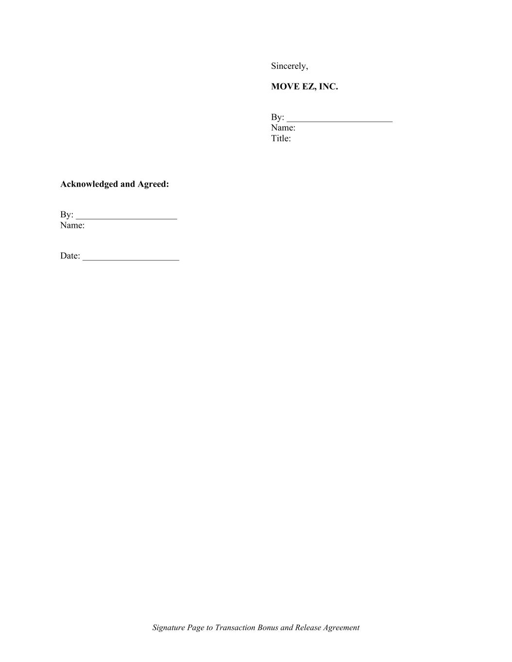 Signature Page to Transaction Bonus and Release Agreement Sincerely, MOVE EZ, INC. By: _______________________ Name: Title: Acknowledged and Agreed: By: ______________________ Name: Date: _____________________