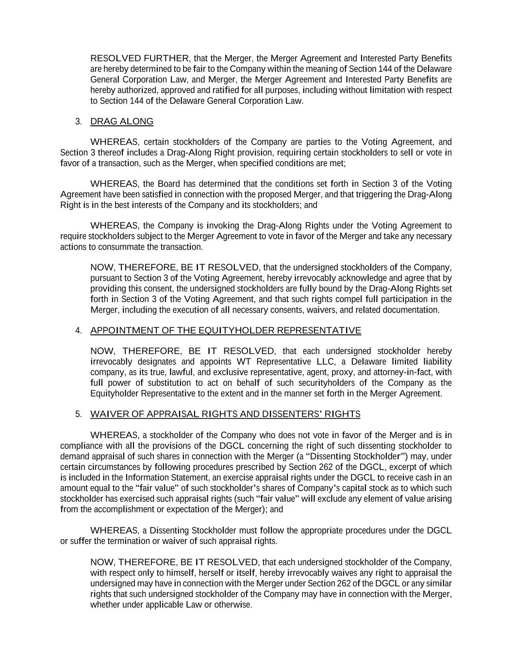 RESOLVED FURTHER, that the Merger, the Merger Agreement and Interested Party Benefits are hereby determined to be fair to the Company within the meaning of Section 144 of the Delaware General Corporation Law, and Merger, the Merger Agreement and Interested Party Benefits are hereby authorized, approved and ratified for all purposes, including without limitation with respect to Section 144 of the Delaware General Corporation Law. 3. DRAG ALONG WHEREAS, certain stockholders of the Company are parties to the Voting Agreement, and Section 3 thereof includes a Drag-Along Right provision, requiring certain stockholders to sell or vote in favor of a transaction, such as the Merger, when specified conditions are met; WHEREAS, the Board has determined that the conditions set forth in Section 3 of the Voting Agreement have been satisfied in connection with the proposed Merger, and that triggering the Drag-Along Right is in the best interests of the Company and its stockholders; and WHEREAS, the Company is invoking the Drag-Along Rights under the Voting Agreement to require stockholders subject to the Merger Agreement to vote in favor of the Merger and take any necessary actions to consummate the transaction. NOW, THEREFORE, BE IT RESOLVED, that the undersigned stockholders of the Company, pursuant to Section 3 of the Voting Agreement, hereby irrevocably acknowledge and agree that by providing this consent, the undersigned stockholders are fully bound by the Drag-Along Rights set forth in Section 3 of the Voting Agreement, and that such rights compel full participation in the Merger, including the execution of all necessary consents, waivers, and related documentation. 4. APPOINTMENT OF THE EQUITYHOLDER REPRESENTATIVE NOW, THEREFORE, BE IT RESOLVED, that each undersigned stockholder hereby irrevocably designates and appoints WT Representative LLC, a Delaware limited liability company, as its true, lawful, and exclusive representative, agent, proxy, and attorney-in-fact, with full power of substitution to act on behalf of such securityholders of the Company as the Equityholder Representative to the extent and in the manner set forth in the Merger Agreement. 5. WAIVER OF APPRAISAL RIGHTS AND DISSENTERS’ RIGHTS WHEREAS, a stockholder of the Company who does not vote in favor of the Merger and is in compliance with all the provisions of the DGCL concerning the right of such dissenting stockholder to demand appraisal of such shares in connection with the Merger (a “Dissenting Stockholder”) may, under certain circumstances by following procedures prescribed by Section 262 of the DGCL, excerpt of which is included in the Information Statement, an exercise appraisal rights under the DGCL to receive cash in an amount equal to the “fair value” of such stockholder’s shares of Company’s capital stock as to which such stockholder has exercised such appraisal rights (such “fair value” will exclude any element of value arising from the accomplishment or expectation of the Merger); and WHEREAS, a Dissenting Stockholder must follow the appropriate procedures under the DGCL or suffer the termination or waiver of such appraisal rights. NOW, THEREFORE, BE IT RESOLVED, that each undersigned stockholder of the Company, with respect only to himself, herself or itself, hereby irrevocably waives any right to appraisal the undersigned may have in connection with the Merger under Section 262 of the DGCL or any similar rights that such undersigned stockholder of the Company may have in connection with the Merger, whether under applicable Law or otherwise.