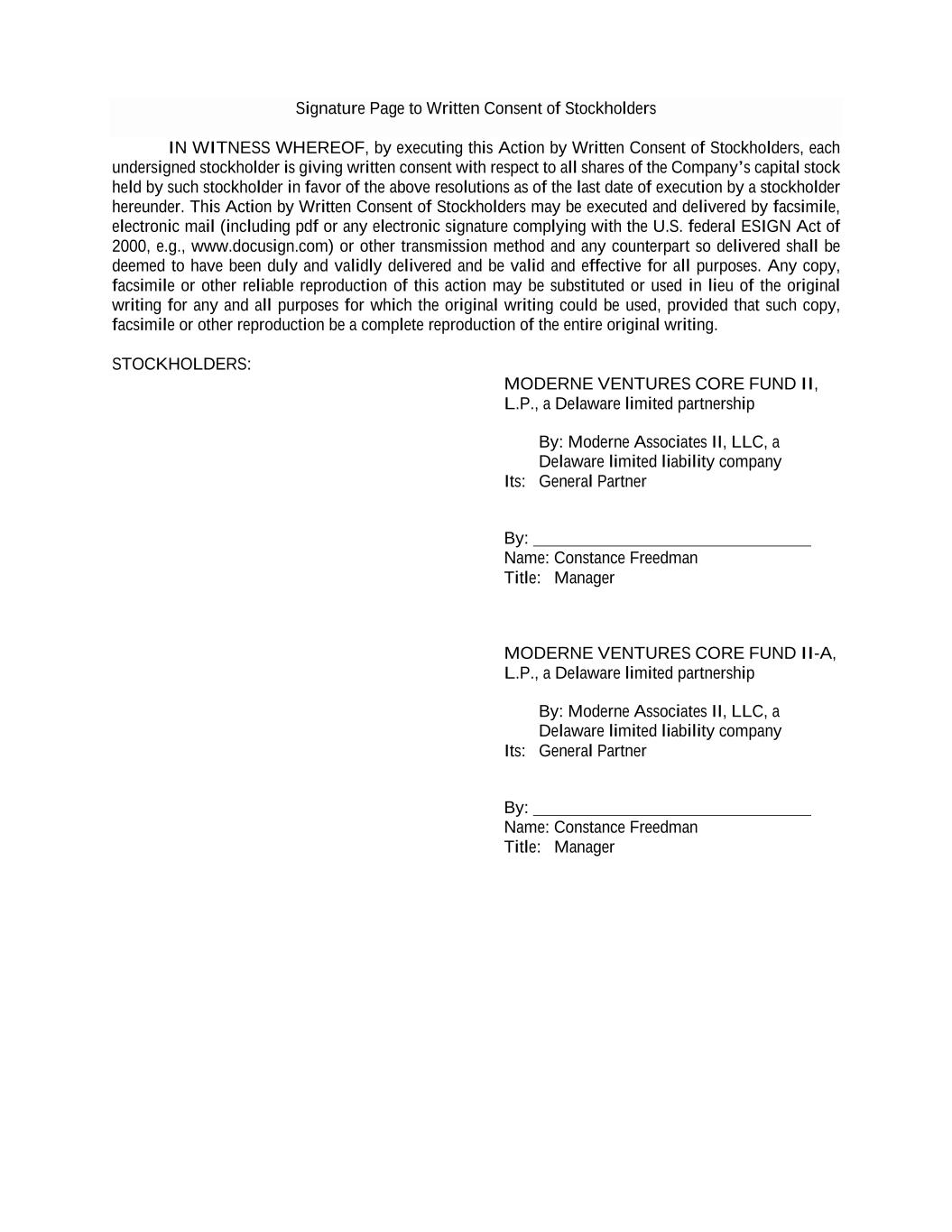 Signature Page to Written Consent of Stockholders IN WITNESS WHEREOF, by executing this Action by Written Consent of Stockholders, each undersigned stockholder is giving written consent with respect to all shares of the Company’s capital stock held by such stockholder in favor of the above resolutions as of the last date of execution by a stockholder hereunder. This Action by Written Consent of Stockholders may be executed and delivered by facsimile, electronic mail (including pdf or any electronic signature complying with the U.S. federal ESIGN Act of 2000, e.g., www.docusign.com) or other transmission method and any counterpart so delivered shall be deemed to have been duly and validly delivered and be valid and effective for all purposes. Any copy, facsimile or other reliable reproduction of this action may be substituted or used in lieu of the original writing for any and all purposes for which the original writing could be used, provided that such copy, facsimile or other reproduction be a complete reproduction of the entire original writing. STOCKHOLDERS: MODERNE VENTURES CORE FUND II, L.P., a Delaware limited partnership By: Moderne Associates II, LLC, a Delaware limited liability company Its: General Partner By: Name: Constance Freedman Title: Manager MODERNE VENTURES CORE FUND II-A, L.P., a Delaware limited partnership By: Moderne Associates II, LLC, a Delaware limited liability company Its: General Partner By: Name: Constance Freedman Title: Manager