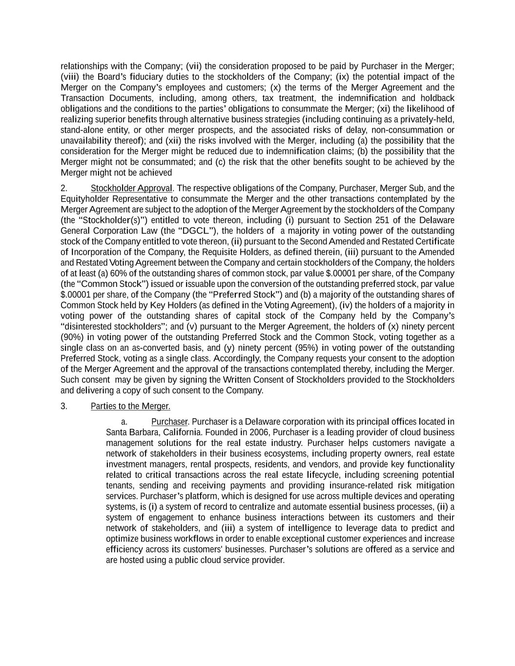 relationships with the Company; (vii) the consideration proposed to be paid by Purchaser in the Merger; (viii) the Board’s fiduciary duties to the stockholders of the Company; (ix) the potential impact of the Merger on the Company’s employees and customers; (x) the terms of the Merger Agreement and the Transaction Documents, including, among others, tax treatment, the indemnification and holdback obligations and the conditions to the parties’ obligations to consummate the Merger; (xi) the likelihood of realizing superior benefits through alternative business strategies (including continuing as a privately-held, stand-alone entity, or other merger prospects, and the associated risks of delay, non-consummation or unavailability thereof); and (xii) the risks involved with the Merger, including (a) the possibility that the consideration for the Merger might be reduced due to indemnification claims; (b) the possibility that the Merger might not be consummated; and (c) the risk that the other benefits sought to be achieved by the Merger might not be achieved 2. Stockholder Approval. The respective obligations of the Company, Purchaser, Merger Sub, and the Equityholder Representative to consummate the Merger and the other transactions contemplated by the Merger Agreement are subject to the adoption of the Merger Agreement by the stockholders of the Company (the “Stockholder(s)”) entitled to vote thereon, including (i) pursuant to Section 251 of the Delaware General Corporation Law (the “DGCL”), the holders of a majority in voting power of the outstanding stock of the Company entitled to vote thereon, (ii) pursuant to the Second Amended and Restated Certificate of Incorporation of the Company, the Requisite Holders, as defined therein, (iii) pursuant to the Amended and Restated Voting Agreement between the Company and certain stockholders of the Company, the holders of at least (a) 60% of the outstanding shares of common stock, par value $.00001 per share, of the Company (the “Common Stock”) issued or issuable upon the conversion of the outstanding preferred stock, par value $.00001 per share, of the Company (the “Preferred Stock”) and (b) a majority of the outstanding shares of Common Stock held by Key Holders (as defined in the Voting Agreement), (iv) the holders of a majority in voting power of the outstanding shares of capital stock of the Company held by the Company’s “disinterested stockholders”; and (v) pursuant to the Merger Agreement, the holders of (x) ninety percent (90%) in voting power of the outstanding Preferred Stock and the Common Stock, voting together as a single class on an as-converted basis, and (y) ninety percent (95%) in voting power of the outstanding Preferred Stock, voting as a single class. Accordingly, the Company requests your consent to the adoption of the Merger Agreement and the approval of the transactions contemplated thereby, including the Merger. Such consent may be given by signing the Written Consent of Stockholders provided to the Stockholders and delivering a copy of such consent to the Company. 3. Parties to the Merger. a. Purchaser. Purchaser is a Delaware corporation with its principal offices located in Santa Barbara, California. Founded in 2006, Purchaser is a leading provider of cloud business management solutions for the real estate industry. Purchaser helps customers navigate a network of stakeholders in their business ecosystems, including property owners, real estate investment managers, rental prospects, residents, and vendors, and provide key functionality related to critical transactions across the real estate lifecycle, including screening potential tenants, sending and receiving payments and providing insurance-related risk mitigation services. Purchaser’s platform, which is designed for use across multiple devices and operating systems, is (i) a system of record to centralize and automate essential business processes, (ii) a system of engagement to enhance business interactions between its customers and their network of stakeholders, and (iii) a system of intelligence to leverage data to predict and optimize business workflows in order to enable exceptional customer experiences and increase efficiency across its customers' businesses. Purchaser’s solutions are offered as a service and are hosted using a public cloud service provider.