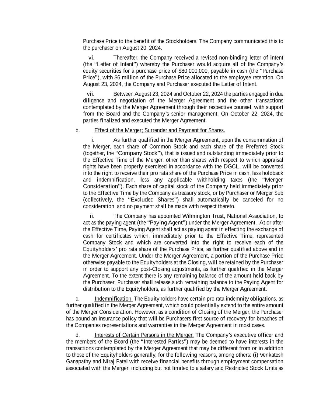 Purchase Price to the benefit of the Stockholders. The Company communicated this to the purchaser on August 20, 2024. vi. Thereafter, the Company received a revised non-binding letter of intent (the “Letter of Intent”) whereby the Purchaser would acquire all of the Company’s equity securities for a purchase price of $80,000,000, payable in cash (the “Purchase Price”), with $6 million of the Purchase Price allocated to the employee retention. On August 23, 2024, the Company and Purchaser executed the Letter of Intent. vii. Between August 23, 2024 and October 22, 2024 the parties engaged in due diligence and negotiation of the Merger Agreement and the other transactions contemplated by the Merger Agreement through their respective counsel, with support from the Board and the Company’s senior management. On October 22, 2024, the parties finalized and executed the Merger Agreement. b. Effect of the Merger; Surrender and Payment for Shares. i. As further qualified in the Merger Agreement, upon the consummation of the Merger, each share of Common Stock and each share of the Preferred Stock (together, the “Company Stock”), that is issued and outstanding immediately prior to the Effective Time of the Merger, other than shares with respect to which appraisal rights have been properly exercised in accordance with the DGCL, will be converted into the right to receive their pro rata share of the Purchase Price in cash, less holdback and indemnification, less any applicable withholding taxes (the “Merger Consideration”). Each share of capital stock of the Company held immediately prior to the Effective Time by the Company as treasury stock, or by Purchaser or Merger Sub (collectively, the “Excluded Shares”) shall automatically be canceled for no consideration, and no payment shall be made with respect thereto. ii. The Company has appointed Wilmington Trust, National Association, to act as the paying agent (the “Paying Agent”) under the Merger Agreement. At or after the Effective Time, Paying Agent shall act as paying agent in effecting the exchange of cash for certificates which, immediately prior to the Effective Time, represented Company Stock and which are converted into the right to receive each of the Equityholders’ pro rata share of the Purchase Price, as further qualified above and in the Merger Agreement. Under the Merger Agreement, a portion of the Purchase Price otherwise payable to the Equityholders at the Closing, will be retained by the Purchaser in order to support any post-Closing adjustments, as further qualified in the Merger Agreement. To the extent there is any remaining balance of the amount held back by the Purchaser, Purchaser shall release such remaining balance to the Paying Agent for distribution to the Equityholders, as further qualified by the Merger Agreement. c. Indemnification. The Equityholders have certain pro rata indemnity obligations, as further qualified in the Merger Agreement, which could potentially extend to the entire amount of the Merger Consideration. However, as a condition of Closing of the Merger, the Purchaser has bound an insurance policy that will be Purchasers first source of recovery for breaches of the Companies representations and warranties in the Merger Agreement in most cases. d. Interests of Certain Persons in the Merger. The Company’s executive officer and the members of the Board (the “Interested Parties”) may be deemed to have interests in the transactions contemplated by the Merger Agreement that may be different from or in addition to those of the Equityholders generally, for the following reasons, among others: (i) Venkatesh Ganapathy and Niraj Patel with receive financial benefits through employment compensation associated with the Merger, including but not limited to a salary and Restricted Stock Units as