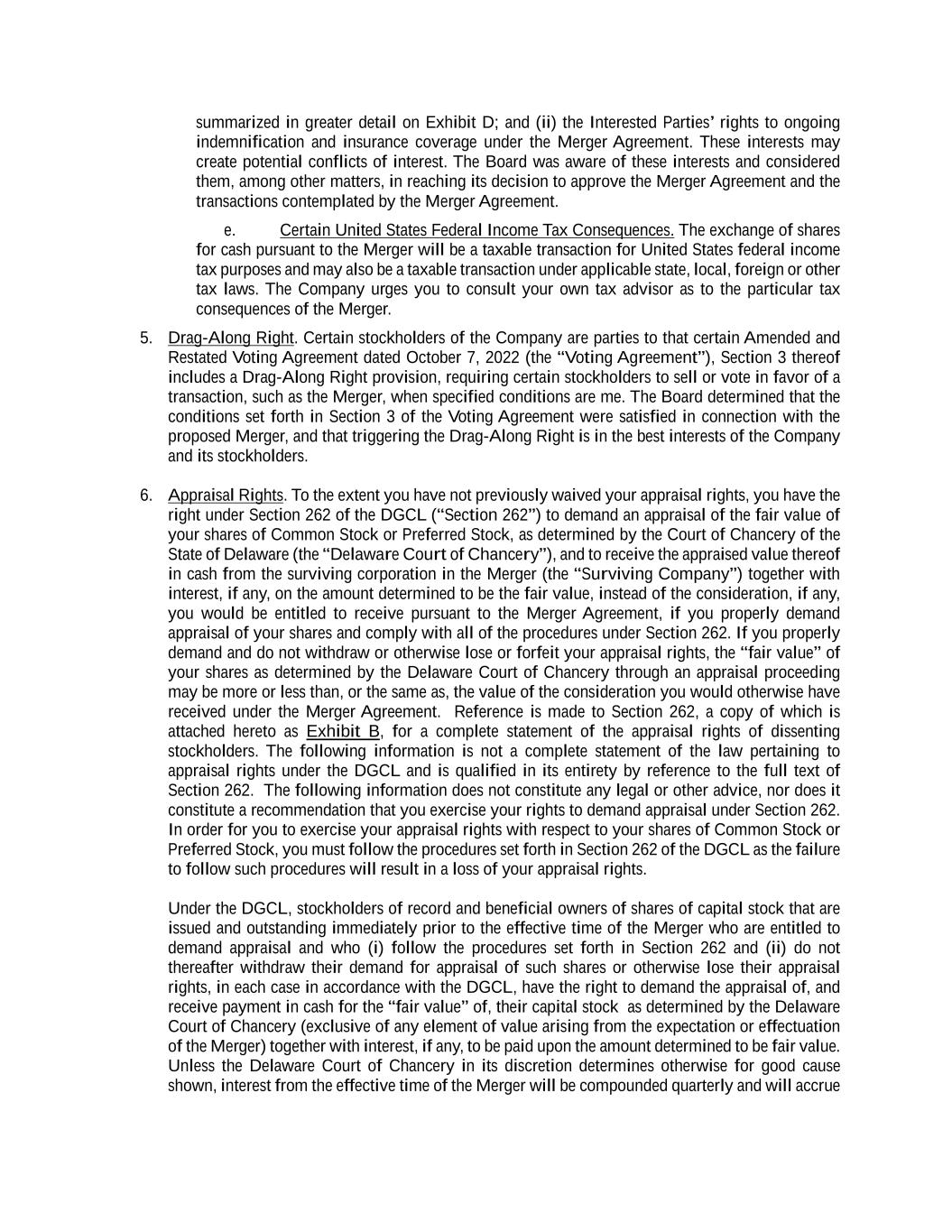 summarized in greater detail on Exhibit D; and (ii) the Interested Parties’ rights to ongoing indemnification and insurance coverage under the Merger Agreement. These interests may create potential conflicts of interest. The Board was aware of these interests and considered them, among other matters, in reaching its decision to approve the Merger Agreement and the transactions contemplated by the Merger Agreement. e. Certain United States Federal Income Tax Consequences. The exchange of shares for cash pursuant to the Merger will be a taxable transaction for United States federal income tax purposes and may also be a taxable transaction under applicable state, local, foreign or other tax laws. The Company urges you to consult your own tax advisor as to the particular tax consequences of the Merger. 5. Drag-Along Right. Certain stockholders of the Company are parties to that certain Amended and Restated Voting Agreement dated October 7, 2022 (the “Voting Agreement”), Section 3 thereof includes a Drag-Along Right provision, requiring certain stockholders to sell or vote in favor of a transaction, such as the Merger, when specified conditions are me. The Board determined that the conditions set forth in Section 3 of the Voting Agreement were satisfied in connection with the proposed Merger, and that triggering the Drag-Along Right is in the best interests of the Company and its stockholders. 6. Appraisal Rights. To the extent you have not previously waived your appraisal rights, you have the right under Section 262 of the DGCL (“Section 262”) to demand an appraisal of the fair value of your shares of Common Stock or Preferred Stock, as determined by the Court of Chancery of the State of Delaware (the “Delaware Court of Chancery”), and to receive the appraised value thereof in cash from the surviving corporation in the Merger (the “Surviving Company”) together with interest, if any, on the amount determined to be the fair value, instead of the consideration, if any, you would be entitled to receive pursuant to the Merger Agreement, if you properly demand appraisal of your shares and comply with all of the procedures under Section 262. If you properly demand and do not withdraw or otherwise lose or forfeit your appraisal rights, the “fair value” of your shares as determined by the Delaware Court of Chancery through an appraisal proceeding may be more or less than, or the same as, the value of the consideration you would otherwise have received under the Merger Agreement. Reference is made to Section 262, a copy of which is attached hereto as Exhibit B, for a complete statement of the appraisal rights of dissenting stockholders. The following information is not a complete statement of the law pertaining to appraisal rights under the DGCL and is qualified in its entirety by reference to the full text of Section 262. The following information does not constitute any legal or other advice, nor does it constitute a recommendation that you exercise your rights to demand appraisal under Section 262. In order for you to exercise your appraisal rights with respect to your shares of Common Stock or Preferred Stock, you must follow the procedures set forth in Section 262 of the DGCL as the failure to follow such procedures will result in a loss of your appraisal rights. Under the DGCL, stockholders of record and beneficial owners of shares of capital stock that are issued and outstanding immediately prior to the effective time of the Merger who are entitled to demand appraisal and who (i) follow the procedures set forth in Section 262 and (ii) do not thereafter withdraw their demand for appraisal of such shares or otherwise lose their appraisal rights, in each case in accordance with the DGCL, have the right to demand the appraisal of, and receive payment in cash for the “fair value” of, their capital stock as determined by the Delaware Court of Chancery (exclusive of any element of value arising from the expectation or effectuation of the Merger) together with interest, if any, to be paid upon the amount determined to be fair value. Unless the Delaware Court of Chancery in its discretion determines otherwise for good cause shown, interest from the effective time of the Merger will be compounded quarterly and will accrue