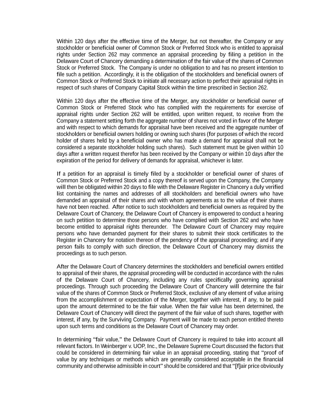 requires consideration of all relevant factors involving the value of a company.” The Delaware Supreme Court has stated that in making this determination of fair value, the court must consider market value, asset value, dividends, earnings prospects, the nature of the enterprise and any other facts which were known or which could be ascertained as of the date of the Merger which throw any light on future prospects of the merged corporation. Section 262 provides that fair value is to be “exclusive of any element of value arising from the accomplishment or expectation of the merger.” In Cede & Co. v. Technicolor, Inc., the Delaware Supreme Court stated that such exclusion is a “narrow exclusion [that] does not encompass known elements of value,” but which rather applies only to the speculative elements of value arising from such accomplishment or expectation. In Weinberger, the Delaware Supreme Court also stated that “elements of future value, including the nature of the enterprise, which are known or susceptible of proof as of the date of the Merger and not the product of speculation, may be considered.” In addition, the Delaware courts have decided that the statutory appraisal remedy, depending on factual circumstances, may or may not be a stockholder’s exclusive remedy. If any holder or beneficial owner of shares of Common Stock or Preferred Stock who demands appraisal under Section 262 of the DGCL fails to perfect, or effectively withdraws or otherwise loses his, her or its rights to appraisal with respect to such shares as provided in the DGCL, such shares will be deemed to have been converted into the right to receive the Merger Consideration as of the effective time of the Merger, without interest and subject to any applicable tax withholding, in accordance with the Merger Agreement. A stockholder or beneficial owner will fail to perfect, or effectively lose or withdraw, his, her or its right to appraisal if no petition for appraisal is filed within 120 days after the effective time of the Merger. Any stockholder or beneficial owner who has not commenced an appraisal proceeding or joined that proceeding as a named party may withdraw a demand for appraisal by delivering to the Company a written withdrawal of the demand for appraisal and acceptance of the terms of the Merger in accordance with Section 262 of the DGCL either within 60 days after the effective time of the Merger or thereafter with the written approval of the Company. Notwithstanding the foregoing, no appraisal proceeding in the Delaware Court of Chancery will be dismissed as to any stockholder or beneficial owner without the approval of the Delaware Court of Chancery, and such approval may be conditioned upon such terms as the Delaware Court of Chancery deems just; provided, however, that the limitation set forth in this sentence will not affect the right of any stockholder or beneficial owner who has not commenced an appraisal proceeding or joined that proceeding as a named party to withdraw such holder’s demand for appraisal and to accept the Merger Consideration within 60 days after the effective time of the Merger. The foregoing discussion is not a complete statement of applicable law pertaining to appraisal rights under Delaware law or a statement of the procedures to be followed by stockholders and beneficial owners desiring to exercise such appraisal rights and is qualified in its entirety by reference to Section 262 of the DGCL, the full text of which is set forth in Exhibit B hereto, which stockholders and beneficial owners are encouraged to read in its entirety. Any stockholder or beneficial owner who considers demanding appraisal is advised to consult legal counsel and financial advisors. The preservation and exercise of appraisal rights require strict and timely adherence to the applicable provisions of Delaware law. Failure to strictly comply with the procedures set forth in Section 262 of the DGCL will result in the loss of appraisal rights. To perfect appraisal rights in Delaware, you must, among other things, comply with the following procedures: (1) demand appraisal by sending an appraisal demand notice to the Company within 20 days after the date this Notice is given, (2) not vote in favor or otherwise consent to the Merger, and (3) maintain continuous ownership of Your Shares during the applicable period pursuant to