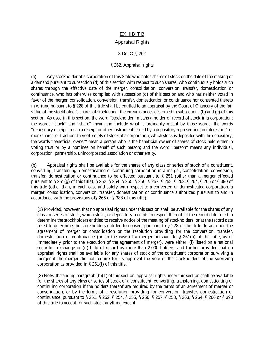 EXHIBIT B Appraisal Rights 8 Del.C. § 262 § 262. Appraisal rights (a) Any stockholder of a corporation of this State who holds shares of stock on the date of the making of a demand pursuant to subsection (d) of this section with respect to such shares, who continuously holds such shares through the effective date of the merger, consolidation, conversion, transfer, domestication or continuance, who has otherwise complied with subsection (d) of this section and who has neither voted in favor of the merger, consolidation, conversion, transfer, domestication or continuance nor consented thereto in writing pursuant to § 228 of this title shall be entitled to an appraisal by the Court of Chancery of the fair value of the stockholder's shares of stock under the circumstances described in subsections (b) and (c) of this section. As used in this section, the word “stockholder” means a holder of record of stock in a corporation; the words “stock” and “share” mean and include what is ordinarily meant by those words; the words “depository receipt” mean a receipt or other instrument issued by a depository representing an interest in 1 or more shares, or fractions thereof, solely of stock of a corporation, which stock is deposited with the depository; the words “beneficial owner” mean a person who is the beneficial owner of shares of stock held either in voting trust or by a nominee on behalf of such person; and the word “person” means any individual, corporation, partnership, unincorporated association or other entity. (b) Appraisal rights shall be available for the shares of any class or series of stock of a constituent, converting, transferring, domesticating or continuing corporation in a merger, consolidation, conversion, transfer, domestication or continuance to be effected pursuant to § 251 (other than a merger effected pursuant to § 251(g) of this title), § 252, § 254, § 255, § 256, § 257, § 258, § 263, § 264, § 266 or § 390 of this title (other than, in each case and solely with respect to a converted or domesticated corporation, a merger, consolidation, conversion, transfer, domestication or continuance authorized pursuant to and in accordance with the provisions of§ 265 or § 388 of this title): (1) Provided, however, that no appraisal rights under this section shall be available for the shares of any class or series of stock, which stock, or depository receipts in respect thereof, at the record date fixed to determine the stockholders entitled to receive notice of the meeting of stockholders, or at the record date fixed to determine the stockholders entitled to consent pursuant to § 228 of this title, to act upon the agreement of merger or consolidation or the resolution providing for the conversion, transfer, domestication or continuance (or, in the case of a merger pursuant to § 251(h) of this title, as of immediately prior to the execution of the agreement of merger), were either: (i) listed on a national securities exchange or (ii) held of record by more than 2,000 holders; and further provided that no appraisal rights shall be available for any shares of stock of the constituent corporation surviving a merger if the merger did not require for its approval the vote of the stockholders of the surviving corporation as provided in § 251(f) of this title. (2) Notwithstanding paragraph (b)(1) of this section, appraisal rights under this section shall be available for the shares of any class or series of stock of a constituent, converting, transferring, domesticating or continuing corporation if the holders thereof are required by the terms of an agreement of merger or consolidation, or by the terms of a resolution providing for conversion, transfer, domestication or continuance, pursuant to § 251, § 252, § 254, § 255, § 256, § 257, § 258, § 263, § 264, § 266 or § 390 of this title to accept for such stock anything except: