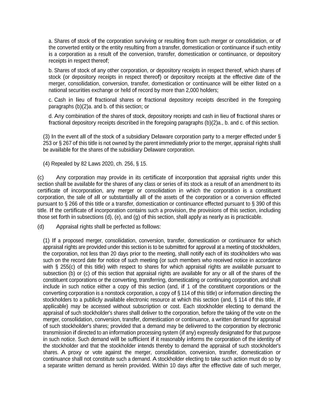 a. Shares of stock of the corporation surviving or resulting from such merger or consolidation, or of the converted entity or the entity resulting from a transfer, domestication or continuance if such entity is a corporation as a result of the conversion, transfer, domestication or continuance, or depository receipts in respect thereof; b. Shares of stock of any other corporation, or depository receipts in respect thereof, which shares of stock (or depository receipts in respect thereof) or depository receipts at the effective date of the merger, consolidation, conversion, transfer, domestication or continuance will be either listed on a national securities exchange or held of record by more than 2,000 holders; c. Cash in lieu of fractional shares or fractional depository receipts described in the foregoing paragraphs (b)(2)a. and b. of this section; or d. Any combination of the shares of stock, depository receipts and cash in lieu of fractional shares or fractional depository receipts described in the foregoing paragraphs (b)(2)a., b. and c. of this section. (3) In the event all of the stock of a subsidiary Delaware corporation party to a merger effected under § 253 or § 267 of this title is not owned by the parent immediately prior to the merger, appraisal rights shall be available for the shares of the subsidiary Delaware corporation. (4) Repealed by 82 Laws 2020, ch. 256, § 15. (c) Any corporation may provide in its certificate of incorporation that appraisal rights under this section shall be available for the shares of any class or series of its stock as a result of an amendment to its certificate of incorporation, any merger or consolidation in which the corporation is a constituent corporation, the sale of all or substantially all of the assets of the corporation or a conversion effected pursuant to § 266 of this title or a transfer, domestication or continuance effected pursuant to § 390 of this title. If the certificate of incorporation contains such a provision, the provisions of this section, including those set forth in subsections (d), (e), and (g) of this section, shall apply as nearly as is practicable. (d) Appraisal rights shall be perfected as follows: (1) If a proposed merger, consolidation, conversion, transfer, domestication or continuance for which appraisal rights are provided under this section is to be submitted for approval at a meeting of stockholders, the corporation, not less than 20 days prior to the meeting, shall notify each of its stockholders who was such on the record date for notice of such meeting (or such members who received notice in accordance with § 255(c) of this title) with respect to shares for which appraisal rights are available pursuant to subsection (b) or (c) of this section that appraisal rights are available for any or all of the shares of the constituent corporations or the converting, transferring, domesticating or continuing corporation, and shall include in such notice either a copy of this section (and, if 1 of the constituent corporations or the converting corporation is a nonstock corporation, a copy of § 114 of this title) or information directing the stockholders to a publicly available electronic resource at which this section (and, § 114 of this title, if applicable) may be accessed without subscription or cost. Each stockholder electing to demand the appraisal of such stockholder's shares shall deliver to the corporation, before the taking of the vote on the merger, consolidation, conversion, transfer, domestication or continuance, a written demand for appraisal of such stockholder's shares; provided that a demand may be delivered to the corporation by electronic transmission if directed to an information processing system (if any) expressly designated for that purpose in such notice. Such demand will be sufficient if it reasonably informs the corporation of the identity of the stockholder and that the stockholder intends thereby to demand the appraisal of such stockholder's shares. A proxy or vote against the merger, consolidation, conversion, transfer, domestication or continuance shall not constitute such a demand. A stockholder electing to take such action must do so by a separate written demand as herein provided. Within 10 days after the effective date of such merger,
