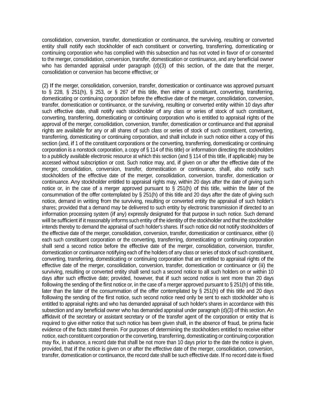 consolidation, conversion, transfer, domestication or continuance, the surviving, resulting or converted entity shall notify each stockholder of each constituent or converting, transferring, domesticating or continuing corporation who has complied with this subsection and has not voted in favor of or consented to the merger, consolidation, conversion, transfer, domestication or continuance, and any beneficial owner who has demanded appraisal under paragraph (d)(3) of this section, of the date that the merger, consolidation or conversion has become effective; or (2) If the merger, consolidation, conversion, transfer, domestication or continuance was approved pursuant to § 228, § 251(h), § 253, or § 267 of this title, then either a constituent, converting, transferring, domesticating or continuing corporation before the effective date of the merger, consolidation, conversion, transfer, domestication or continuance, or the surviving, resulting or converted entity within 10 days after such effective date, shall notify each stockholder of any class or series of stock of such constituent, converting, transferring, domesticating or continuing corporation who is entitled to appraisal rights of the approval of the merger, consolidation, conversion, transfer, domestication or continuance and that appraisal rights are available for any or all shares of such class or series of stock of such constituent, converting, transferring, domesticating or continuing corporation, and shall include in such notice either a copy of this section (and, if 1 of the constituent corporations or the converting, transferring, domesticating or continuing corporation is a nonstock corporation, a copy of § 114 of this title) or information directing the stockholders to a publicly available electronic resource at which this section (and § 114 of this title, if applicable) may be accessed without subscription or cost. Such notice may, and, if given on or after the effective date of the merger, consolidation, conversion, transfer, domestication or continuance, shall, also notify such stockholders of the effective date of the merger, consolidation, conversion, transfer, domestication or continuance. Any stockholder entitled to appraisal rights may, within 20 days after the date of giving such notice or, in the case of a merger approved pursuant to § 251(h) of this title, within the later of the consummation of the offer contemplated by § 251(h) of this title and 20 days after the date of giving such notice, demand in writing from the surviving, resulting or converted entity the appraisal of such holder's shares; provided that a demand may be delivered to such entity by electronic transmission if directed to an information processing system (if any) expressly designated for that purpose in such notice. Such demand will be sufficient if it reasonably informs such entity of the identity of the stockholder and that the stockholder intends thereby to demand the appraisal of such holder's shares. If such notice did not notify stockholders of the effective date of the merger, consolidation, conversion, transfer, domestication or continuance, either (i) each such constituent corporation or the converting, transferring, domesticating or continuing corporation shall send a second notice before the effective date of the merger, consolidation, conversion, transfer, domestication or continuance notifying each of the holders of any class or series of stock of such constituent, converting, transferring, domesticating or continuing corporation that are entitled to appraisal rights of the effective date of the merger, consolidation, conversion, transfer, domestication or continuance or (ii) the surviving, resulting or converted entity shall send such a second notice to all such holders on or within 10 days after such effective date; provided, however, that if such second notice is sent more than 20 days following the sending of the first notice or, in the case of a merger approved pursuant to § 251(h) of this title, later than the later of the consummation of the offer contemplated by § 251(h) of this title and 20 days following the sending of the first notice, such second notice need only be sent to each stockholder who is entitled to appraisal rights and who has demanded appraisal of such holder's shares in accordance with this subsection and any beneficial owner who has demanded appraisal under paragraph (d)(3) of this section. An affidavit of the secretary or assistant secretary or of the transfer agent of the corporation or entity that is required to give either notice that such notice has been given shall, in the absence of fraud, be prima facie evidence of the facts stated therein. For purposes of determining the stockholders entitled to receive either notice, each constituent corporation or the converting, transferring, domesticating or continuing corporation may fix, in advance, a record date that shall be not more than 10 days prior to the date the notice is given, provided, that if the notice is given on or after the effective date of the merger, consolidation, conversion, transfer, domestication or continuance, the record date shall be such effective date. If no record date is fixed