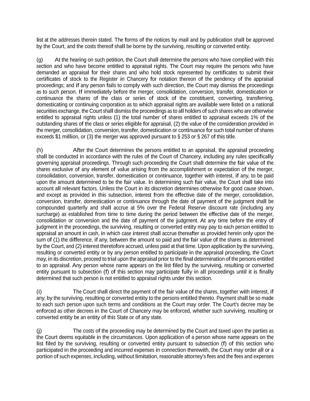 list at the addresses therein stated. The forms of the notices by mail and by publication shall be approved by the Court, and the costs thereof shall be borne by the surviving, resulting or converted entity. (g) At the hearing on such petition, the Court shall determine the persons who have complied with this section and who have become entitled to appraisal rights. The Court may require the persons who have demanded an appraisal for their shares and who hold stock represented by certificates to submit their certificates of stock to the Register in Chancery for notation thereon of the pendency of the appraisal proceedings; and if any person fails to comply with such direction, the Court may dismiss the proceedings as to such person. If immediately before the merger, consolidation, conversion, transfer, domestication or continuance the shares of the class or series of stock of the constituent, converting, transferring, domesticating or continuing corporation as to which appraisal rights are available were listed on a national securities exchange, the Court shall dismiss the proceedings as to all holders of such shares who are otherwise entitled to appraisal rights unless (1) the total number of shares entitled to appraisal exceeds 1% of the outstanding shares of the class or series eligible for appraisal, (2) the value of the consideration provided in the merger, consolidation, conversion, transfer, domestication or continuance for such total number of shares exceeds $1 million, or (3) the merger was approved pursuant to § 253 or § 267 of this title. (h) After the Court determines the persons entitled to an appraisal, the appraisal proceeding shall be conducted in accordance with the rules of the Court of Chancery, including any rules specifically governing appraisal proceedings. Through such proceeding the Court shall determine the fair value of the shares exclusive of any element of value arising from the accomplishment or expectation of the merger, consolidation, conversion, transfer, domestication or continuance, together with interest, if any, to be paid upon the amount determined to be the fair value. In determining such fair value, the Court shall take into account all relevant factors. Unless the Court in its discretion determines otherwise for good cause shown, and except as provided in this subsection, interest from the effective date of the merger, consolidation, conversion, transfer, domestication or continuance through the date of payment of the judgment shall be compounded quarterly and shall accrue at 5% over the Federal Reserve discount rate (including any surcharge) as established from time to time during the period between the effective date of the merger, consolidation or conversion and the date of payment of the judgment. At any time before the entry of judgment in the proceedings, the surviving, resulting or converted entity may pay to each person entitled to appraisal an amount in cash, in which case interest shall accrue thereafter as provided herein only upon the sum of (1) the difference, if any, between the amount so paid and the fair value of the shares as determined by the Court, and (2) interest theretofore accrued, unless paid at that time. Upon application by the surviving, resulting or converted entity or by any person entitled to participate in the appraisal proceeding, the Court may, in its discretion, proceed to trial upon the appraisal prior to the final determination of the persons entitled to an appraisal. Any person whose name appears on the list filed by the surviving, resulting or converted entity pursuant to subsection (f) of this section may participate fully in all proceedings until it is finally determined that such person is not entitled to appraisal rights under this section. (i) The Court shall direct the payment of the fair value of the shares, together with interest, if any, by the surviving, resulting or converted entity to the persons entitled thereto. Payment shall be so made to each such person upon such terms and conditions as the Court may order. The Court's decree may be enforced as other decrees in the Court of Chancery may be enforced, whether such surviving, resulting or converted entity be an entity of this State or of any state. (j) The costs of the proceeding may be determined by the Court and taxed upon the parties as the Court deems equitable in the circumstances. Upon application of a person whose name appears on the list filed by the surviving, resulting or converted entity pursuant to subsection (f) of this section who participated in the proceeding and incurred expenses in connection therewith, the Court may order all or a portion of such expenses, including, without limitation, reasonable attorney's fees and the fees and expenses