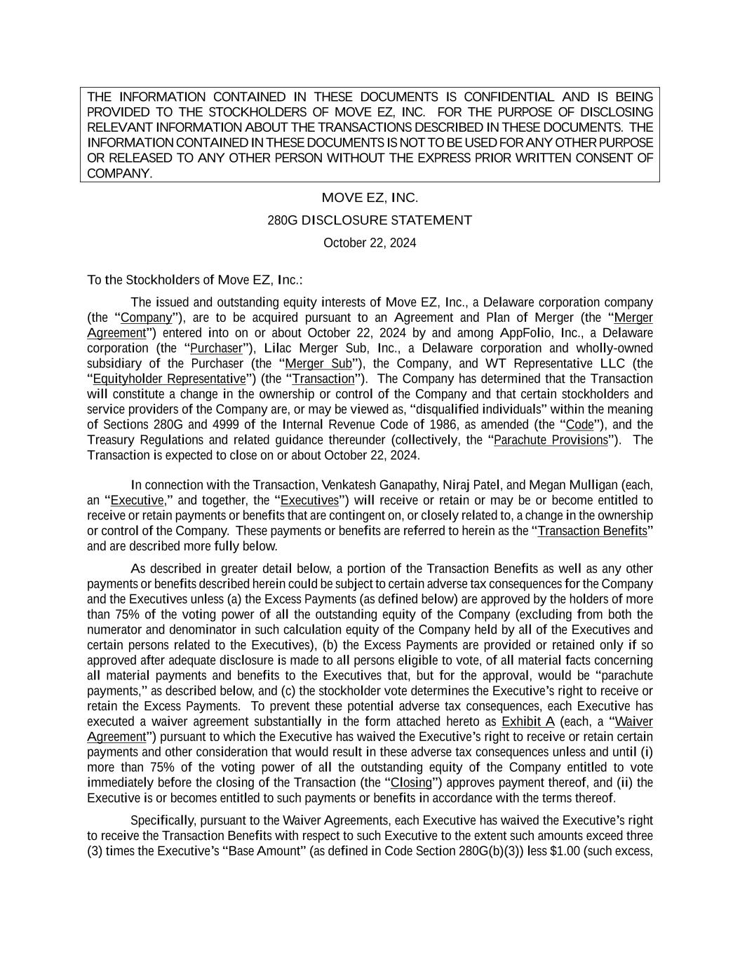 THE INFORMATION CONTAINED IN THESE DOCUMENTS IS CONFIDENTIAL AND IS BEING PROVIDED TO THE STOCKHOLDERS OF MOVE EZ, INC. FOR THE PURPOSE OF DISCLOSING RELEVANT INFORMATION ABOUT THE TRANSACTIONS DESCRIBED IN THESE DOCUMENTS. THE INFORMATION CONTAINED IN THESE DOCUMENTS IS NOT TO BE USED FOR ANY OTHER PURPOSE OR RELEASED TO ANY OTHER PERSON WITHOUT THE EXPRESS PRIOR WRITTEN CONSENT OF COMPANY. MOVE EZ, INC. 280G DISCLOSURE STATEMENT October 22, 2024 To the Stockholders of Move EZ, Inc.: The issued and outstanding equity interests of Move EZ, Inc., a Delaware corporation company (the “Company”), are to be acquired pursuant to an Agreement and Plan of Merger (the “Merger Agreement”) entered into on or about October 22, 2024 by and among AppFolio, Inc., a Delaware corporation (the “Purchaser”), Lilac Merger Sub, Inc., a Delaware corporation and wholly-owned subsidiary of the Purchaser (the “Merger Sub”), the Company, and WT Representative LLC (the “Equityholder Representative”) (the “Transaction”). The Company has determined that the Transaction will constitute a change in the ownership or control of the Company and that certain stockholders and service providers of the Company are, or may be viewed as, “disqualified individuals” within the meaning of Sections 280G and 4999 of the Internal Revenue Code of 1986, as amended (the “Code”), and the Treasury Regulations and related guidance thereunder (collectively, the “Parachute Provisions”). The Transaction is expected to close on or about October 22, 2024. In connection with the Transaction, Venkatesh Ganapathy, Niraj Patel, and Megan Mulligan (each, an “Executive,” and together, the “Executives”) will receive or retain or may be or become entitled to receive or retain payments or benefits that are contingent on, or closely related to, a change in the ownership or control of the Company. These payments or benefits are referred to herein as the “Transaction Benefits” and are described more fully below. As described in greater detail below, a portion of the Transaction Benefits as well as any other payments or benefits described herein could be subject to certain adverse tax consequences for the Company and the Executives unless (a) the Excess Payments (as defined below) are approved by the holders of more than 75% of the voting power of all the outstanding equity of the Company (excluding from both the numerator and denominator in such calculation equity of the Company held by all of the Executives and certain persons related to the Executives), (b) the Excess Payments are provided or retained only if so approved after adequate disclosure is made to all persons eligible to vote, of all material facts concerning all material payments and benefits to the Executives that, but for the approval, would be “parachute payments,” as described below, and (c) the stockholder vote determines the Executive’s right to receive or retain the Excess Payments. To prevent these potential adverse tax consequences, each Executive has executed a waiver agreement substantially in the form attached hereto as Exhibit A (each, a “Waiver Agreement”) pursuant to which the Executive has waived the Executive’s right to receive or retain certain payments and other consideration that would result in these adverse tax consequences unless and until (i) more than 75% of the voting power of all the outstanding equity of the Company entitled to vote immediately before the closing of the Transaction (the “Closing”) approves payment thereof, and (ii) the Executive is or becomes entitled to such payments or benefits in accordance with the terms thereof. Specifically, pursuant to the Waiver Agreements, each Executive has waived the Executive’s right to receive the Transaction Benefits with respect to such Executive to the extent such amounts exceed three (3) times the Executive’s “Base Amount” (as defined in Code Section 280G(b)(3)) less $1.00 (such excess,
