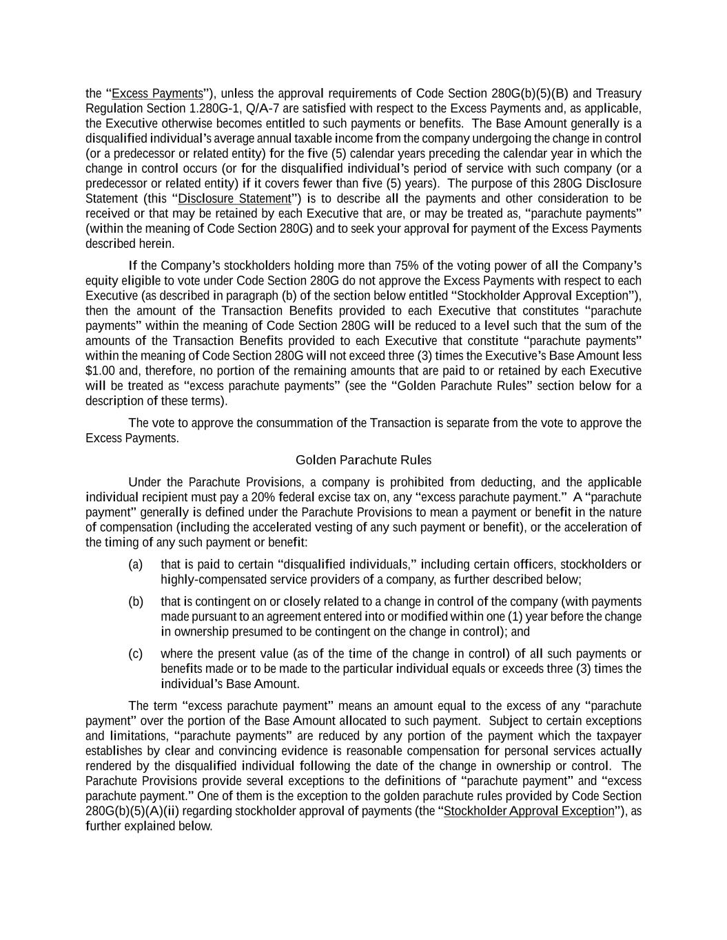 the “Excess Payments”), unless the approval requirements of Code Section 280G(b)(5)(B) and Treasury Regulation Section 1.280G-1, Q/A-7 are satisfied with respect to the Excess Payments and, as applicable, the Executive otherwise becomes entitled to such payments or benefits. The Base Amount generally is a disqualified individual’s average annual taxable income from the company undergoing the change in control (or a predecessor or related entity) for the five (5) calendar years preceding the calendar year in which the change in control occurs (or for the disqualified individual’s period of service with such company (or a predecessor or related entity) if it covers fewer than five (5) years). The purpose of this 280G Disclosure Statement (this “Disclosure Statement”) is to describe all the payments and other consideration to be received or that may be retained by each Executive that are, or may be treated as, “parachute payments” (within the meaning of Code Section 280G) and to seek your approval for payment of the Excess Payments described herein. If the Company’s stockholders holding more than 75% of the voting power of all the Company’s equity eligible to vote under Code Section 280G do not approve the Excess Payments with respect to each Executive (as described in paragraph (b) of the section below entitled “Stockholder Approval Exception”), then the amount of the Transaction Benefits provided to each Executive that constitutes “parachute payments” within the meaning of Code Section 280G will be reduced to a level such that the sum of the amounts of the Transaction Benefits provided to each Executive that constitute “parachute payments” within the meaning of Code Section 280G will not exceed three (3) times the Executive’s Base Amount less $1.00 and, therefore, no portion of the remaining amounts that are paid to or retained by each Executive will be treated as “excess parachute payments” (see the “Golden Parachute Rules” section below for a description of these terms). The vote to approve the consummation of the Transaction is separate from the vote to approve the Excess Payments. Golden Parachute Rules Under the Parachute Provisions, a company is prohibited from deducting, and the applicable individual recipient must pay a 20% federal excise tax on, any “excess parachute payment.” A “parachute payment” generally is defined under the Parachute Provisions to mean a payment or benefit in the nature of compensation (including the accelerated vesting of any such payment or benefit), or the acceleration of the timing of any such payment or benefit: (a) that is paid to certain “disqualified individuals,” including certain officers, stockholders or highly-compensated service providers of a company, as further described below; (b) that is contingent on or closely related to a change in control of the company (with payments made pursuant to an agreement entered into or modified within one (1) year before the change in ownership presumed to be contingent on the change in control); and (c) where the present value (as of the time of the change in control) of all such payments or benefits made or to be made to the particular individual equals or exceeds three (3) times the individual’s Base Amount. The term “excess parachute payment” means an amount equal to the excess of any “parachute payment” over the portion of the Base Amount allocated to such payment. Subject to certain exceptions and limitations, “parachute payments” are reduced by any portion of the payment which the taxpayer establishes by clear and convincing evidence is reasonable compensation for personal services actually rendered by the disqualified individual following the date of the change in ownership or control. The Parachute Provisions provide several exceptions to the definitions of “parachute payment” and “excess parachute payment.” One of them is the exception to the golden parachute rules provided by Code Section 280G(b)(5)(A)(ii) regarding stockholder approval of payments (the “Stockholder Approval Exception”), as further explained below.