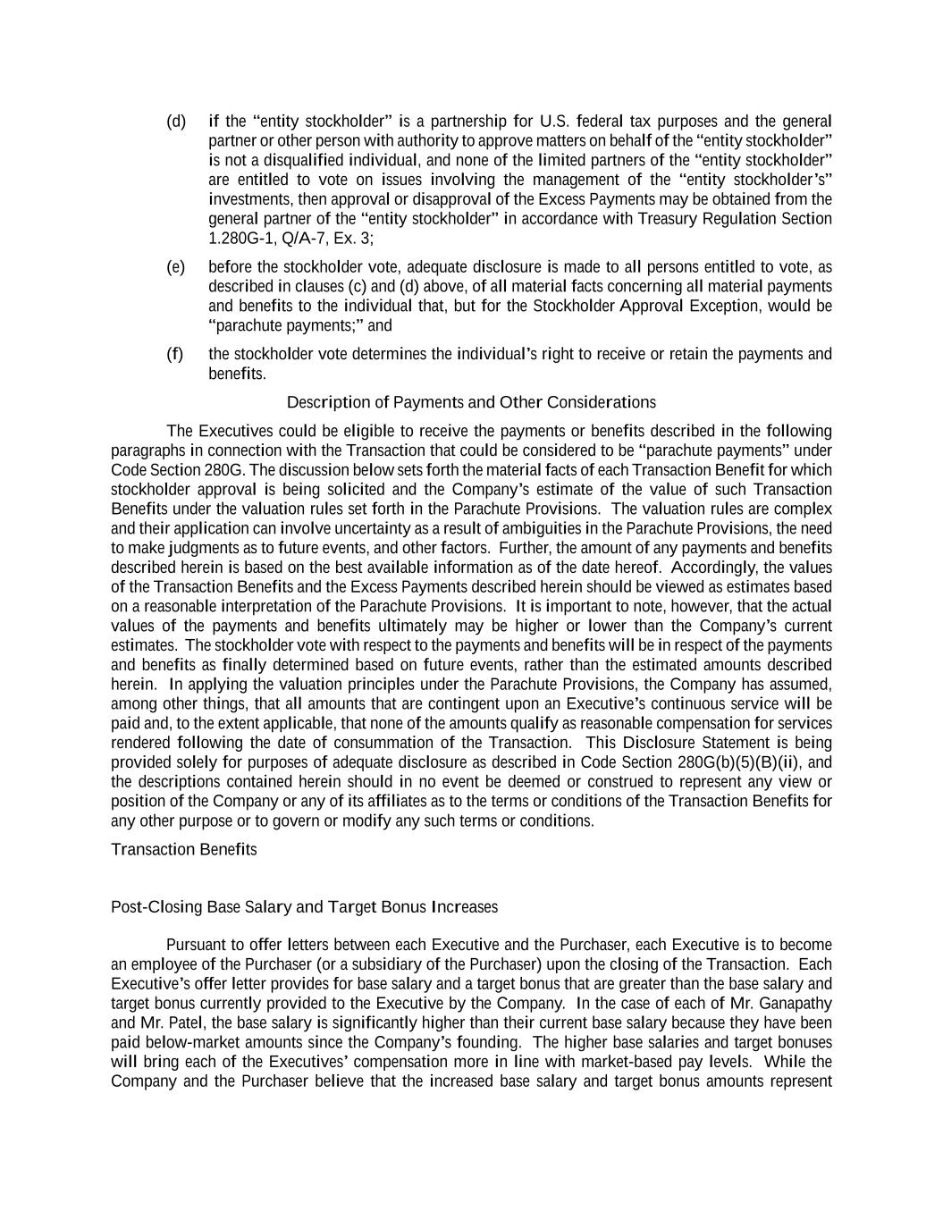 (d) if the “entity stockholder” is a partnership for U.S. federal tax purposes and the general partner or other person with authority to approve matters on behalf of the “entity stockholder” is not a disqualified individual, and none of the limited partners of the “entity stockholder” are entitled to vote on issues involving the management of the “entity stockholder’s” investments, then approval or disapproval of the Excess Payments may be obtained from the general partner of the “entity stockholder” in accordance with Treasury Regulation Section 1.280G-1, Q/A-7, Ex. 3; (e) before the stockholder vote, adequate disclosure is made to all persons entitled to vote, as described in clauses (c) and (d) above, of all material facts concerning all material payments and benefits to the individual that, but for the Stockholder Approval Exception, would be “parachute payments;” and (f) the stockholder vote determines the individual’s right to receive or retain the payments and benefits. Description of Payments and Other Considerations The Executives could be eligible to receive the payments or benefits described in the following paragraphs in connection with the Transaction that could be considered to be “parachute payments” under Code Section 280G. The discussion below sets forth the material facts of each Transaction Benefit for which stockholder approval is being solicited and the Company’s estimate of the value of such Transaction Benefits under the valuation rules set forth in the Parachute Provisions. The valuation rules are complex and their application can involve uncertainty as a result of ambiguities in the Parachute Provisions, the need to make judgments as to future events, and other factors. Further, the amount of any payments and benefits described herein is based on the best available information as of the date hereof. Accordingly, the values of the Transaction Benefits and the Excess Payments described herein should be viewed as estimates based on a reasonable interpretation of the Parachute Provisions. It is important to note, however, that the actual values of the payments and benefits ultimately may be higher or lower than the Company’s current estimates. The stockholder vote with respect to the payments and benefits will be in respect of the payments and benefits as finally determined based on future events, rather than the estimated amounts described herein. In applying the valuation principles under the Parachute Provisions, the Company has assumed, among other things, that all amounts that are contingent upon an Executive’s continuous service will be paid and, to the extent applicable, that none of the amounts qualify as reasonable compensation for services rendered following the date of consummation of the Transaction. This Disclosure Statement is being provided solely for purposes of adequate disclosure as described in Code Section 280G(b)(5)(B)(ii), and the descriptions contained herein should in no event be deemed or construed to represent any view or position of the Company or any of its affiliates as to the terms or conditions of the Transaction Benefits for any other purpose or to govern or modify any such terms or conditions. Transaction Benefits Post-Closing Base Salary and Target Bonus Increases Pursuant to offer letters between each Executive and the Purchaser, each Executive is to become an employee of the Purchaser (or a subsidiary of the Purchaser) upon the closing of the Transaction. Each Executive’s offer letter provides for base salary and a target bonus that are greater than the base salary and target bonus currently provided to the Executive by the Company. In the case of each of Mr. Ganapathy and Mr. Patel, the base salary is significantly higher than their current base salary because they have been paid below-market amounts since the Company’s founding. The higher base salaries and target bonuses will bring each of the Executives’ compensation more in line with market-based pay levels. While the Company and the Purchaser believe that the increased base salary and target bonus amounts represent