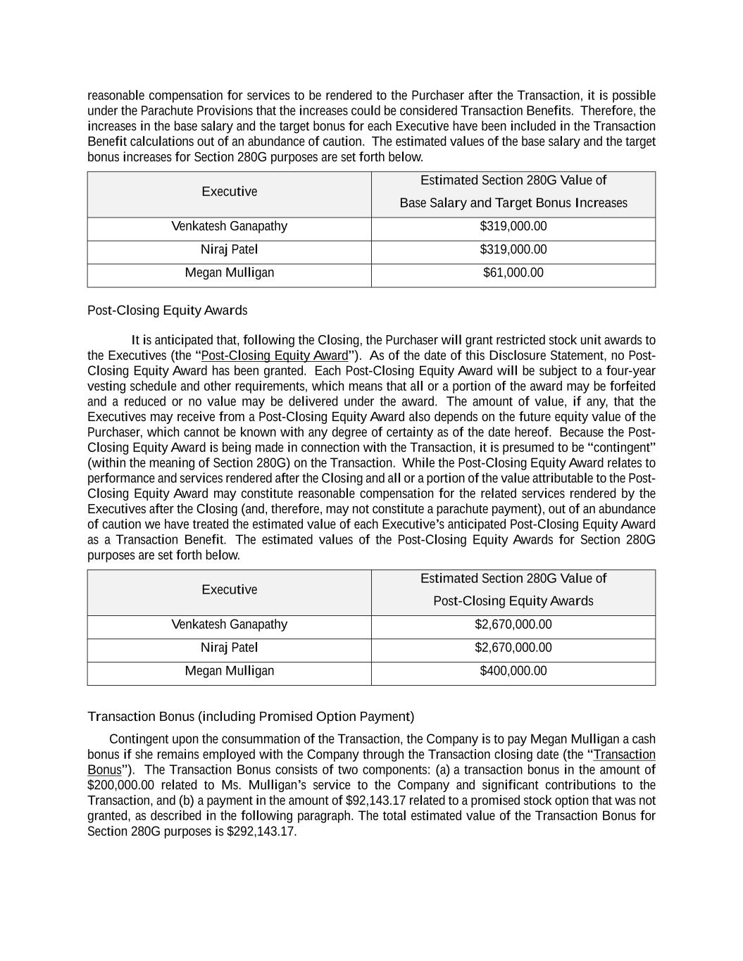 reasonable compensation for services to be rendered to the Purchaser after the Transaction, it is possible under the Parachute Provisions that the increases could be considered Transaction Benefits. Therefore, the increases in the base salary and the target bonus for each Executive have been included in the Transaction Benefit calculations out of an abundance of caution. The estimated values of the base salary and the target bonus increases for Section 280G purposes are set forth below. Executive Estimated Section 280G Value of Base Salary and Target Bonus Increases Venkatesh Ganapathy $319,000.00 Niraj Patel $319,000.00 Megan Mulligan $61,000.00 Post-Closing Equity Awards It is anticipated that, following the Closing, the Purchaser will grant restricted stock unit awards to the Executives (the “Post-Closing Equity Award”). As of the date of this Disclosure Statement, no Post- Closing Equity Award has been granted. Each Post-Closing Equity Award will be subject to a four-year vesting schedule and other requirements, which means that all or a portion of the award may be forfeited and a reduced or no value may be delivered under the award. The amount of value, if any, that the Executives may receive from a Post-Closing Equity Award also depends on the future equity value of the Purchaser, which cannot be known with any degree of certainty as of the date hereof. Because the Post- Closing Equity Award is being made in connection with the Transaction, it is presumed to be “contingent” (within the meaning of Section 280G) on the Transaction. While the Post-Closing Equity Award relates to performance and services rendered after the Closing and all or a portion of the value attributable to the Post- Closing Equity Award may constitute reasonable compensation for the related services rendered by the Executives after the Closing (and, therefore, may not constitute a parachute payment), out of an abundance of caution we have treated the estimated value of each Executive’s anticipated Post-Closing Equity Award as a Transaction Benefit. The estimated values of the Post-Closing Equity Awards for Section 280G purposes are set forth below. Executive Estimated Section 280G Value of Post-Closing Equity Awards Venkatesh Ganapathy $2,670,000.00 Niraj Patel $2,670,000.00 Megan Mulligan $400,000.00 Transaction Bonus (including Promised Option Payment) Contingent upon the consummation of the Transaction, the Company is to pay Megan Mulligan a cash bonus if she remains employed with the Company through the Transaction closing date (the “Transaction Bonus”). The Transaction Bonus consists of two components: (a) a transaction bonus in the amount of $200,000.00 related to Ms. Mulligan’s service to the Company and significant contributions to the Transaction, and (b) a payment in the amount of $92,143.17 related to a promised stock option that was not granted, as described in the following paragraph. The total estimated value of the Transaction Bonus for Section 280G purposes is $292,143.17.