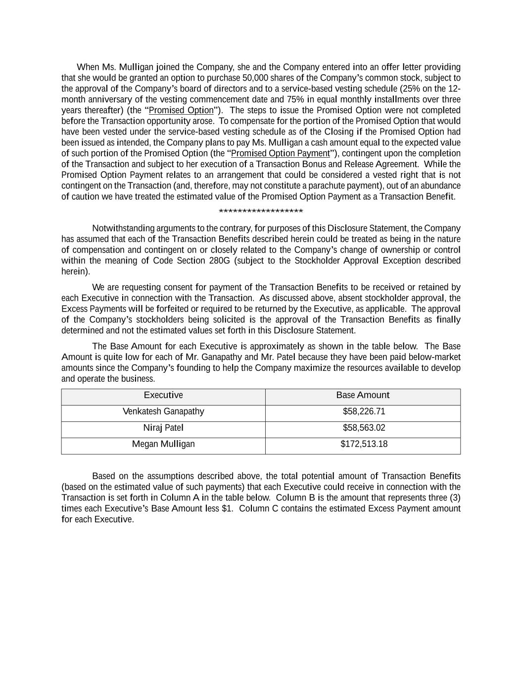 When Ms. Mulligan joined the Company, she and the Company entered into an offer letter providing that she would be granted an option to purchase 50,000 shares of the Company’s common stock, subject to the approval of the Company’s board of directors and to a service-based vesting schedule (25% on the 12- month anniversary of the vesting commencement date and 75% in equal monthly installments over three years thereafter) (the “Promised Option”). The steps to issue the Promised Option were not completed before the Transaction opportunity arose. To compensate for the portion of the Promised Option that would have been vested under the service-based vesting schedule as of the Closing if the Promised Option had been issued as intended, the Company plans to pay Ms. Mulligan a cash amount equal to the expected value of such portion of the Promised Option (the “Promised Option Payment”), contingent upon the completion of the Transaction and subject to her execution of a Transaction Bonus and Release Agreement. While the Promised Option Payment relates to an arrangement that could be considered a vested right that is not contingent on the Transaction (and, therefore, may not constitute a parachute payment), out of an abundance of caution we have treated the estimated value of the Promised Option Payment as a Transaction Benefit. ****************** Notwithstanding arguments to the contrary, for purposes of this Disclosure Statement, the Company has assumed that each of the Transaction Benefits described herein could be treated as being in the nature of compensation and contingent on or closely related to the Company’s change of ownership or control within the meaning of Code Section 280G (subject to the Stockholder Approval Exception described herein). We are requesting consent for payment of the Transaction Benefits to be received or retained by each Executive in connection with the Transaction. As discussed above, absent stockholder approval, the Excess Payments will be forfeited or required to be returned by the Executive, as applicable. The approval of the Company’s stockholders being solicited is the approval of the Transaction Benefits as finally determined and not the estimated values set forth in this Disclosure Statement. The Base Amount for each Executive is approximately as shown in the table below. The Base Amount is quite low for each of Mr. Ganapathy and Mr. Patel because they have been paid below-market amounts since the Company’s founding to help the Company maximize the resources available to develop and operate the business. Executive Base Amount Venkatesh Ganapathy $58,226.71 Niraj Patel $58,563.02 Megan Mulligan $172,513.18 Based on the assumptions described above, the total potential amount of Transaction Benefits (based on the estimated value of such payments) that each Executive could receive in connection with the Transaction is set forth in Column A in the table below. Column B is the amount that represents three (3) times each Executive’s Base Amount less $1. Column C contains the estimated Excess Payment amount for each Executive.