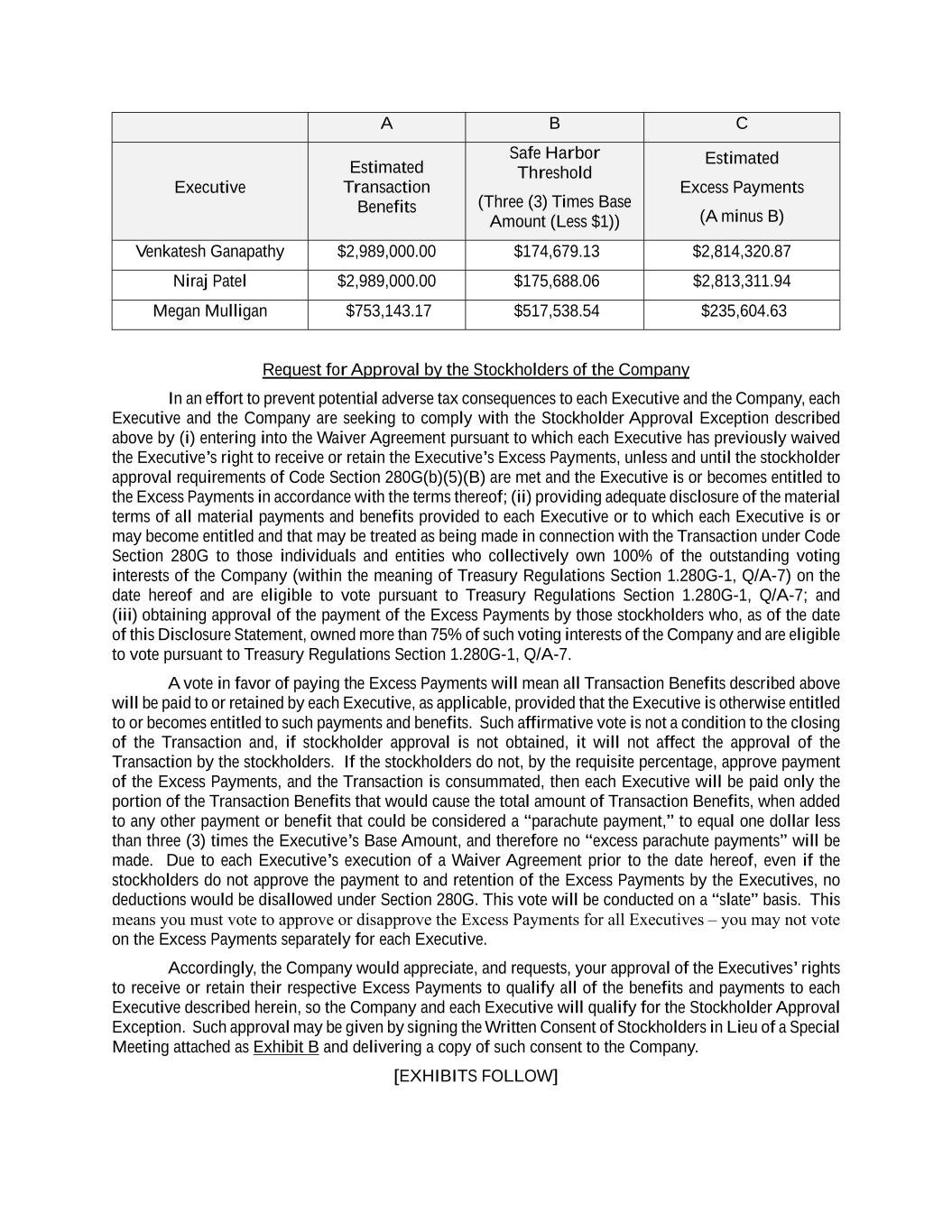 A B C Executive Estimated Transaction Benefits Safe Harbor Threshold (Three (3) Times Base Amount (Less $1)) Estimated Excess Payments (A minus B) Venkatesh Ganapathy $2,989,000.00 $174,679.13 $2,814,320.87 Niraj Patel $2,989,000.00 $175,688.06 $2,813,311.94 Megan Mulligan $753,143.17 $517,538.54 $235,604.63 Request for Approval by the Stockholders of the Company In an effort to prevent potential adverse tax consequences to each Executive and the Company, each Executive and the Company are seeking to comply with the Stockholder Approval Exception described above by (i) entering into the Waiver Agreement pursuant to which each Executive has previously waived the Executive’s right to receive or retain the Executive’s Excess Payments, unless and until the stockholder approval requirements of Code Section 280G(b)(5)(B) are met and the Executive is or becomes entitled to the Excess Payments in accordance with the terms thereof; (ii) providing adequate disclosure of the material terms of all material payments and benefits provided to each Executive or to which each Executive is or may become entitled and that may be treated as being made in connection with the Transaction under Code Section 280G to those individuals and entities who collectively own 100% of the outstanding voting interests of the Company (within the meaning of Treasury Regulations Section 1.280G-1, Q/A-7) on the date hereof and are eligible to vote pursuant to Treasury Regulations Section 1.280G-1, Q/A-7; and (iii) obtaining approval of the payment of the Excess Payments by those stockholders who, as of the date of this Disclosure Statement, owned more than 75% of such voting interests of the Company and are eligible to vote pursuant to Treasury Regulations Section 1.280G-1, Q/A-7. A vote in favor of paying the Excess Payments will mean all Transaction Benefits described above will be paid to or retained by each Executive, as applicable, provided that the Executive is otherwise entitled to or becomes entitled to such payments and benefits. Such affirmative vote is not a condition to the closing of the Transaction and, if stockholder approval is not obtained, it will not affect the approval of the Transaction by the stockholders. If the stockholders do not, by the requisite percentage, approve payment of the Excess Payments, and the Transaction is consummated, then each Executive will be paid only the portion of the Transaction Benefits that would cause the total amount of Transaction Benefits, when added to any other payment or benefit that could be considered a “parachute payment,” to equal one dollar less than three (3) times the Executive’s Base Amount, and therefore no “excess parachute payments” will be made. Due to each Executive’s execution of a Waiver Agreement prior to the date hereof, even if the stockholders do not approve the payment to and retention of the Excess Payments by the Executives, no deductions would be disallowed under Section 280G. This vote will be conducted on a “slate” basis. This means you must vote to approve or disapprove the Excess Payments for all Executives ‒ you may not vote on the Excess Payments separately for each Executive. Accordingly, the Company would appreciate, and requests, your approval of the Executives’ rights to receive or retain their respective Excess Payments to qualify all of the benefits and payments to each Executive described herein, so the Company and each Executive will qualify for the Stockholder Approval Exception. Such approval may be given by signing the Written Consent of Stockholders in Lieu of a Special Meeting attached as Exhibit B and delivering a copy of such consent to the Company. [EXHIBITS FOLLOW]