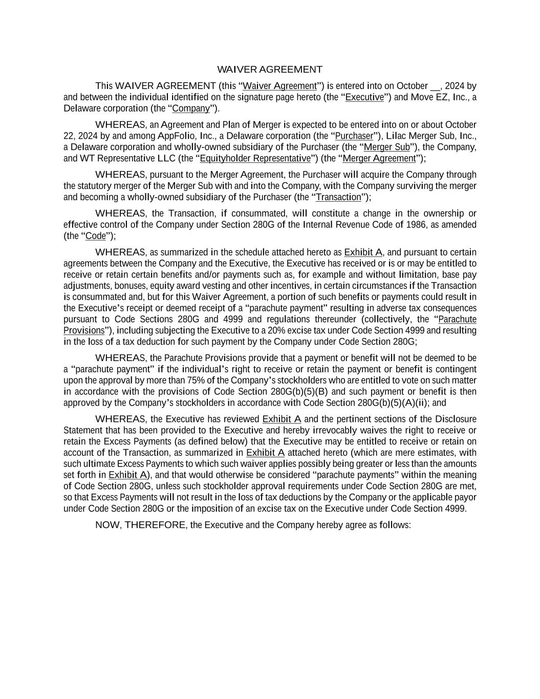 WAIVER AGREEMENT This WAIVER AGREEMENT (this “Waiver Agreement”) is entered into on October __, 2024 by and between the individual identified on the signature page hereto (the “Executive”) and Move EZ, Inc., a Delaware corporation (the “Company”). WHEREAS, an Agreement and Plan of Merger is expected to be entered into on or about October 22, 2024 by and among AppFolio, Inc., a Delaware corporation (the “Purchaser”), Lilac Merger Sub, Inc., a Delaware corporation and wholly-owned subsidiary of the Purchaser (the “Merger Sub”), the Company, and WT Representative LLC (the “Equityholder Representative”) (the “Merger Agreement”); WHEREAS, pursuant to the Merger Agreement, the Purchaser will acquire the Company through the statutory merger of the Merger Sub with and into the Company, with the Company surviving the merger and becoming a wholly-owned subsidiary of the Purchaser (the “Transaction”); WHEREAS, the Transaction, if consummated, will constitute a change in the ownership or effective control of the Company under Section 280G of the Internal Revenue Code of 1986, as amended (the “Code”); WHEREAS, as summarized in the schedule attached hereto as Exhibit A, and pursuant to certain agreements between the Company and the Executive, the Executive has received or is or may be entitled to receive or retain certain benefits and/or payments such as, for example and without limitation, base pay adjustments, bonuses, equity award vesting and other incentives, in certain circumstances if the Transaction is consummated and, but for this Waiver Agreement, a portion of such benefits or payments could result in the Executive’s receipt or deemed receipt of a “parachute payment” resulting in adverse tax consequences pursuant to Code Sections 280G and 4999 and regulations thereunder (collectively, the “Parachute Provisions”), including subjecting the Executive to a 20% excise tax under Code Section 4999 and resulting in the loss of a tax deduction for such payment by the Company under Code Section 280G; WHEREAS, the Parachute Provisions provide that a payment or benefit will not be deemed to be a “parachute payment” if the individual’s right to receive or retain the payment or benefit is contingent upon the approval by more than 75% of the Company’s stockholders who are entitled to vote on such matter in accordance with the provisions of Code Section 280G(b)(5)(B) and such payment or benefit is then approved by the Company’s stockholders in accordance with Code Section 280G(b)(5)(A)(ii); and WHEREAS, the Executive has reviewed Exhibit A and the pertinent sections of the Disclosure Statement that has been provided to the Executive and hereby irrevocably waives the right to receive or retain the Excess Payments (as defined below) that the Executive may be entitled to receive or retain on account of the Transaction, as summarized in Exhibit A attached hereto (which are mere estimates, with such ultimate Excess Payments to which such waiver applies possibly being greater or less than the amounts set forth in Exhibit A), and that would otherwise be considered “parachute payments” within the meaning of Code Section 280G, unless such stockholder approval requirements under Code Section 280G are met, so that Excess Payments will not result in the loss of tax deductions by the Company or the applicable payor under Code Section 280G or the imposition of an excise tax on the Executive under Code Section 4999. NOW, THEREFORE, the Executive and the Company hereby agree as follows:
