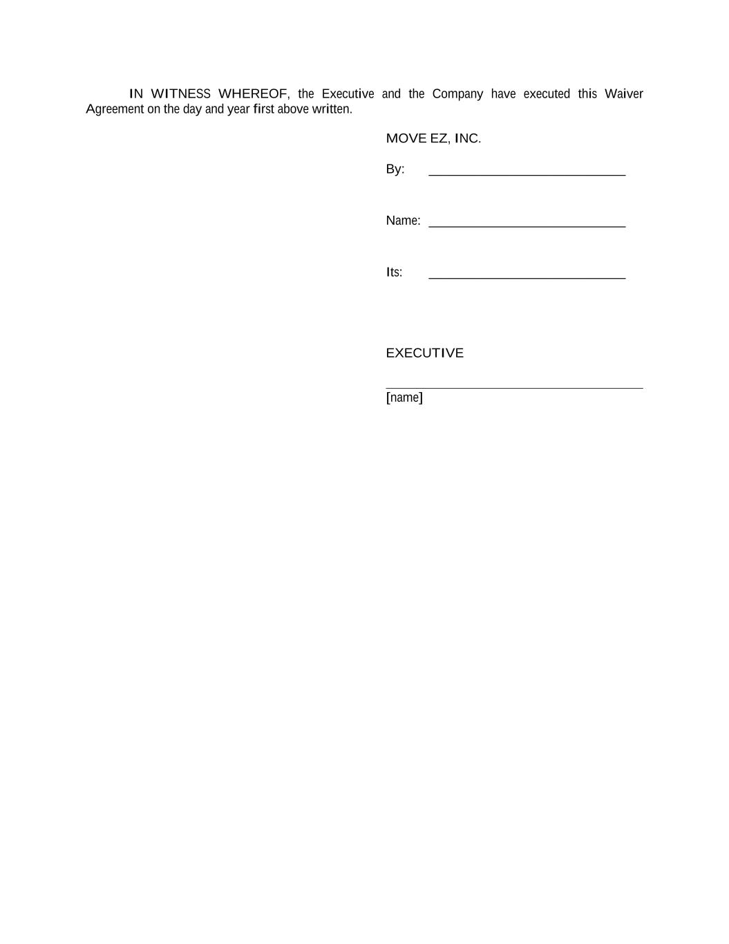 IN WITNESS WHEREOF, the Executive and the Company have executed this Waiver Agreement on the day and year first above written. MOVE EZ, INC. By: ______________________________ Name: ______________________________ Its: ______________________________ EXECUTIVE [name]