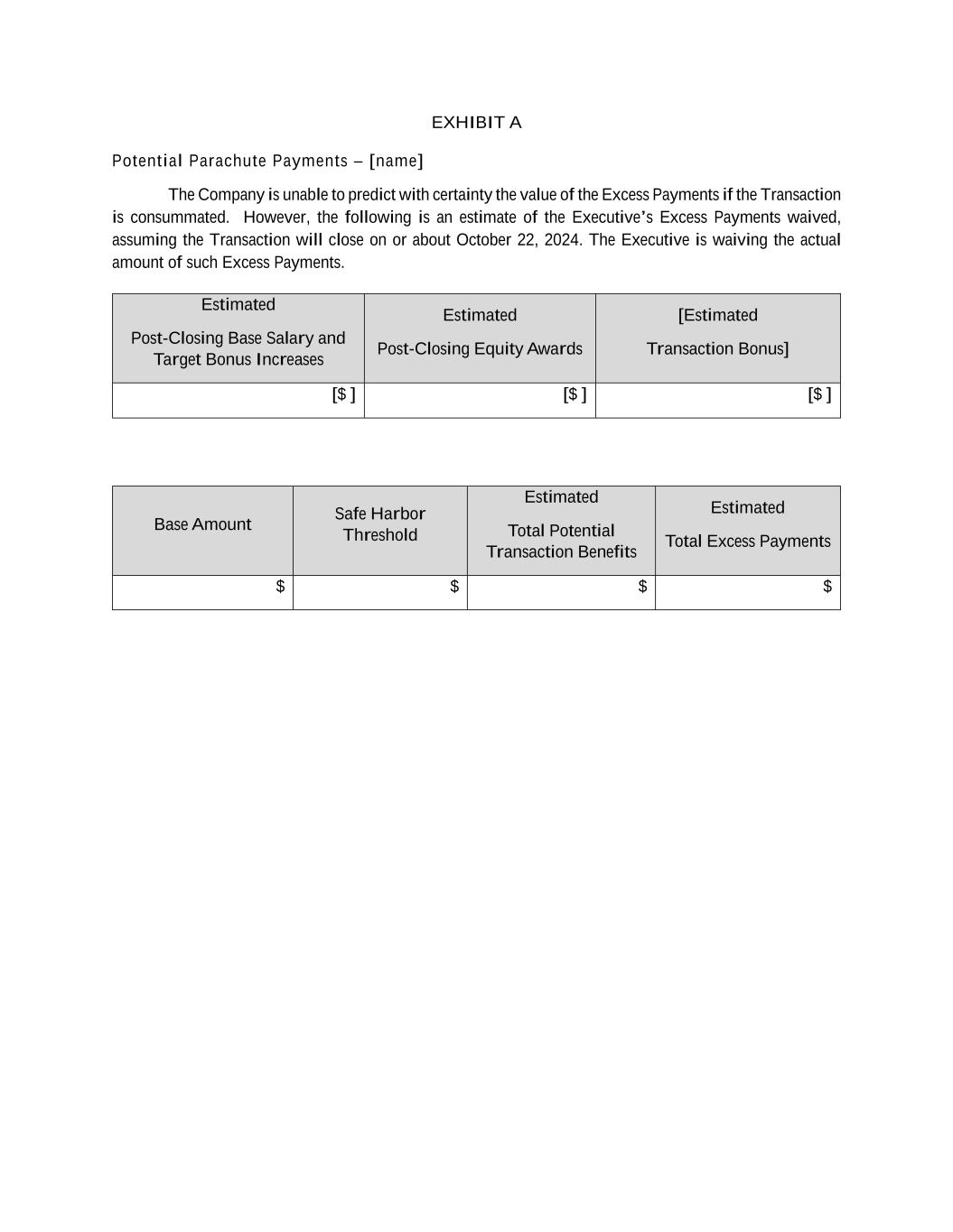 EXHIBIT A Potential Parachute Payments – [name] The Company is unable to predict with certainty the value of the Excess Payments if the Transaction is consummated. However, the following is an estimate of the Executive’s Excess Payments waived, assuming the Transaction will close on or about October 22, 2024. The Executive is waiving the actual amount of such Excess Payments. Estimated Post-Closing Base Salary and Target Bonus Increases Estimated Post-Closing Equity Awards [Estimated Transaction Bonus] [$ ] [$ ] [$ ] Base Amount Safe Harbor Threshold Estimated Total Potential Transaction Benefits Estimated Total Excess Payments $ $ $ $