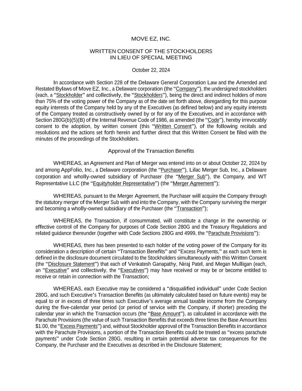 MOVE EZ, INC. WRITTEN CONSENT OF THE STOCKHOLDERS IN LIEU OF SPECIAL MEETING October 22, 2024 In accordance with Section 228 of the Delaware General Corporation Law and the Amended and Restated Bylaws of Move EZ, Inc., a Delaware corporation (the “Company”), the undersigned stockholders (each, a “Stockholder” and collectively, the “Stockholders”), being the direct and indirect holders of more than 75% of the voting power of the Company as of the date set forth above, disregarding for this purpose equity interests of the Company held by any of the Executives (as defined below) and any equity interests of the Company treated as constructively owned by or for any of the Executives, and in accordance with Section 280G(b)(5)(B) of the Internal Revenue Code of 1986, as amended (the “Code”), hereby irrevocably consent to the adoption, by written consent (this “Written Consent”), of the following recitals and resolutions and the actions set forth herein and further direct that this Written Consent be filed with the minutes of the proceedings of the Stockholders. Approval of the Transaction Benefits WHEREAS, an Agreement and Plan of Merger was entered into on or about October 22, 2024 by and among AppFolio, Inc., a Delaware corporation (the “Purchaser”), Lilac Merger Sub, Inc., a Delaware corporation and wholly-owned subsidiary of Purchaser (the “Merger Sub”), the Company, and WT Representative LLC (the “Equityholder Representative”) (the “Merger Agreement”); WHEREAS, pursuant to the Merger Agreement, the Purchaser will acquire the Company through the statutory merger of the Merger Sub with and into the Company, with the Company surviving the merger and becoming a wholly-owned subsidiary of the Purchaser (the “Transaction”); WHEREAS, the Transaction, if consummated, will constitute a change in the ownership or effective control of the Company for purposes of Code Section 280G and the Treasury Regulations and related guidance thereunder (together with Code Sections 280G and 4999, the “Parachute Provisions”); WHEREAS, there has been presented to each holder of the voting power of the Company for its consideration a description of certain “Transaction Benefits” and “Excess Payments,” as each such term is defined in the disclosure document circulated to the Stockholders simultaneously with this Written Consent (the “Disclosure Statement”) that each of Venkatesh Ganapathy, Niraj Patel, and Megan Mulligan (each, an “Executive” and collectively, the “Executives”) may have received or may be or become entitled to receive or retain in connection with the Transaction; WHEREAS, each Executive may be considered a “disqualified individual” under Code Section 280G, and such Executive’s Transaction Benefits (as ultimately calculated based on future events) may be equal to or in excess of three times such Executive’s average annual taxable income from the Company during the five-calendar year period (or period of service with the Company, if shorter) preceding the calendar year in which the Transaction occurs (the “Base Amount”), as calculated in accordance with the Parachute Provisions (the value of such Transaction Benefits that exceeds three times the Base Amount less $1.00, the “Excess Payments”) and, without Stockholder approval of the Transaction Benefits in accordance with the Parachute Provisions, a portion of the Transaction Benefits could be treated as “excess parachute payments” under Code Section 280G, resulting in certain potential adverse tax consequences for the Company, the Purchaser and the Executives as described in the Disclosure Statement;