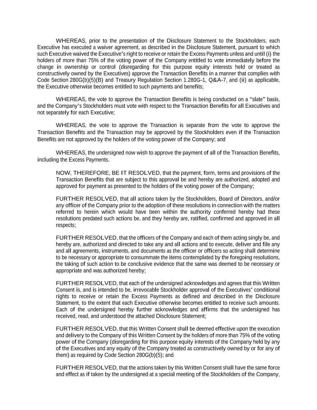 WHEREAS, prior to the presentation of the Disclosure Statement to the Stockholders, each Executive has executed a waiver agreement, as described in the Disclosure Statement, pursuant to which such Executive waived the Executive’s right to receive or retain the Excess Payments unless and until (i) the holders of more than 75% of the voting power of the Company entitled to vote immediately before the change in ownership or control (disregarding for this purpose equity interests held or treated as constructively owned by the Executives) approve the Transaction Benefits in a manner that complies with Code Section 280G(b)(5)(B) and Treasury Regulation Section 1.280G-1, Q&A-7, and (ii) as applicable, the Executive otherwise becomes entitled to such payments and benefits; WHEREAS, the vote to approve the Transaction Benefits is being conducted on a “slate” basis, and the Company’s Stockholders must vote with respect to the Transaction Benefits for all Executives and not separately for each Executive; WHEREAS, the vote to approve the Transaction is separate from the vote to approve the Transaction Benefits and the Transaction may be approved by the Stockholders even if the Transaction Benefits are not approved by the holders of the voting power of the Company; and WHEREAS, the undersigned now wish to approve the payment of all of the Transaction Benefits, including the Excess Payments. NOW, THEREFORE, BE IT RESOLVED, that the payment, form, terms and provisions of the Transaction Benefits that are subject to this approval be and hereby are authorized, adopted and approved for payment as presented to the holders of the voting power of the Company; FURTHER RESOLVED, that all actions taken by the Stockholders, Board of Directors, and/or any officer of the Company prior to the adoption of these resolutions in connection with the matters referred to herein which would have been within the authority conferred hereby had these resolutions predated such actions be, and they hereby are, ratified, confirmed and approved in all respects; FURTHER RESOLVED, that the officers of the Company and each of them acting singly be, and hereby are, authorized and directed to take any and all actions and to execute, deliver and file any and all agreements, instruments, and documents as the officer or officers so acting shall determine to be necessary or appropriate to consummate the items contemplated by the foregoing resolutions, the taking of such action to be conclusive evidence that the same was deemed to be necessary or appropriate and was authorized hereby; FURTHER RESOLVED, that each of the undersigned acknowledges and agrees that this Written Consent is, and is intended to be, irrevocable Stockholder approval of the Executives’ conditional rights to receive or retain the Excess Payments as defined and described in the Disclosure Statement, to the extent that each Executive otherwise becomes entitled to receive such amounts. Each of the undersigned hereby further acknowledges and affirms that the undersigned has received, read, and understood the attached Disclosure Statement; FURTHER RESOLVED, that this Written Consent shall be deemed effective upon the execution and delivery to the Company of this Written Consent by the holders of more than 75% of the voting power of the Company (disregarding for this purpose equity interests of the Company held by any of the Executives and any equity of the Company treated as constructively owned by or for any of them) as required by Code Section 280G(b)(5); and FURTHER RESOLVED, that the actions taken by this Written Consent shall have the same force and effect as if taken by the undersigned at a special meeting of the Stockholders of the Company,