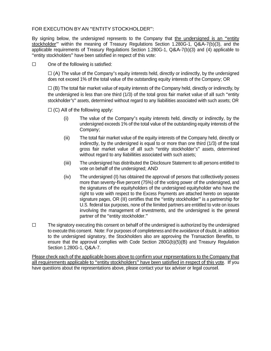 FOR EXECUTION BY AN “ENTITY STOCKHOLDER”: By signing below, the undersigned represents to the Company that the undersigned is an “entity stockholder” within the meaning of Treasury Regulations Section 1.280G-1, Q&A-7(b)(3), and the applicable requirements of Treasury Regulations Section 1.280G-1, Q&A-7(b)(3) and (4) applicable to “entity stockholders” have been satisfied in respect of this vote: ☐ One of the following is satisfied: ☐ (A) The value of the Company’s equity interests held, directly or indirectly, by the undersigned does not exceed 1% of the total value of the outstanding equity interests of the Company; OR ☐ (B) The total fair market value of equity interests of the Company held, directly or indirectly, by the undersigned is less than one third (1/3) of the total gross fair market value of all such “entity stockholder’s” assets, determined without regard to any liabilities associated with such assets; OR ☐ (C) All of the following apply: (i) The value of the Company’s equity interests held, directly or indirectly, by the undersigned exceeds 1% of the total value of the outstanding equity interests of the Company; (ii) The total fair market value of the equity interests of the Company held, directly or indirectly, by the undersigned is equal to or more than one third (1/3) of the total gross fair market value of all such “entity stockholder’s” assets, determined without regard to any liabilities associated with such assets; (iii) The undersigned has distributed the Disclosure Statement to all persons entitled to vote on behalf of the undersigned; AND (iv) The undersigned (I) has obtained the approval of persons that collectively possess more than seventy-five percent (75%) of the voting power of the undersigned, and the signatures of the equityholders of the undersigned equityholder who have the right to vote with respect to the Excess Payments are attached hereto on separate signature pages, OR (II) certifies that the “entity stockholder” is a partnership for U.S. federal tax purposes, none of the limited partners are entitled to vote on issues involving the management of investments, and the undersigned is the general partner of the “entity stockholder.” ☐ The signatory executing this consent on behalf of the undersigned is authorized by the undersigned to execute this consent. Note: For purposes of completeness and the avoidance of doubt, in addition to the undersigned signatory, the Stockholders also are approving the Transaction Benefits, to ensure that the approval complies with Code Section 280G(b)(5)(B) and Treasury Regulation Section 1.280G-1, Q&A-7. Please check each of the applicable boxes above to confirm your representations to the Company that all requirements applicable to “entity stockholders” have been satisfied in respect of this vote. If you have questions about the representations above, please contact your tax adviser or legal counsel.