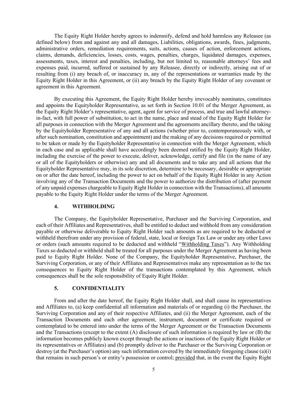 5 The Equity Right Holder hereby agrees to indemnify, defend and hold harmless any Releasee (as defined below) from and against any and all damages, Liabilities, obligations, awards, fines, judgments, administrative orders, remediation requirements, suits, actions, causes of action, enforcement actions, claims, demands, deficiencies, losses, costs, wages, penalties, charges, liquidated damages, expenses, assessments, taxes, interest and penalties, including, but not limited to, reasonable attorneys’ fees and expenses paid, incurred, suffered or sustained by any Releasee, directly or indirectly, arising out of or resulting from (i) any breach of, or inaccuracy in, any of the representations or warranties made by the Equity Right Holder in this Agreement, or (ii) any breach by the Equity Right Holder of any covenant or agreement in this Agreement. By executing this Agreement, the Equity Right Holder hereby irrevocably nominates, constitutes and appoints the Equityholder Representative, as set forth in Section 10.01 of the Merger Agreement, as the Equity Right Holder’s representative, agent, agent for service of process, and true and lawful attorney- in-fact, with full power of substitution, to act in the name, place and stead of the Equity Right Holder for all purposes in connection with the Merger Agreement and the agreements ancillary thereto, and the taking by the Equityholder Representative of any and all actions (whether prior to, contemporaneously with, or after such nomination, constitution and appointment) and the making of any decisions required or permitted to be taken or made by the Equityholder Representative in connection with the Merger Agreement, which in each case and as applicable shall have accordingly been deemed ratified by the Equity Right Holder, including the exercise of the power to execute, deliver, acknowledge, certify and file (in the name of any or all of the Equityholders or otherwise) any and all documents and to take any and all actions that the Equityholder Representative may, in its sole discretion, determine to be necessary, desirable or appropriate on or after the date hereof, including the power to act on behalf of the Equity Right Holder in any Action involving any of the Transaction Documents and the power to authorize the distribution of (after payment of any unpaid expenses chargeable to Equity Right Holder in connection with the Transactions), all amounts payable to the Equity Right Holder under the terms of the Merger Agreement. 4. WITHHOLDING The Company, the Equityholder Representative, Purchaser and the Surviving Corporation, and each of their Affiliates and Representatives, shall be entitled to deduct and withhold from any consideration payable or otherwise deliverable to Equity Right Holder such amounts as are required to be deducted or withheld therefrom under any provision of federal, state, local or foreign Tax Law or under any other Laws or orders (such amounts required to be deducted and withheld “Withholding Taxes”). Any Withholding Taxes so deducted or withheld shall be treated for all purposes under the Merger Agreement as having been paid to Equity Right Holder. None of the Company, the Equityholder Representative, Purchaser, the Surviving Corporation, or any of their Affiliates and Representatives make any representation as to the tax consequences to Equity Right Holder of the transactions contemplated by this Agreement, which consequences shall be the sole responsibility of Equity Right Holder. 5. CONFIDENTIALITY From and after the date hereof, the Equity Right Holder shall, and shall cause its representatives and Affiliates to, (a) keep confidential all information and materials of or regarding (i) the Purchaser, the Surviving Corporation and any of their respective Affiliates, and (ii) the Merger Agreement, each of the Transaction Documents and each other agreement, instrument, document or certificate required or contemplated to be entered into under the terms of the Merger Agreement or the Transaction Documents and the Transactions (except to the extent (A) disclosure of such information is required by law or (B) the information becomes publicly known except through the actions or inactions of the Equity Right Holder or its representatives or Affiliates) and (b) promptly deliver to the Purchaser or the Surviving Corporation or destroy (at the Purchaser’s option) any such information covered by the immediately foregoing clause (a)(i) that remains in such person’s or entity’s possession or control; provided that, in the event the Equity Right