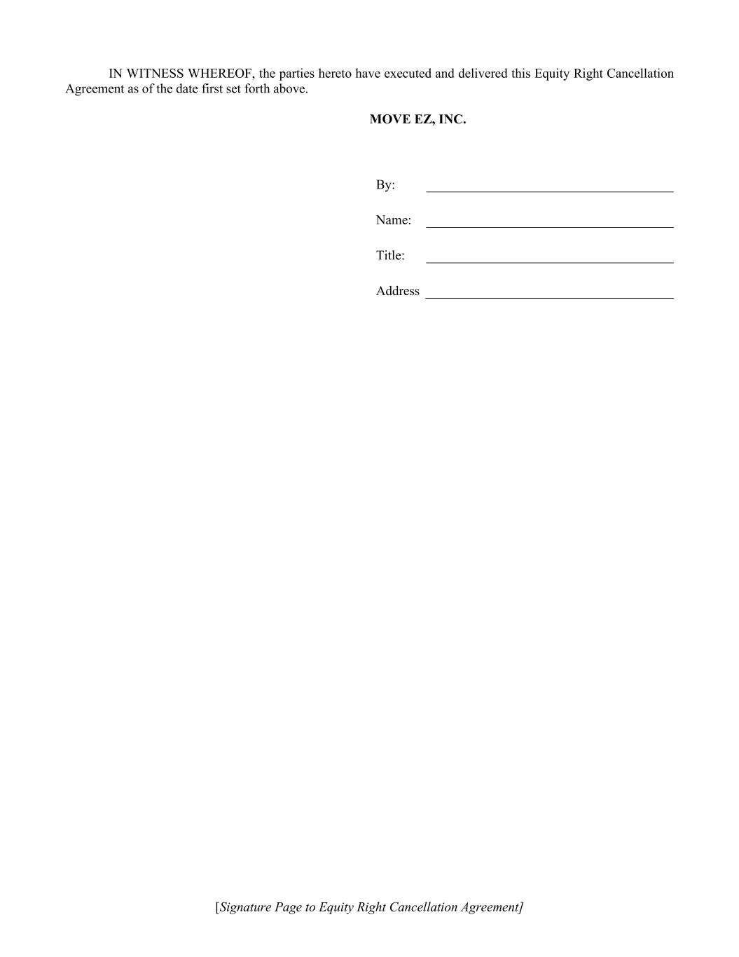 [Signature Page to Equity Right Cancellation Agreement] IN WITNESS WHEREOF, the parties hereto have executed and delivered this Equity Right Cancellation Agreement as of the date first set forth above. MOVE EZ, INC. By: Name: Title: Address